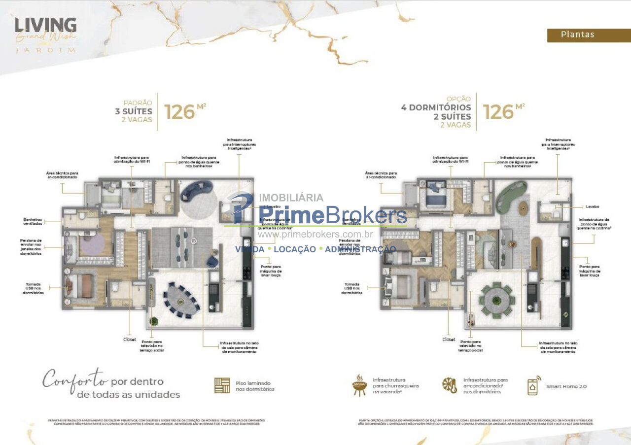 Entregue com piso nas suítes com conforto acústico, infraestrutura completa para instalação de ar-condicionado e churrasqueira, e tecnologia para interruptores inteligentes, tomadas usb e otimização da rede wi-fi.