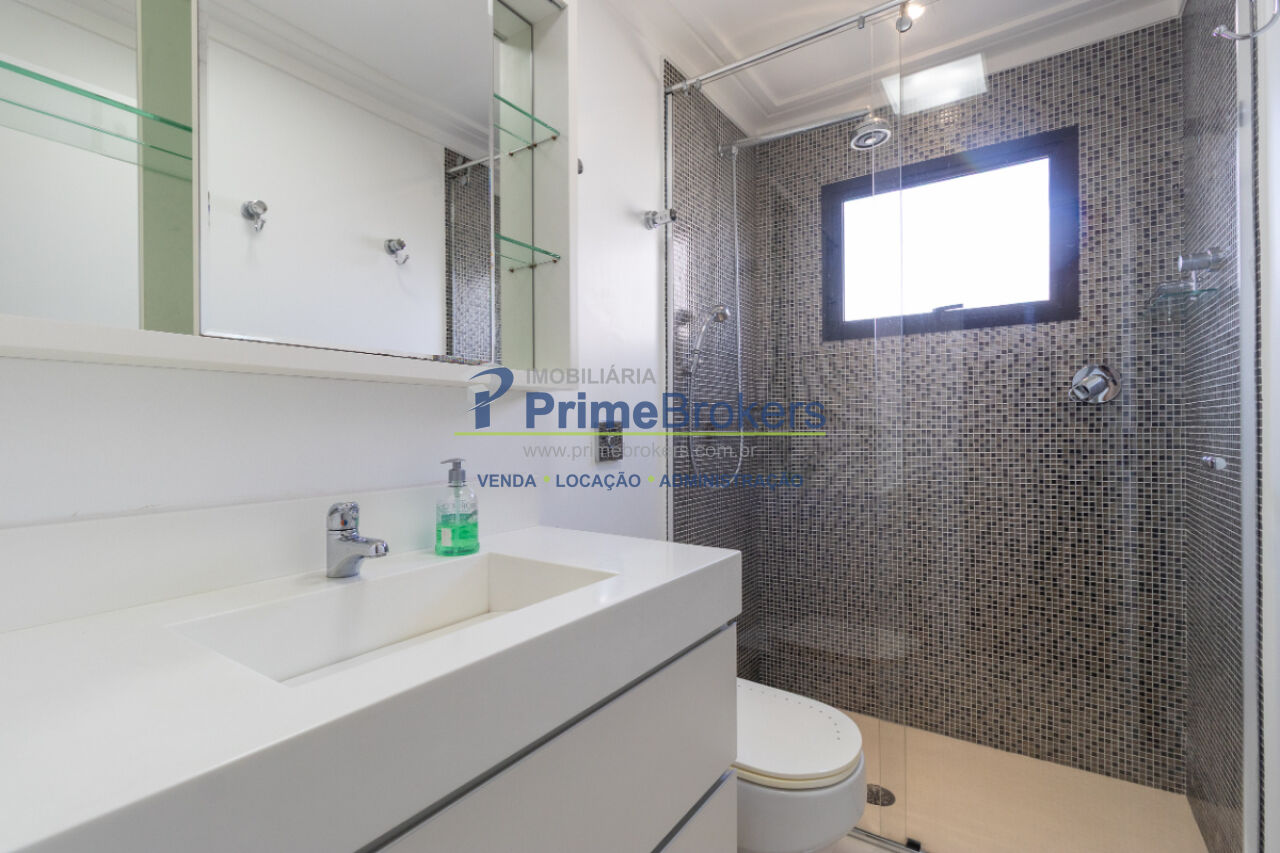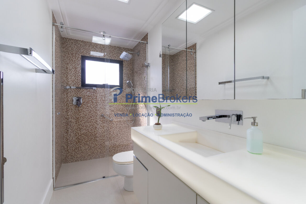 Banheiro da suíte com duchas Hansgrohe, metais Deca, pia em Corean DuPont com iluminação perimetral, box sob medida extra-alto, piso antiderrapante e iluminação interna