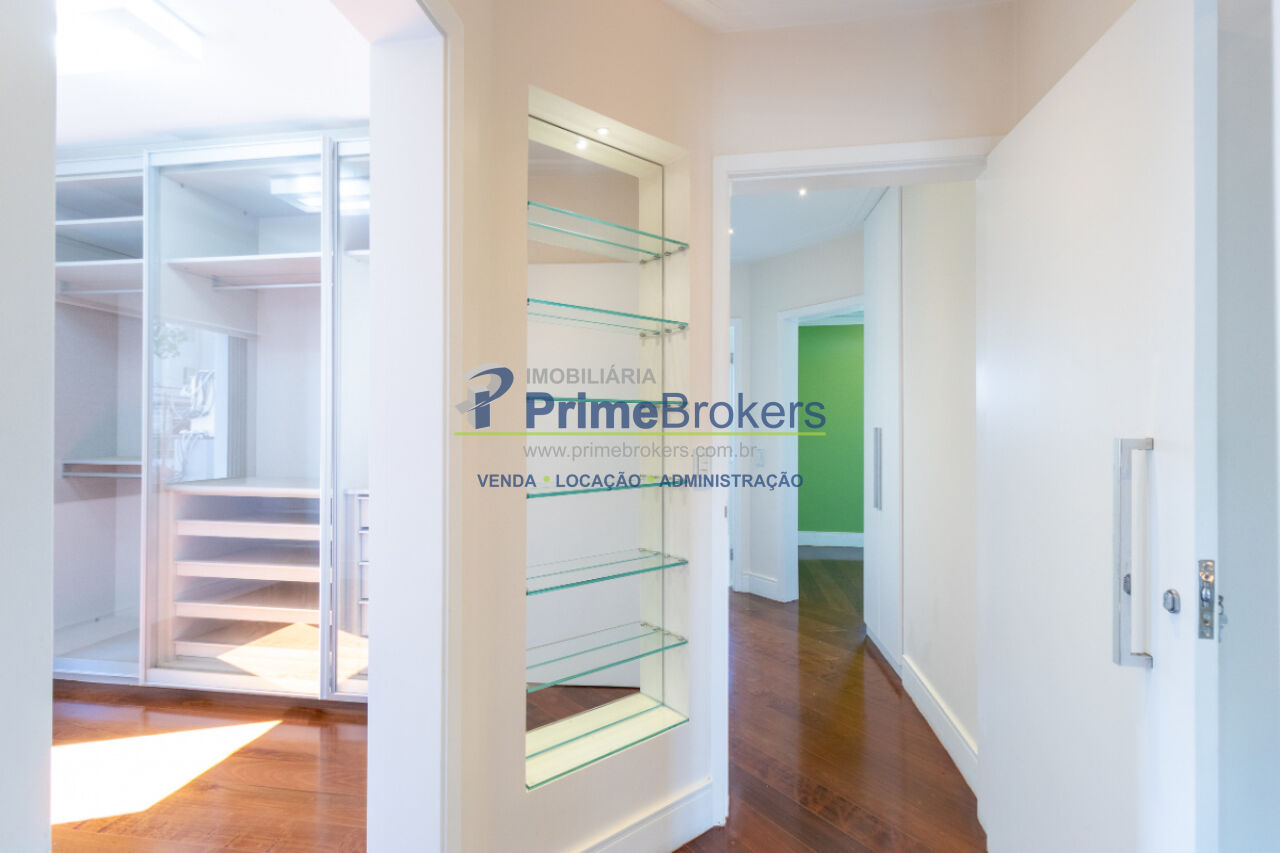 Closet com armários planejados, portas em vidro temperado, lustres e persianas do teto ao chão