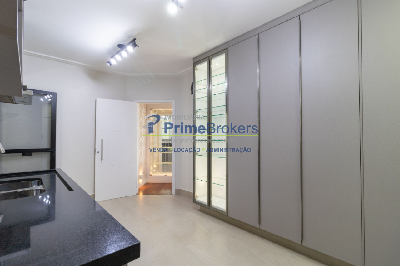 Cozinha planejada com armários até o teto, pia em granito com cuba dupla inox, torneiras quente/fria, água filtrada, cristaleira iluminada, depurador com exaustão externa e tomadas USB