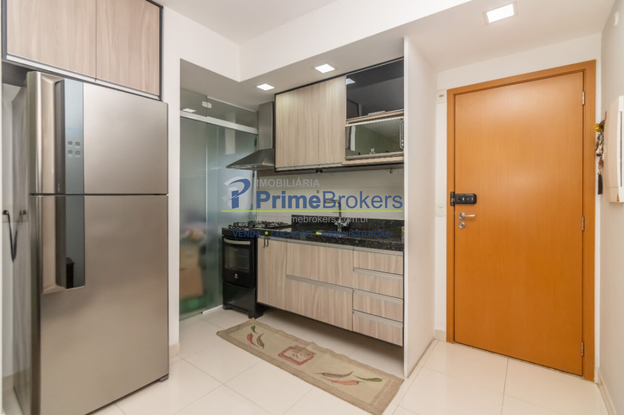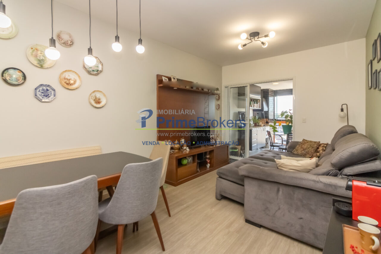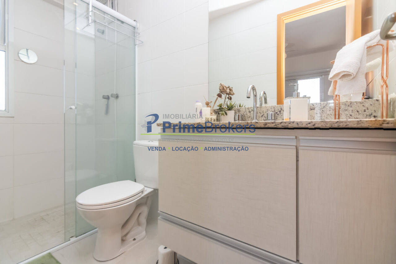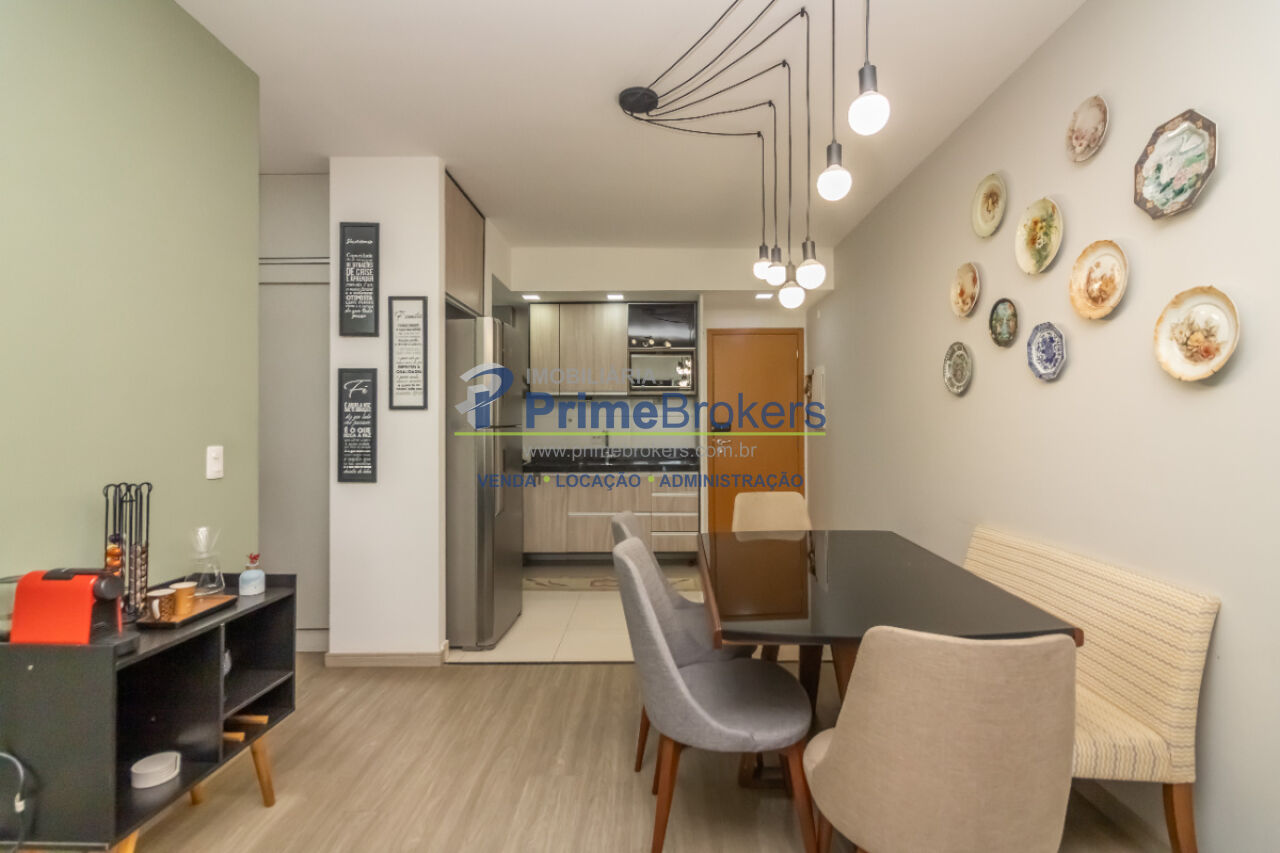 Possui 2 dormitórios, sendo 1 suíte, ambos com armários planejados, sala para 2 ambientes com piso vinílico, cozinha em conceito aberto com móveis sob medida, lavanderia planejada e banheiros com ventilação natural, box em vidro e gabinetes. Conta ainda com armários no corredor e 2 vagas de garagem.
