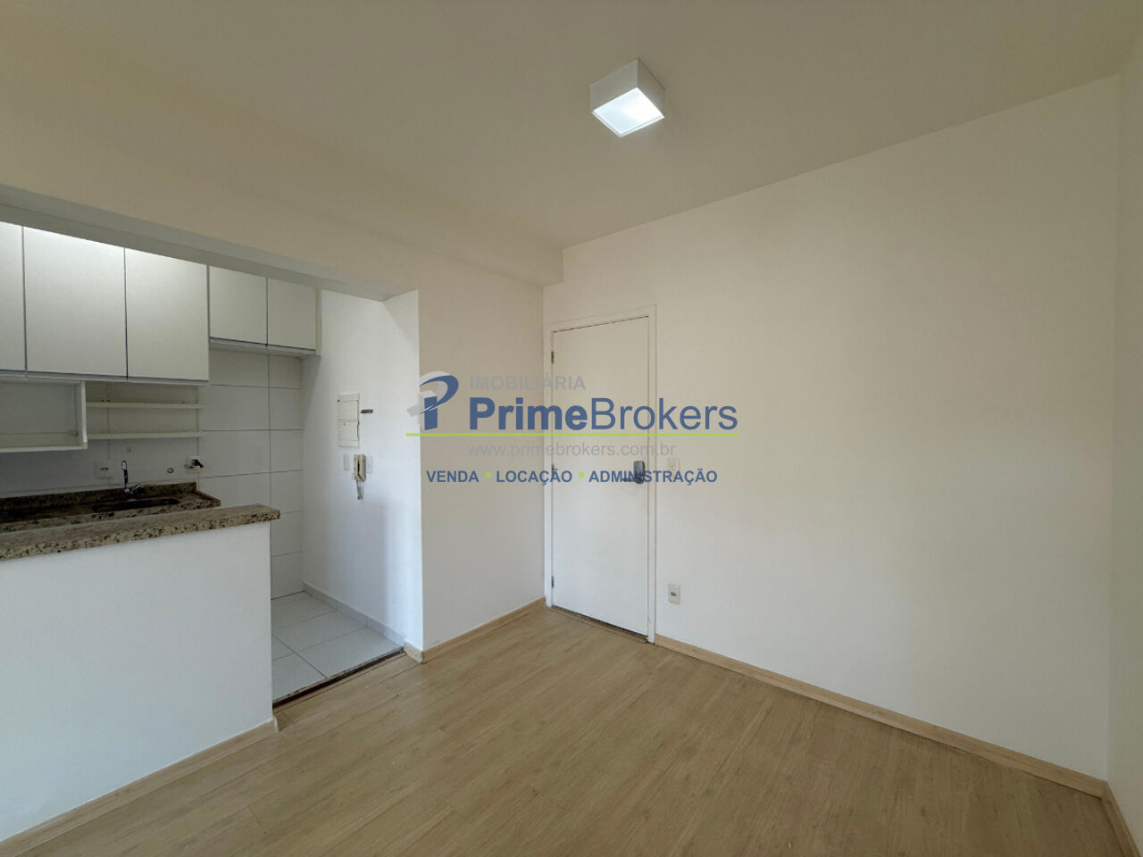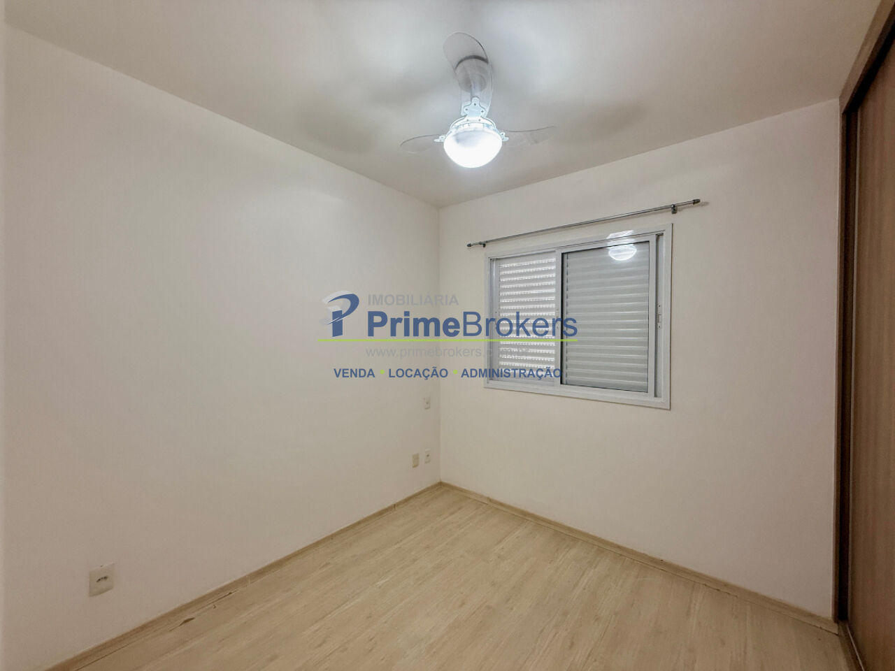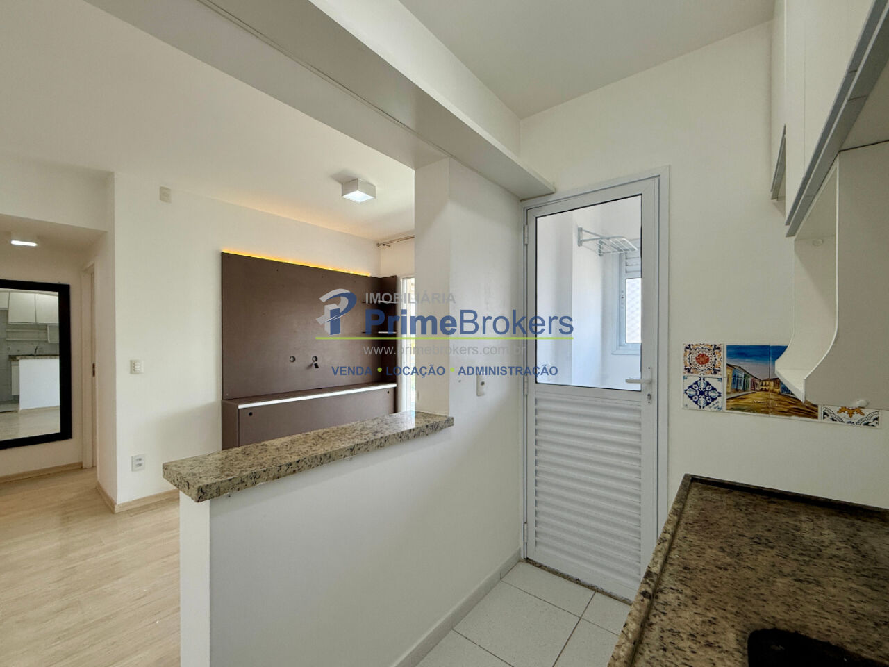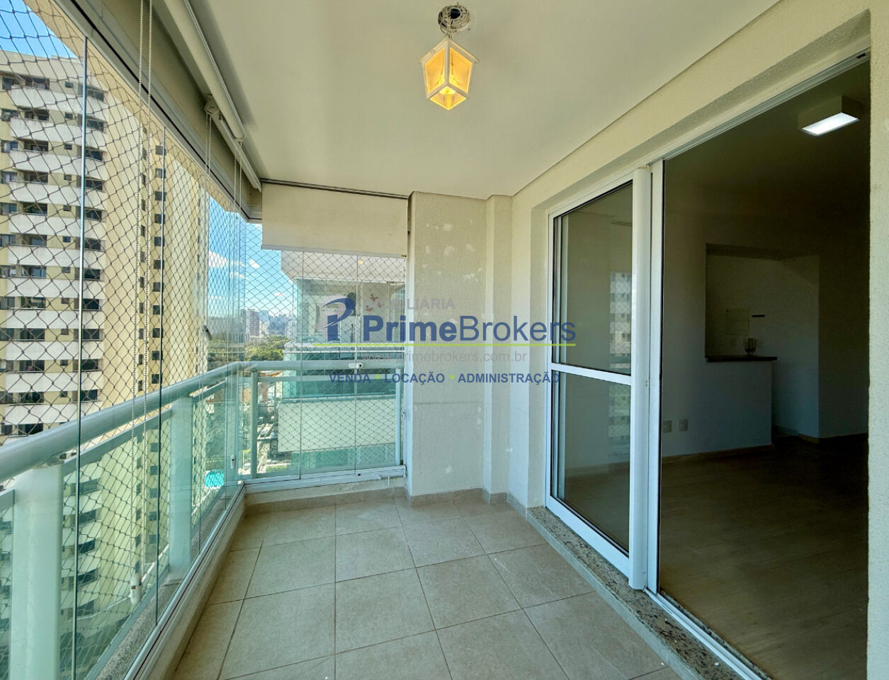 1 dormitório com armário e ventilador de teto, sala ampla para 2 ambientes com painel, varanda envidraçada com persianas, cozinha planejada com armários, área de serviço com armário, banheiro social com gabinete e box, 1 vaga coberta, piso laminado, interfone, alarme