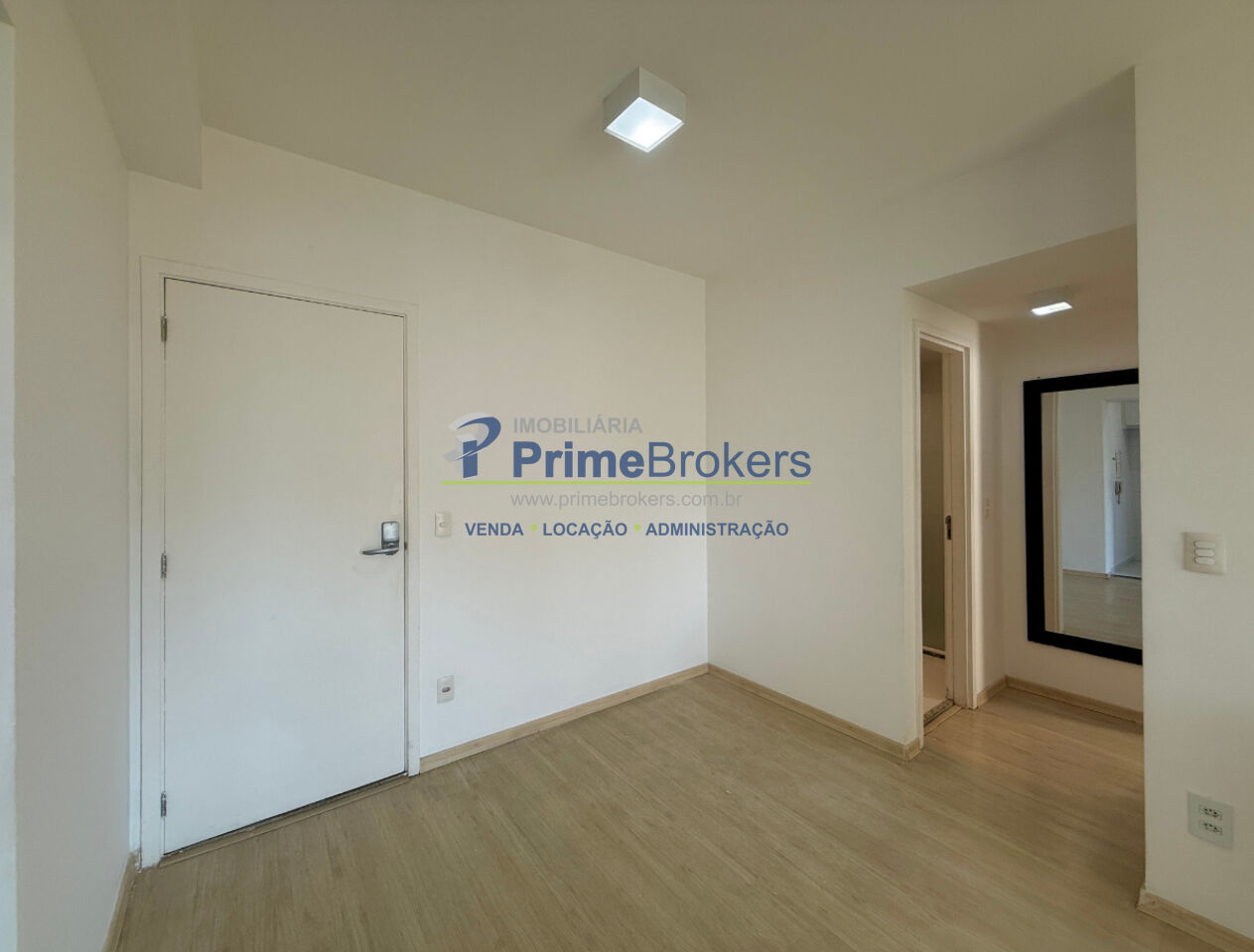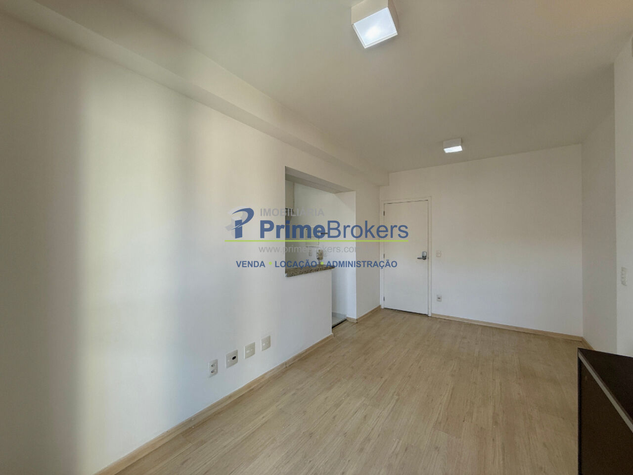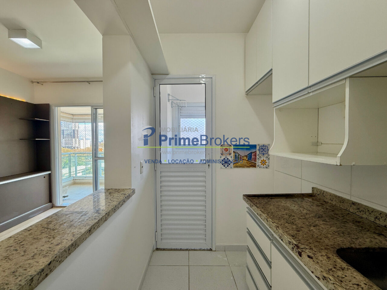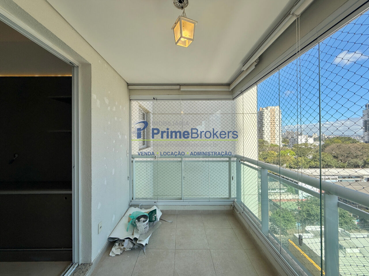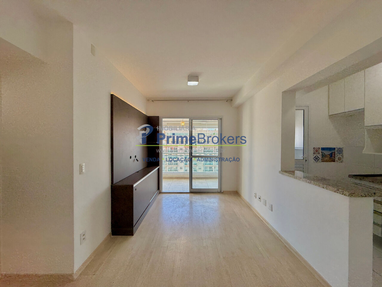 1 dormitório com armário e ventilador de teto, sala ampla para 2 ambientes com painel, varanda envidraçada com persianas, cozinha planejada com armários, área de serviço com armário, banheiro social com gabinete e box, 1 vaga coberta, piso laminado, interfone, alarme