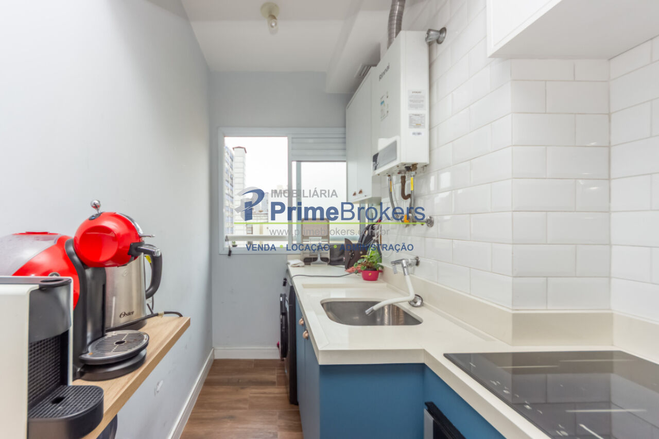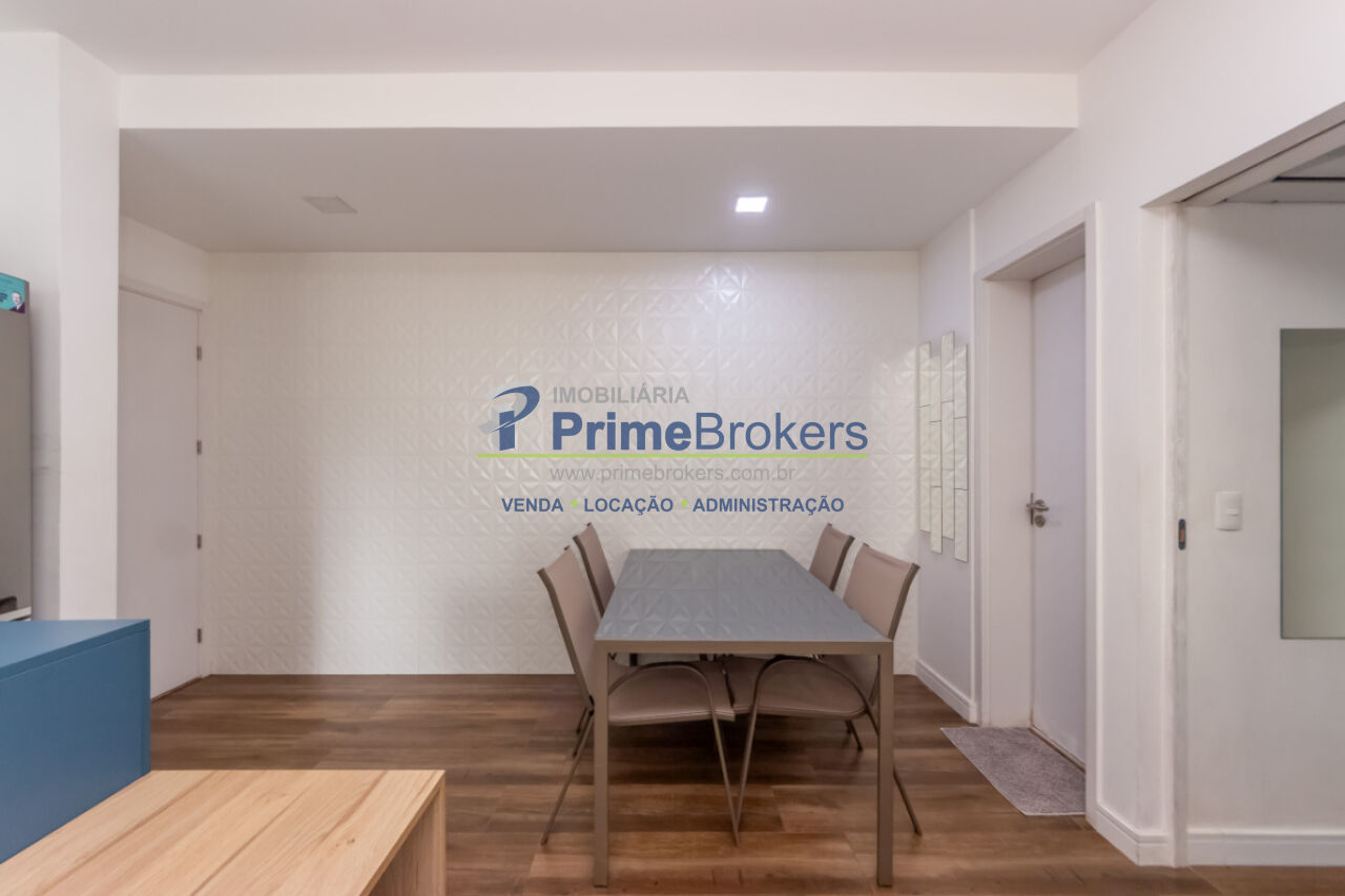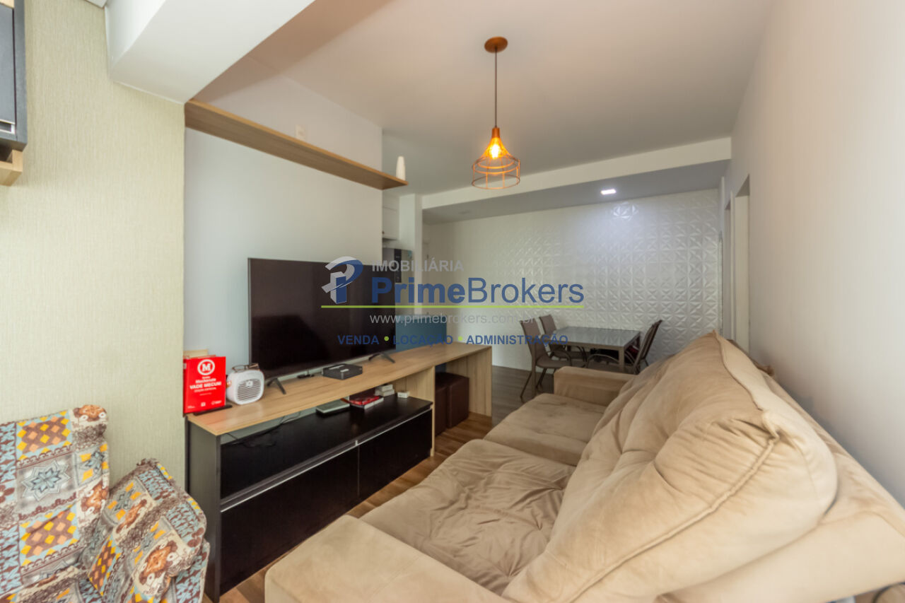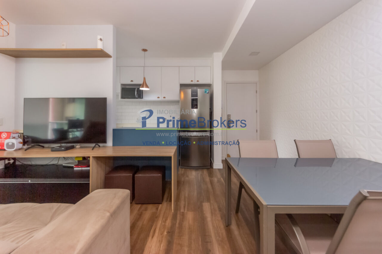 1 dormitório, 1 banheiro, 1 vaga de garagem, área útil de 46m², sacada com vista, cozinha integrada, sala de estar, sala de jantar, armários planejados, área de serviço