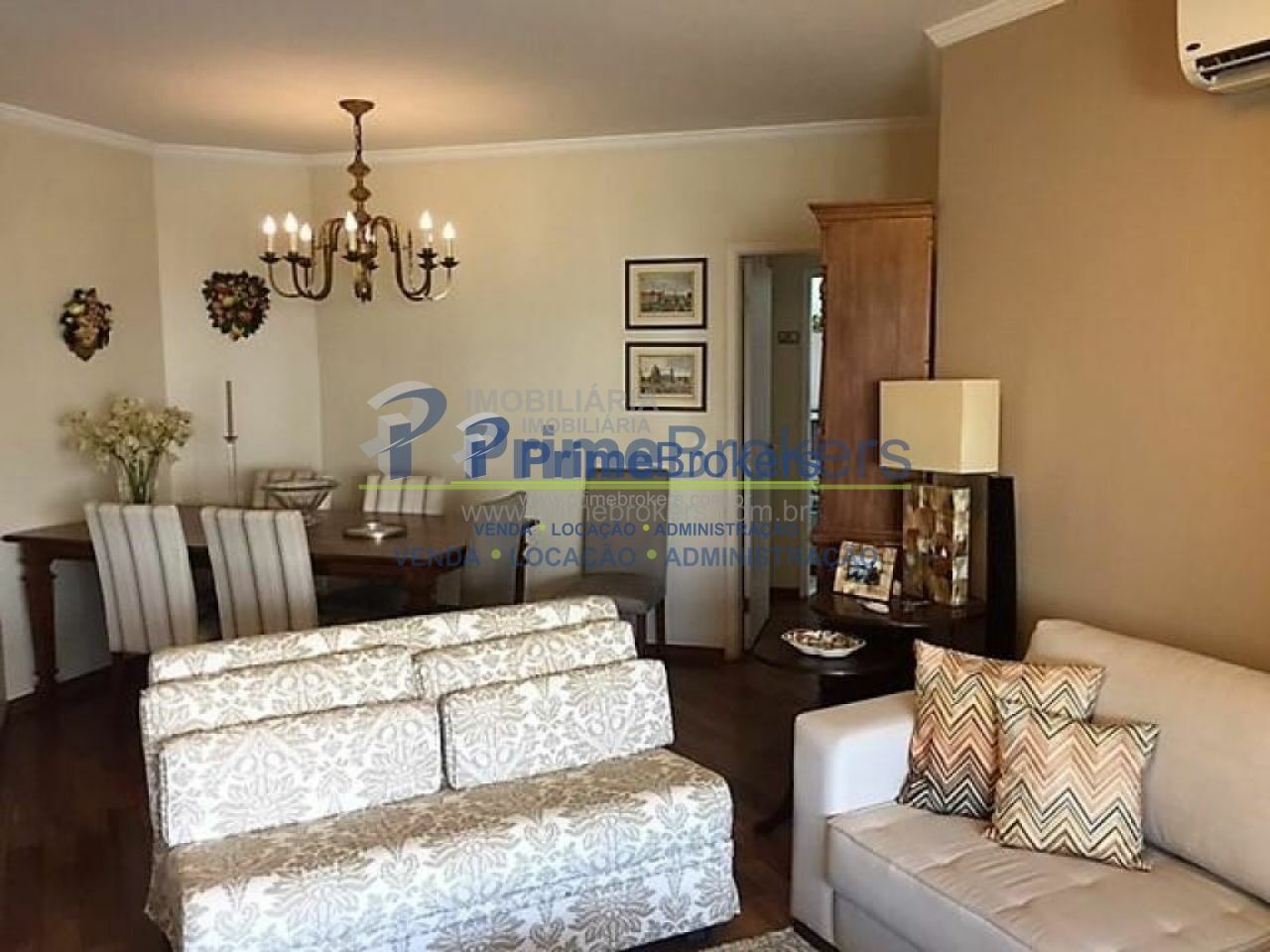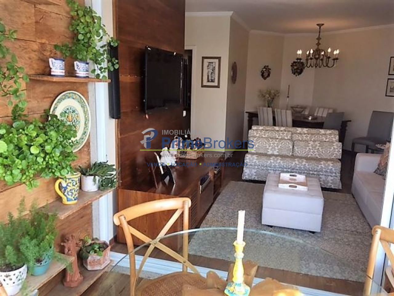 Varanda fechada com piso em madeira de demolição, integrada a sala. Ar condicionado na sala e na suite master.