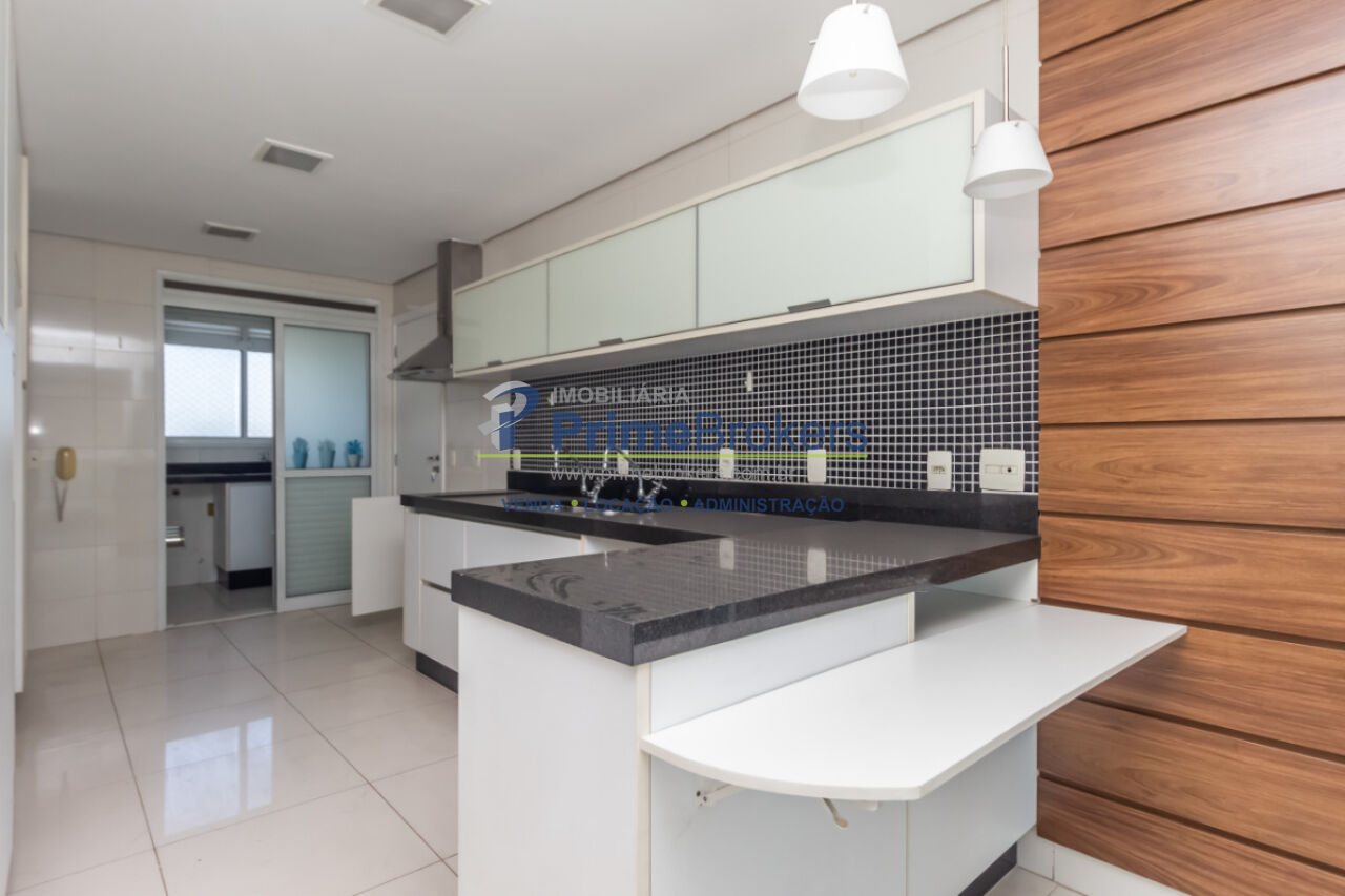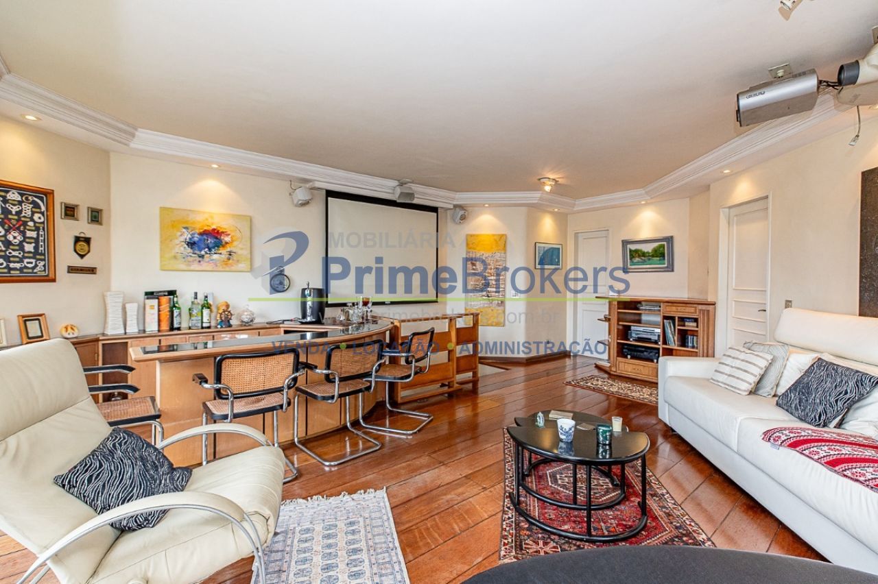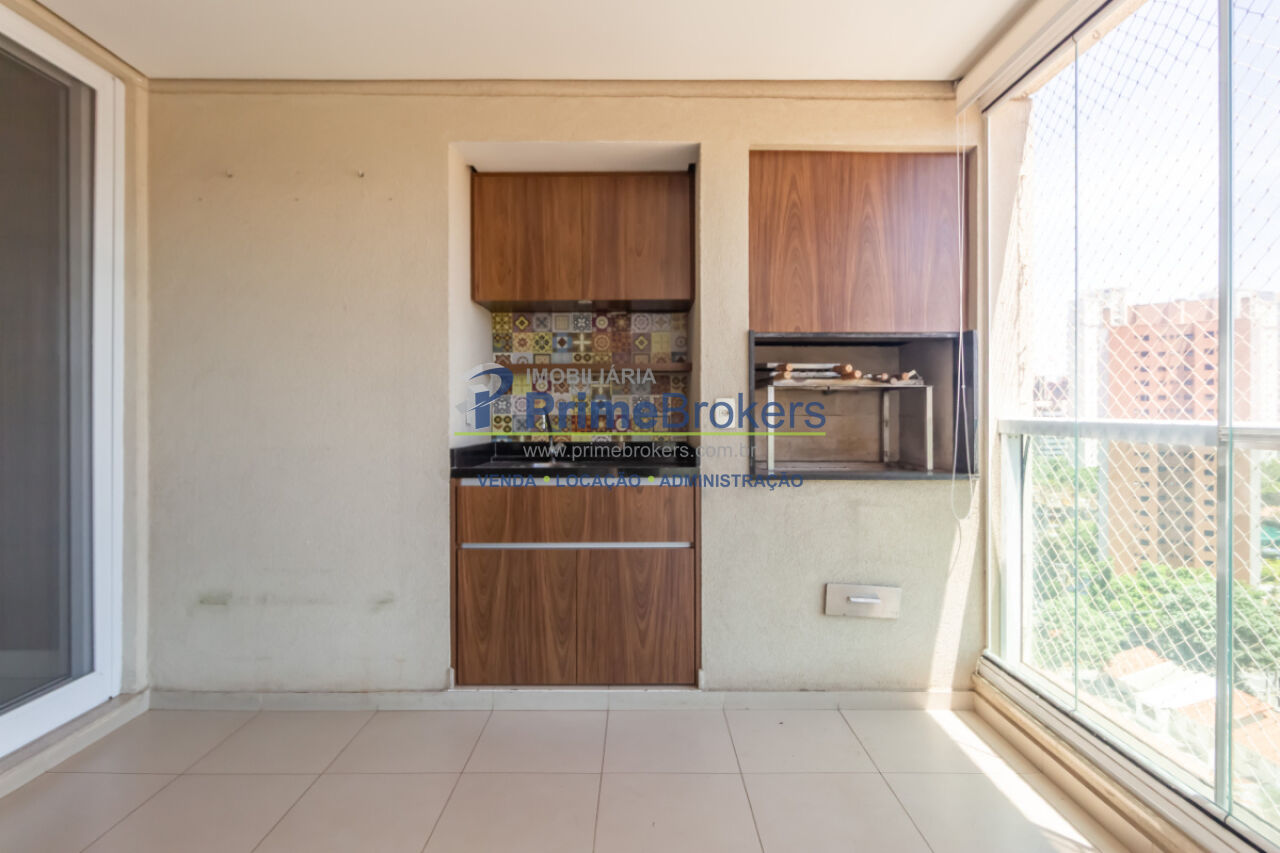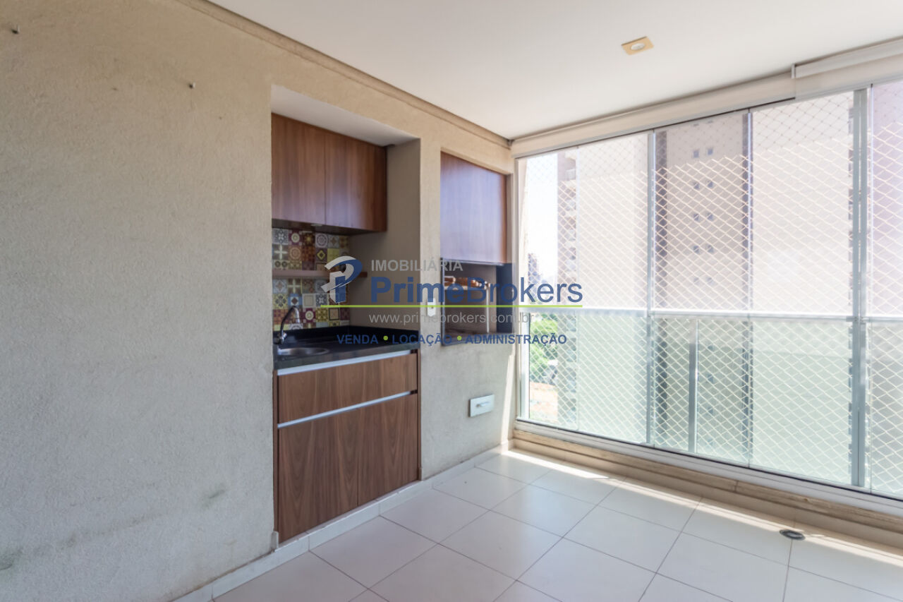 3 suítes amplas, varanda gourmet com churrasqueira, lavabo, sala de estar e jantar, cozinha com copa, dependências de serviço completas, móveis planejados de alto padrão, ar-condicionado central, piso de madeira e porcelanato, vista para cidade, 3 vagas de garagem, depósito privativo