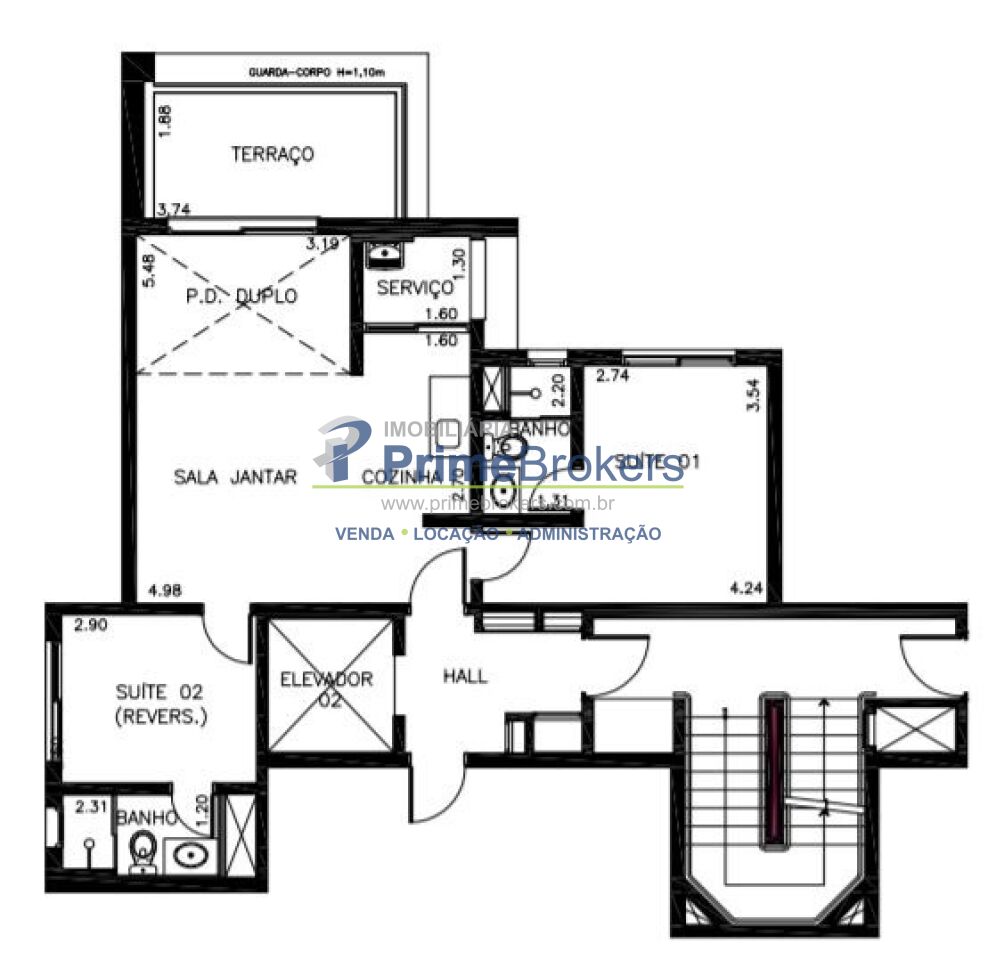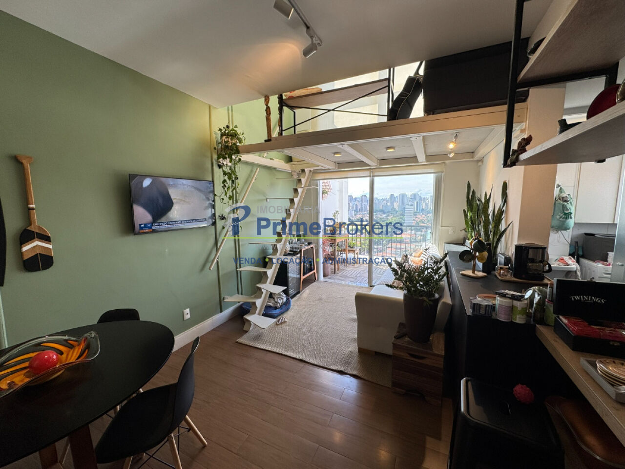 70m2 de área privativa, 2 suítes, pé direito duplo na sala com mezanino metálico.
