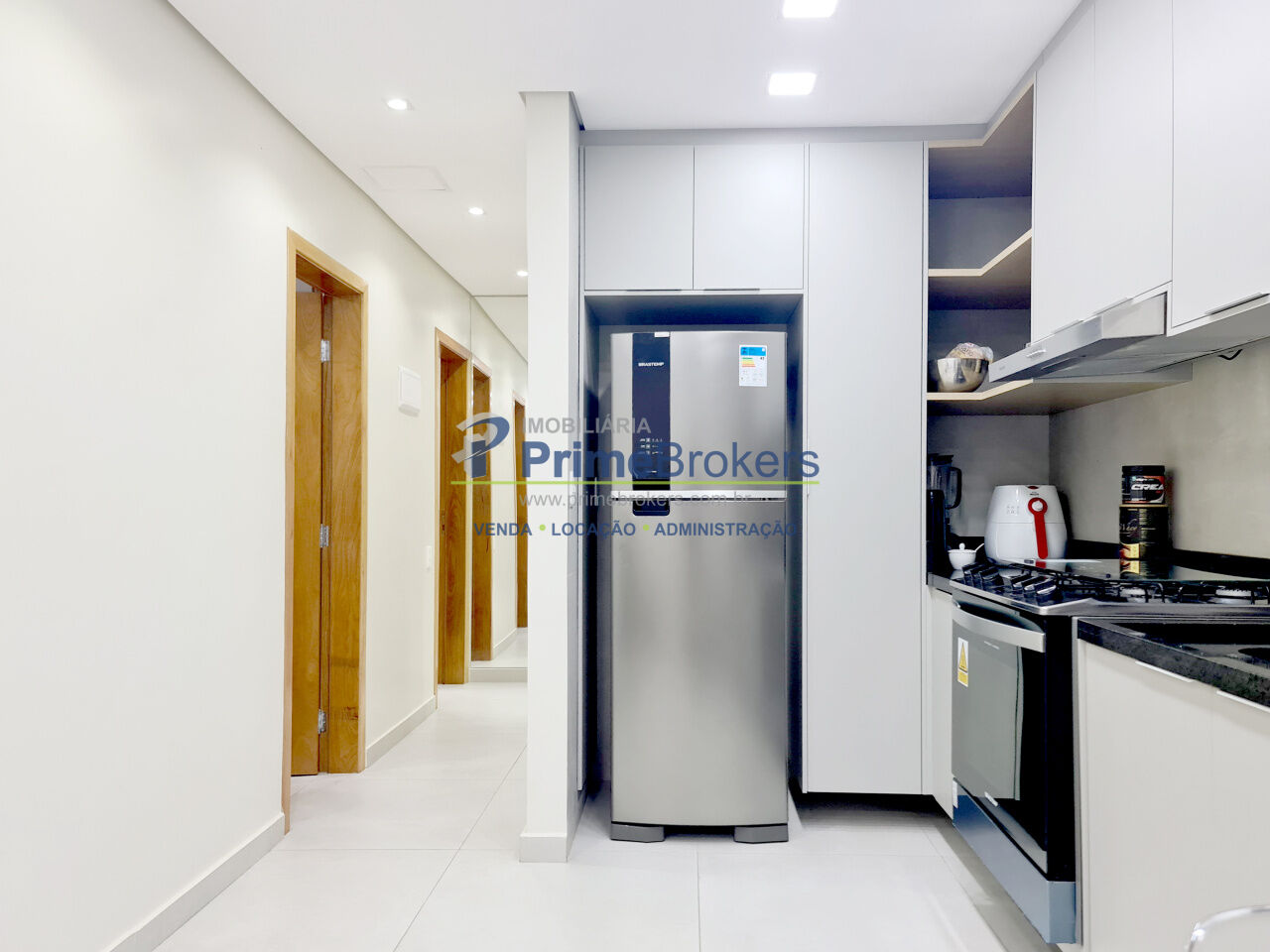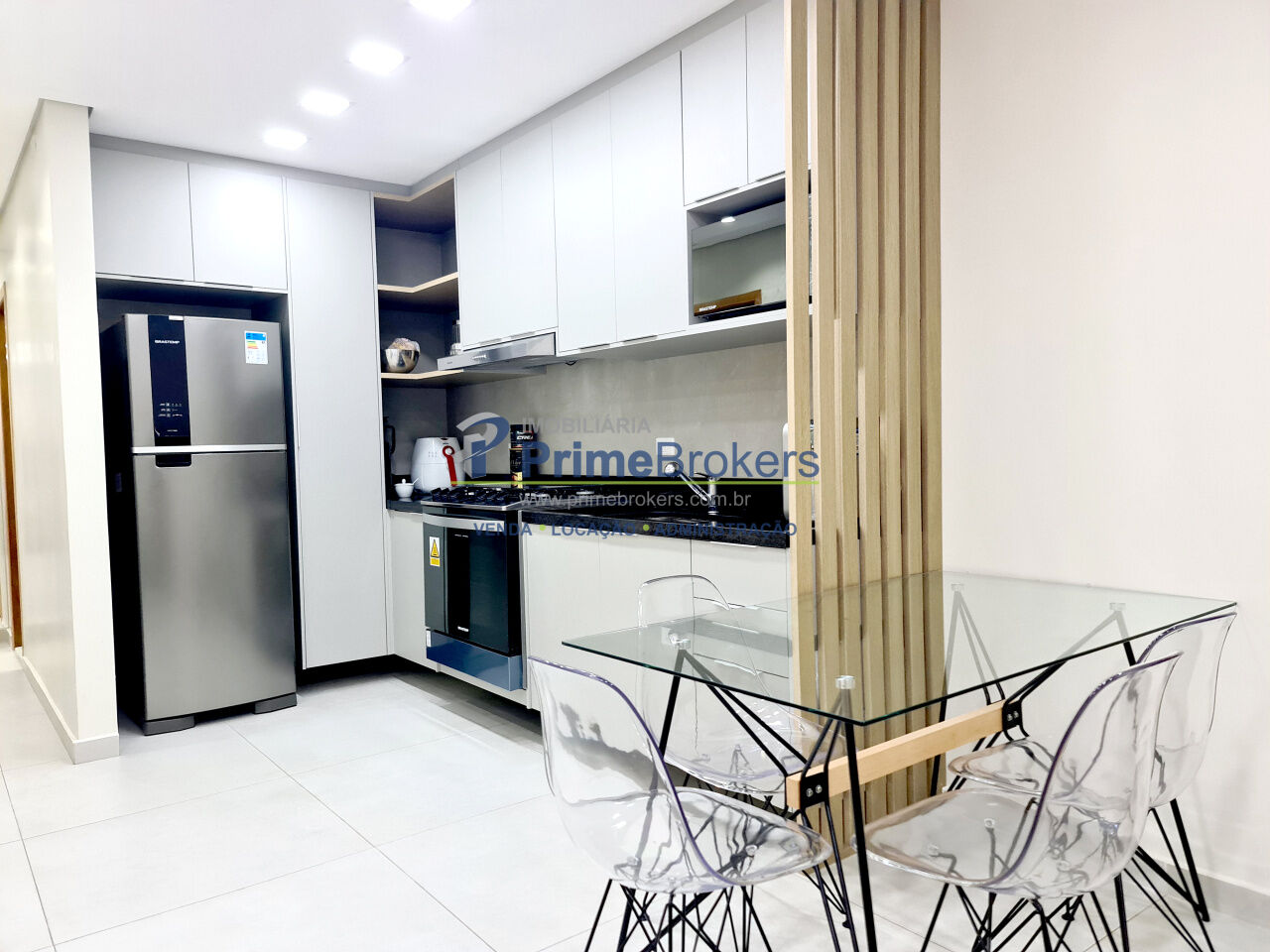 A cozinha planejada e equipada é integrada à sala de estar e jantar, proporcionando um ambiente amplo e confortável. A varanda foi incorporada ao living, o que amplia ainda mais o espaço e cria uma sensação de continuidade entre os ambientes.