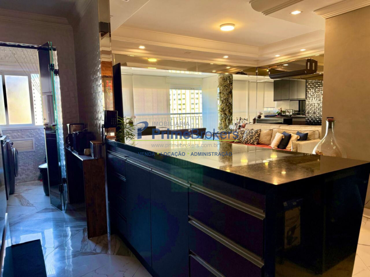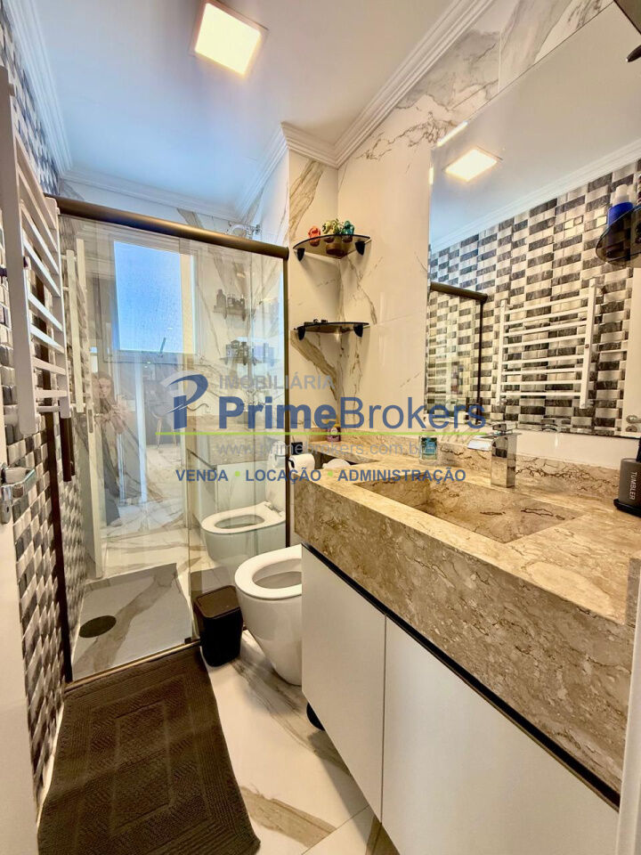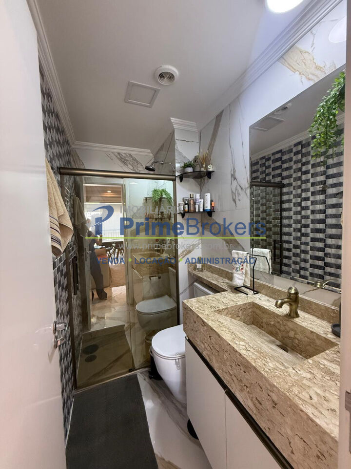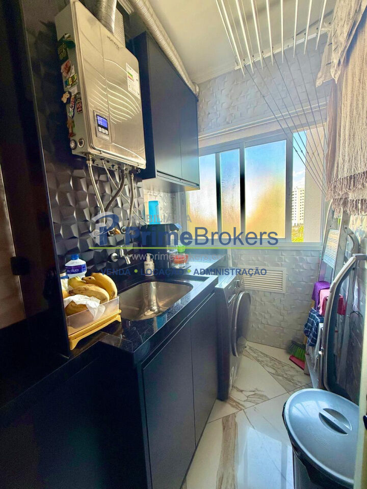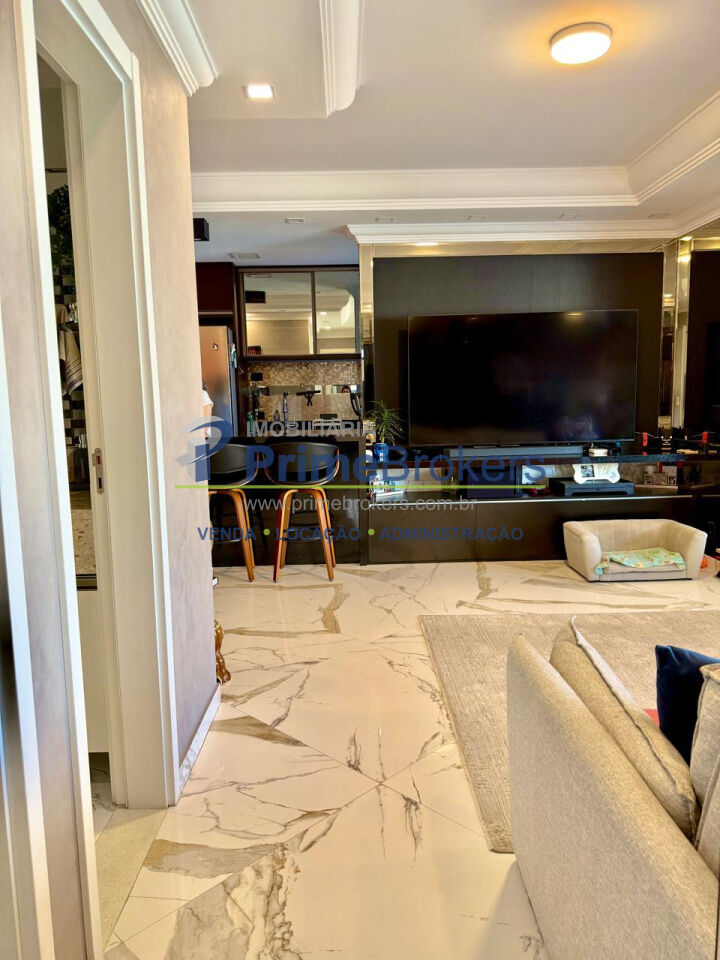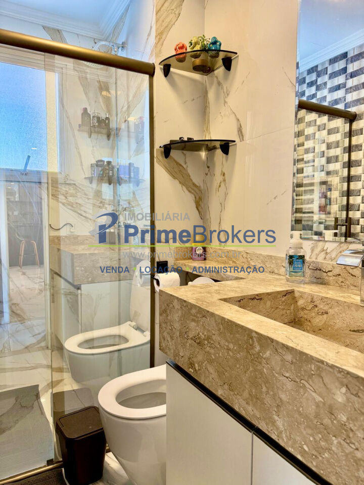 Sala ampla integrada à varanda gourmet, 2 vagas + depósito, cozinha integrada, móveis planejados, piso porcelanato, área de serviço, água quente, gás encanado