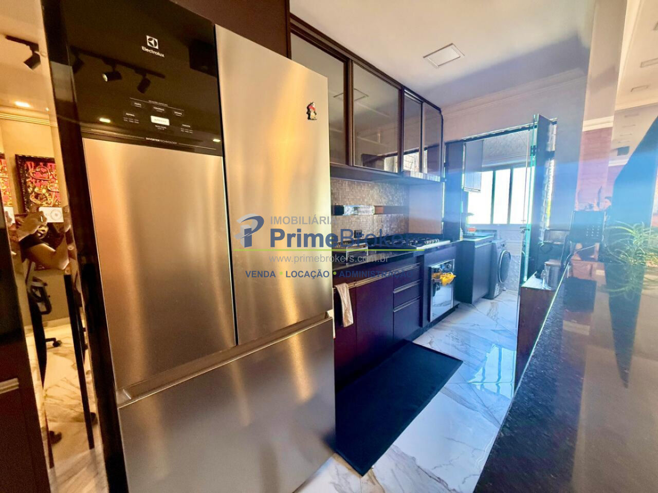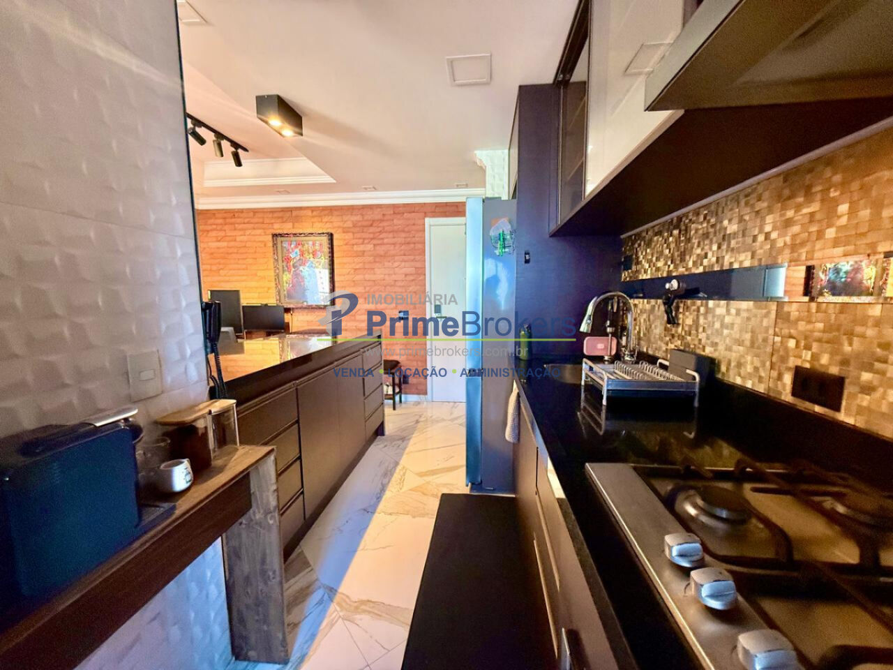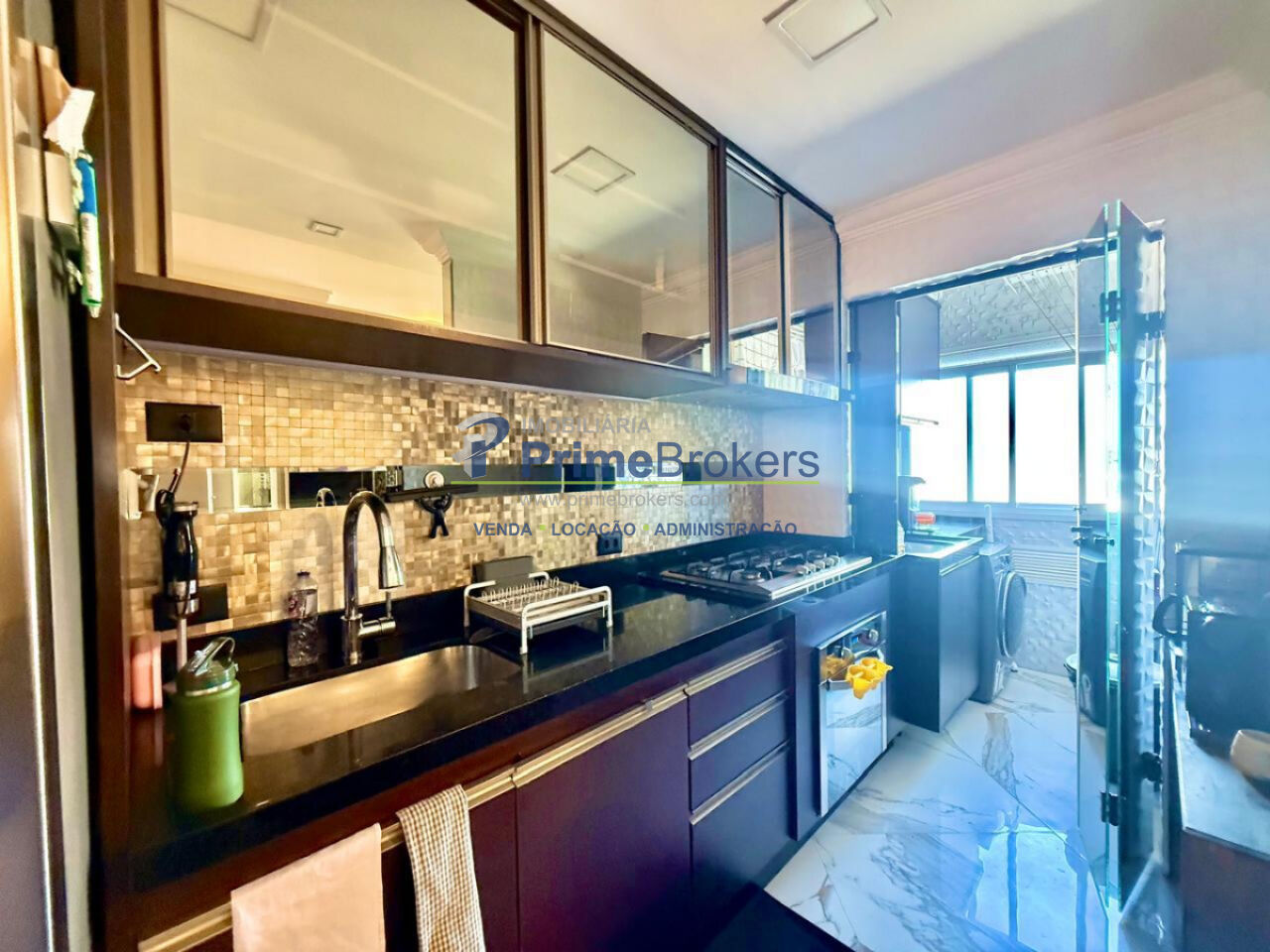 Sala ampla integrada à varanda gourmet, 2 vagas + depósito, cozinha integrada, móveis planejados, piso porcelanato, área de serviço, água quente, gás encanado