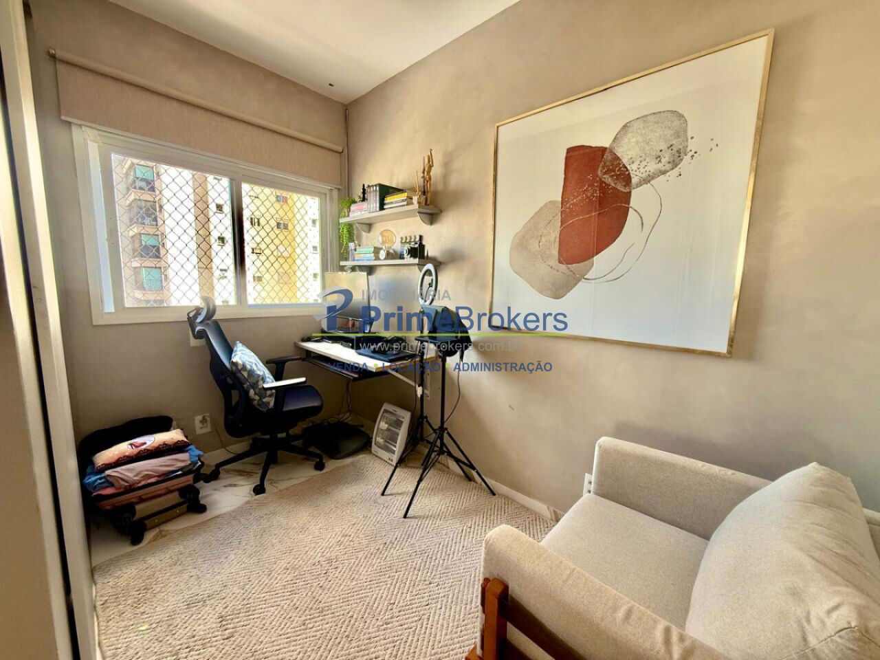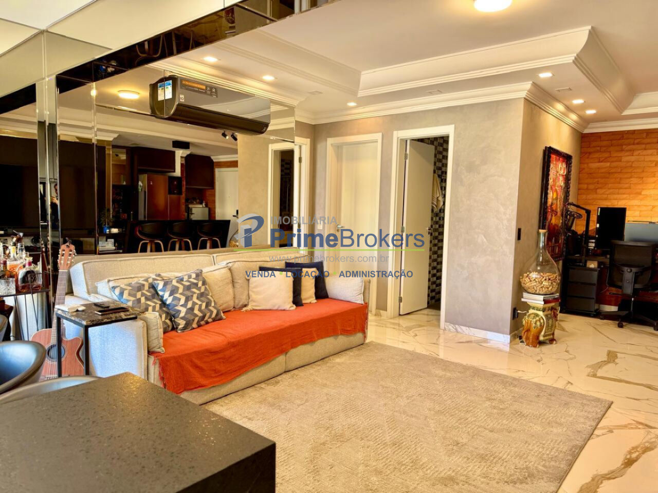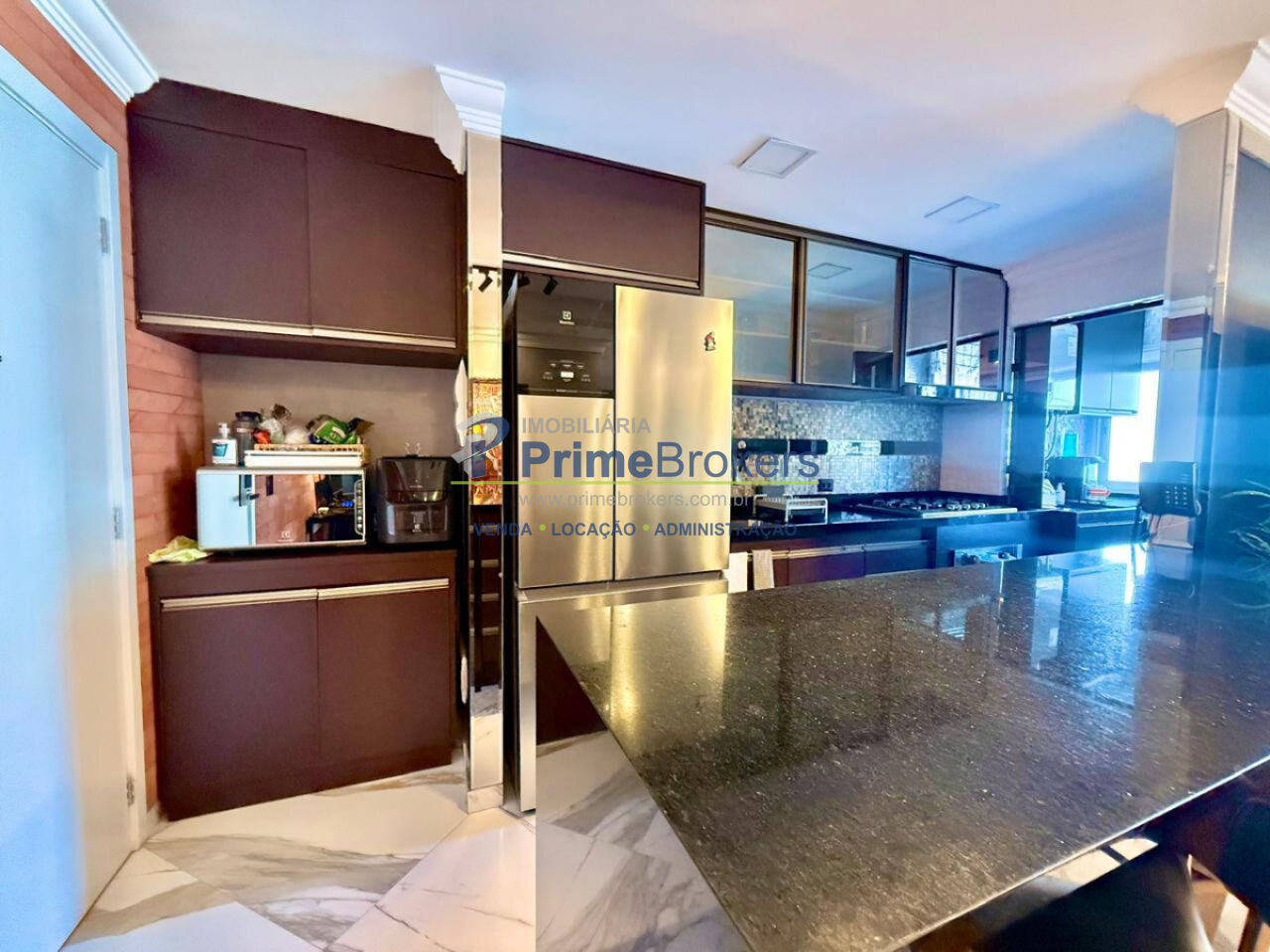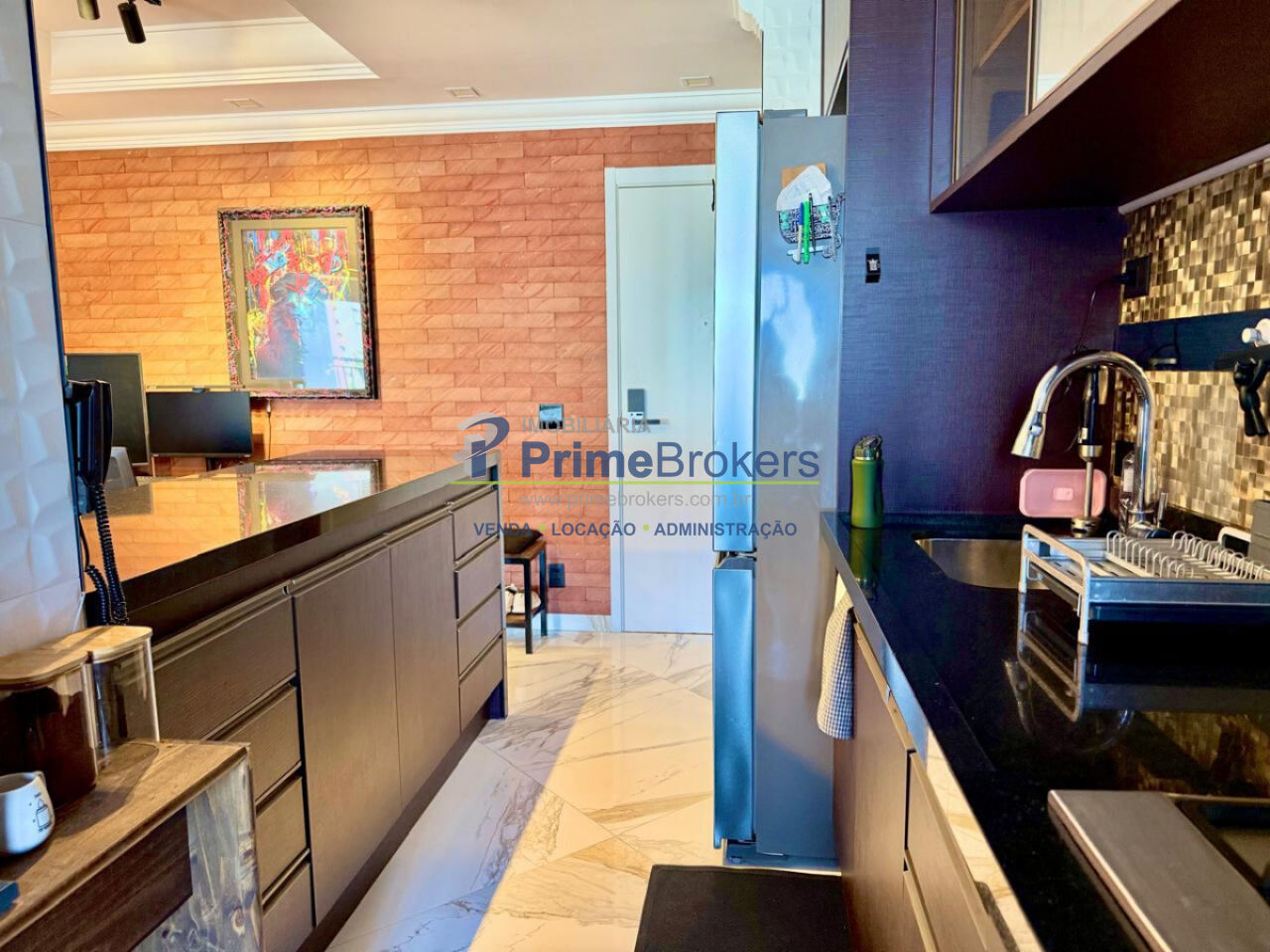 Sala ampla integrada à varanda gourmet, 2 vagas + depósito, cozinha integrada, móveis planejados, piso porcelanato, área de serviço, água quente, gás encanado