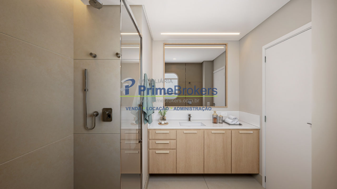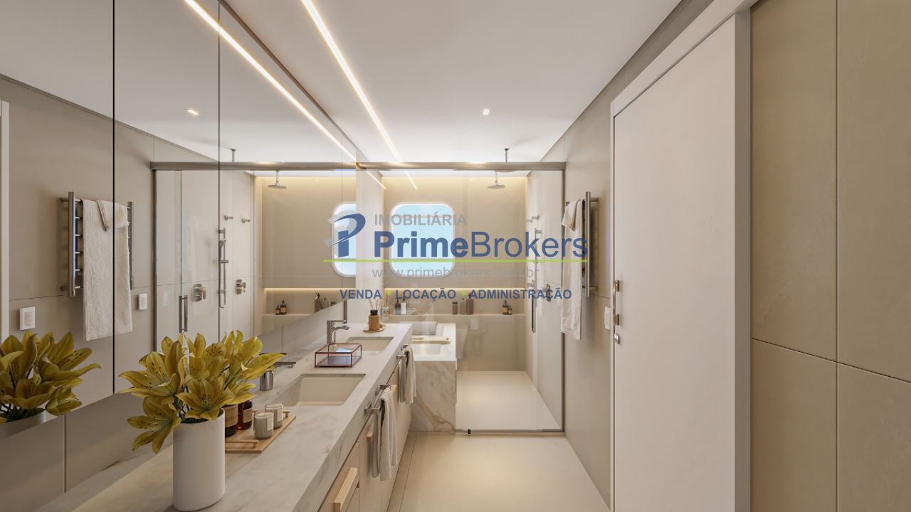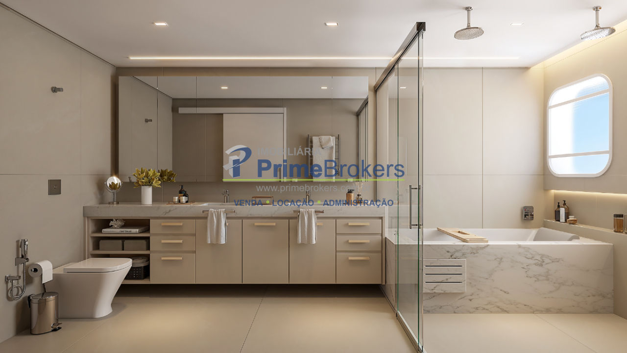 de organização e beleza. O banho spa é uma ode ao bem-estar: mármore Branco Paraná, duchas duplas de teto,