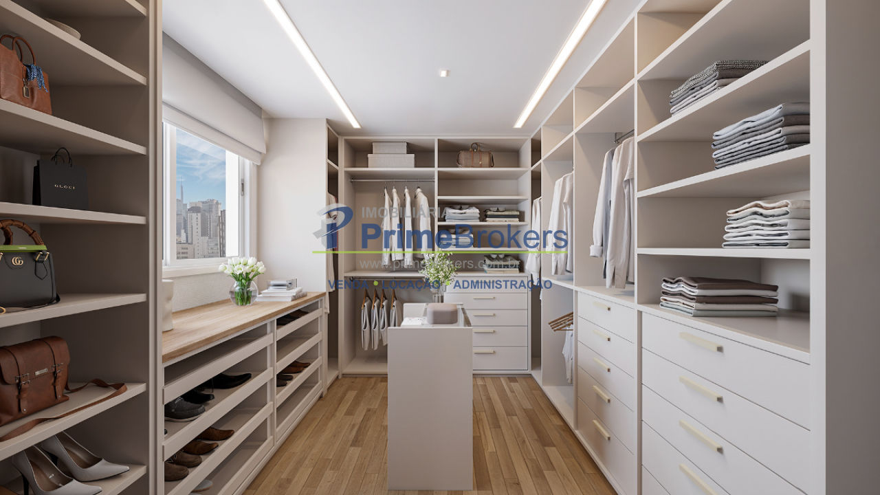 atmosfera silenciosa e acolhedora para uma cama king size. O walk-in closet, com sua ilha central iluminada, é um primor