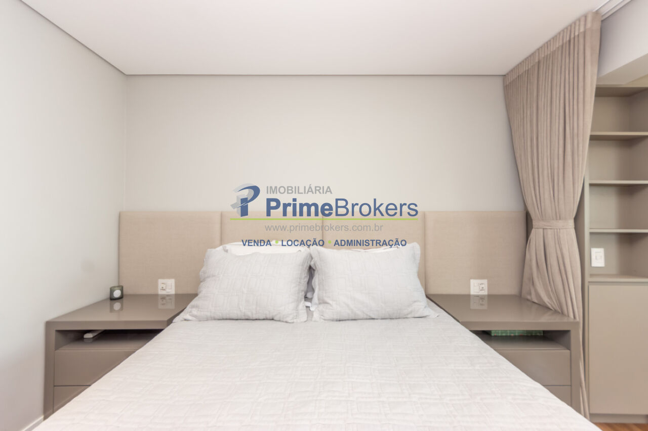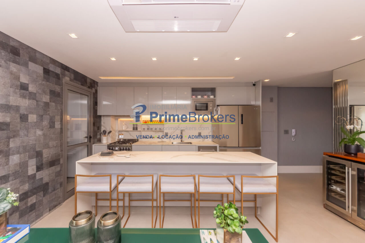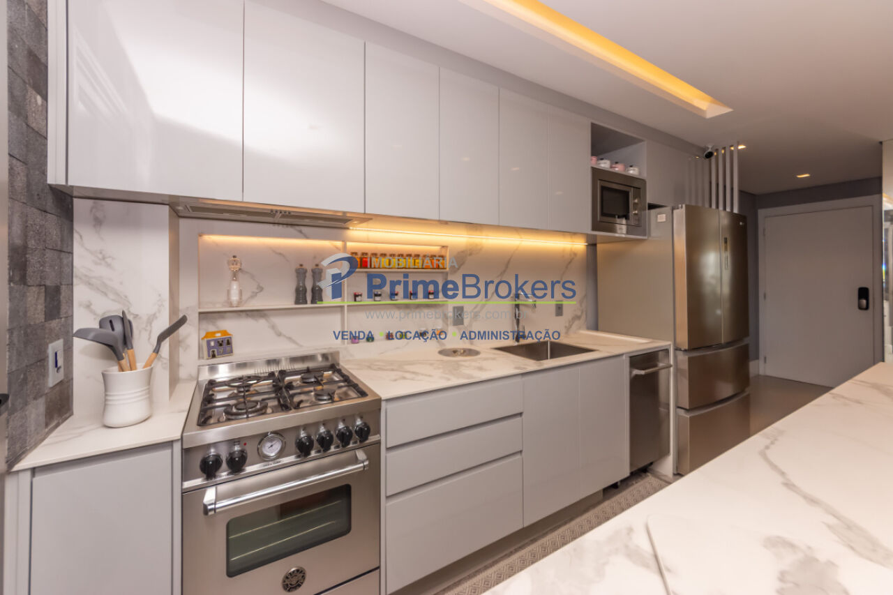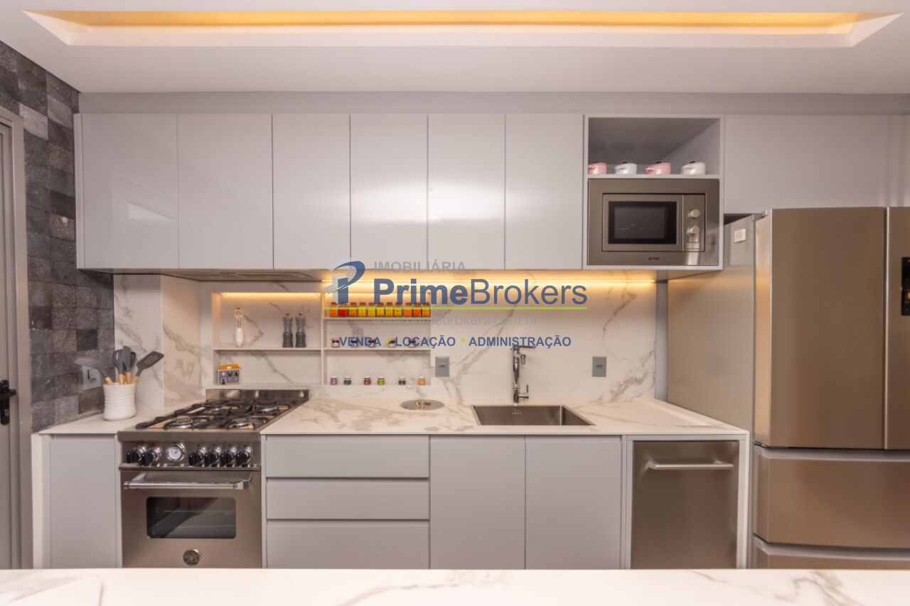 103m², 2 dormitórios sendo 2 suítes, 2 vagas de garagem, totalmente mobiliado e equipado, cozinha gourmet com ilha e eletrodomésticos importados, churrasqueira interna, varanda integrada, piso porcelanato, ar-condicionado K7, aquecimento central, lavabo, closet, água quente