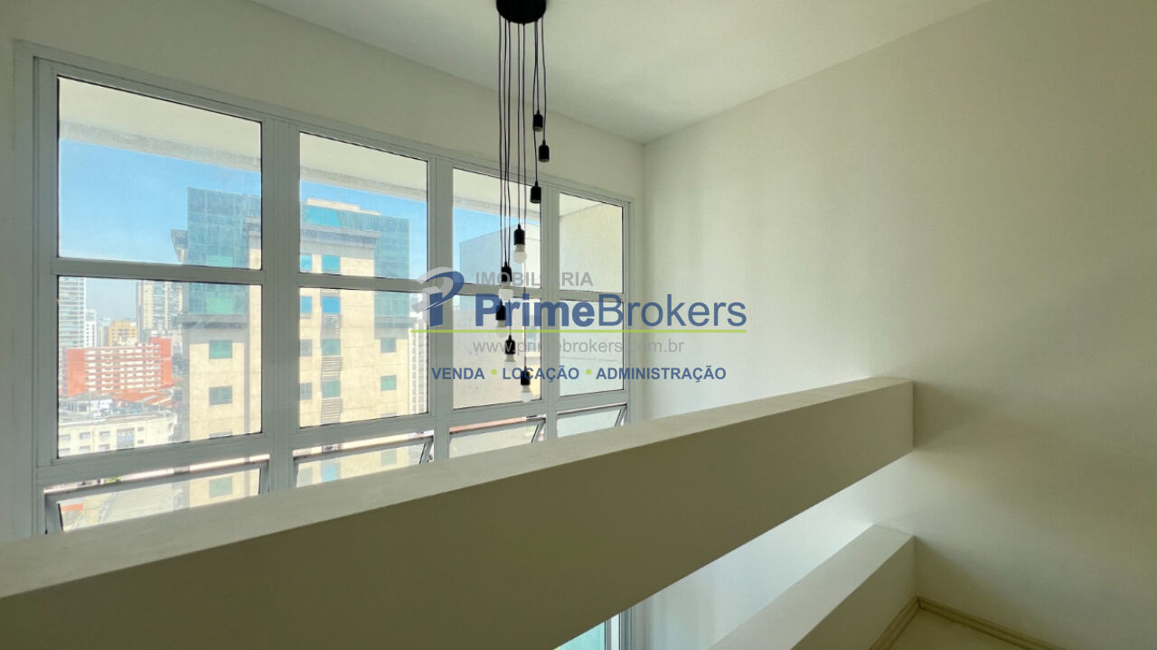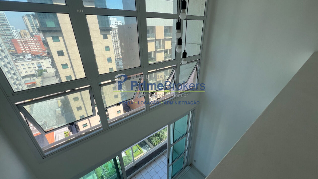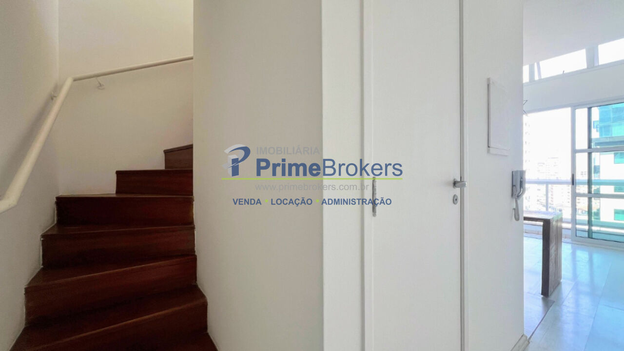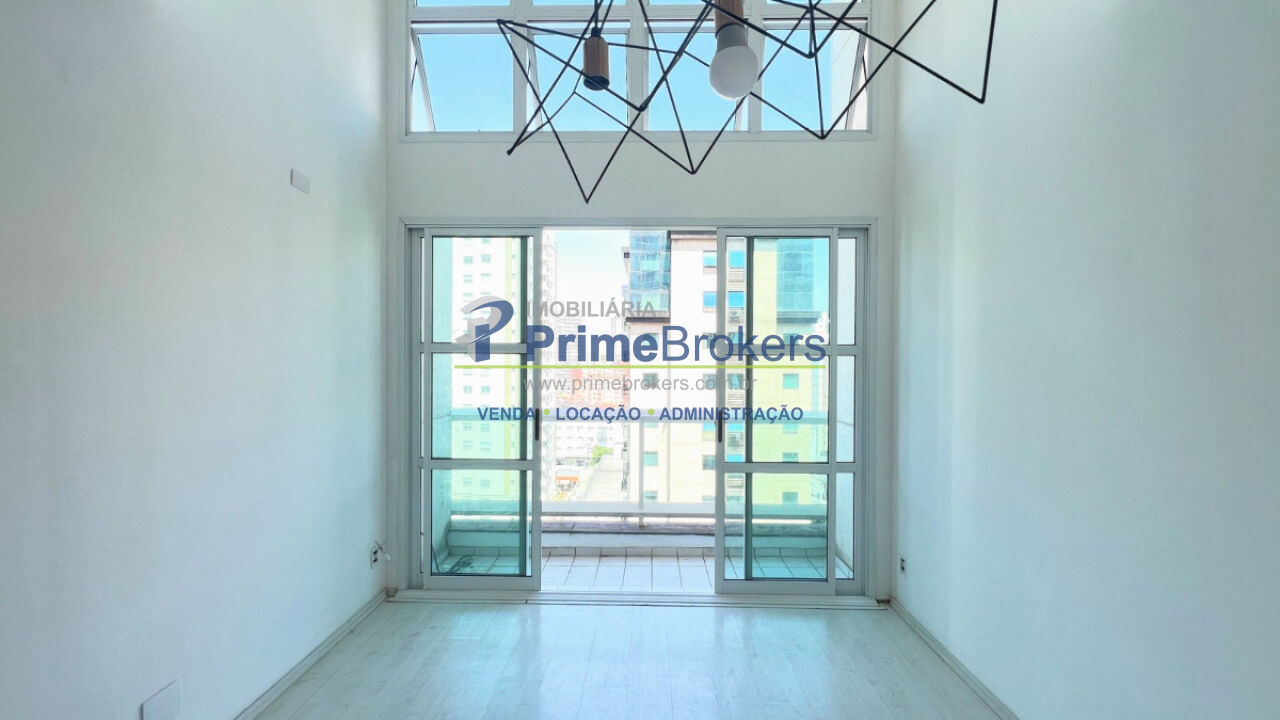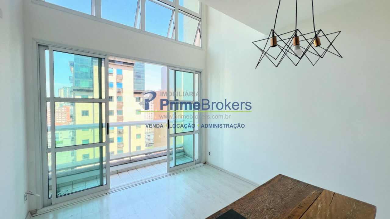 Apartamento em Moema com 45m², 1 suíte e 1 vaga - Duplex, sala com pé-direito duplo e varanda. Ambiente integrado à cozinha.