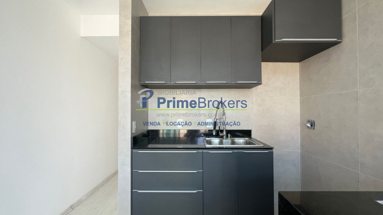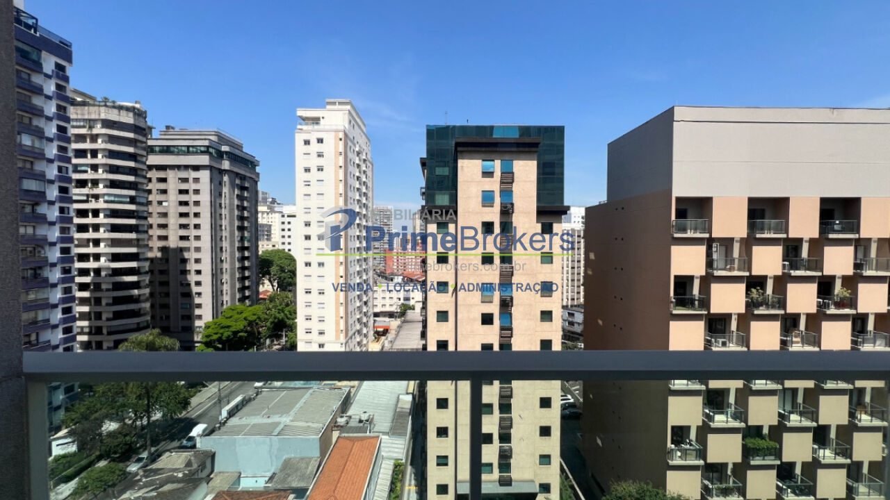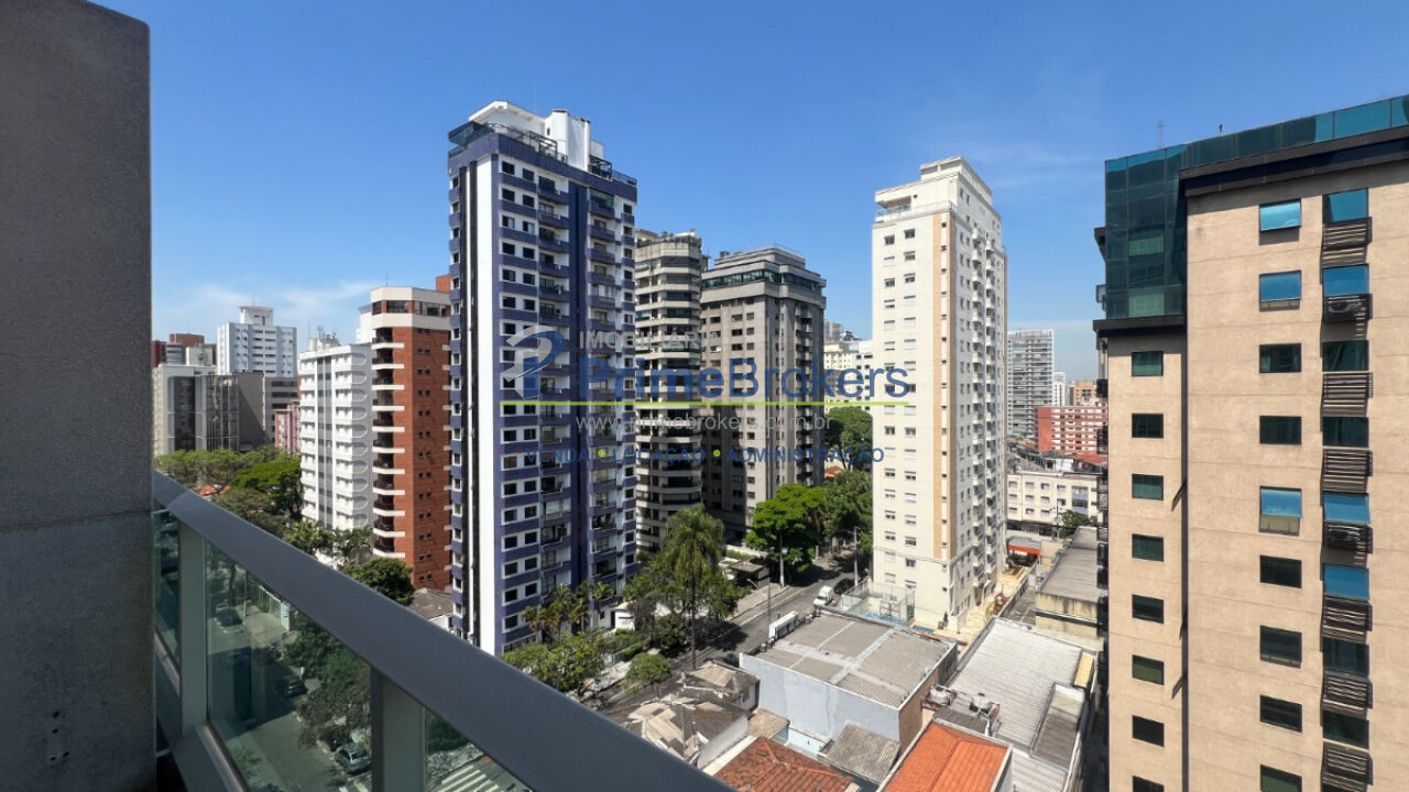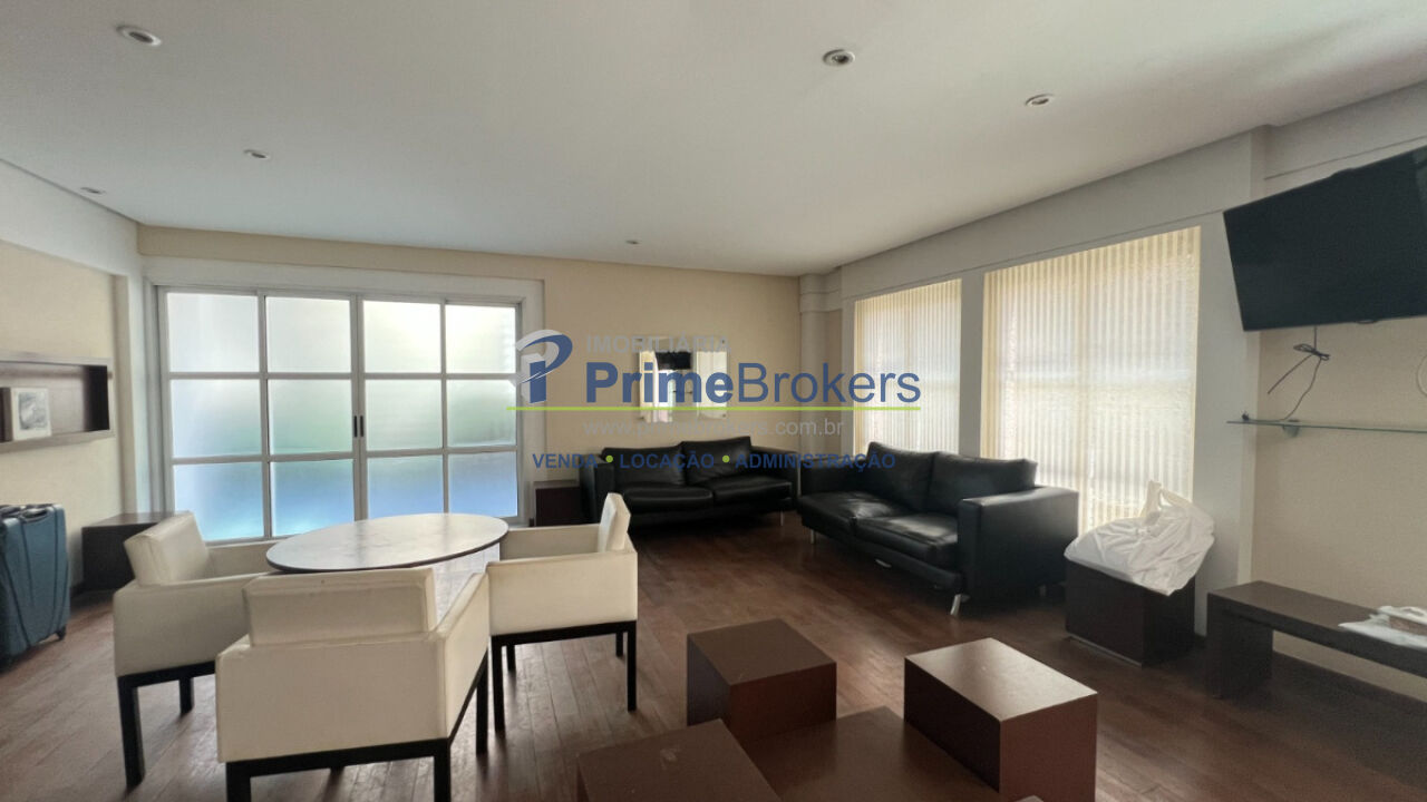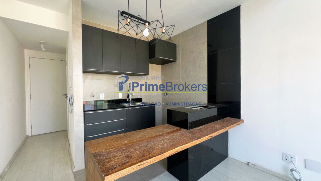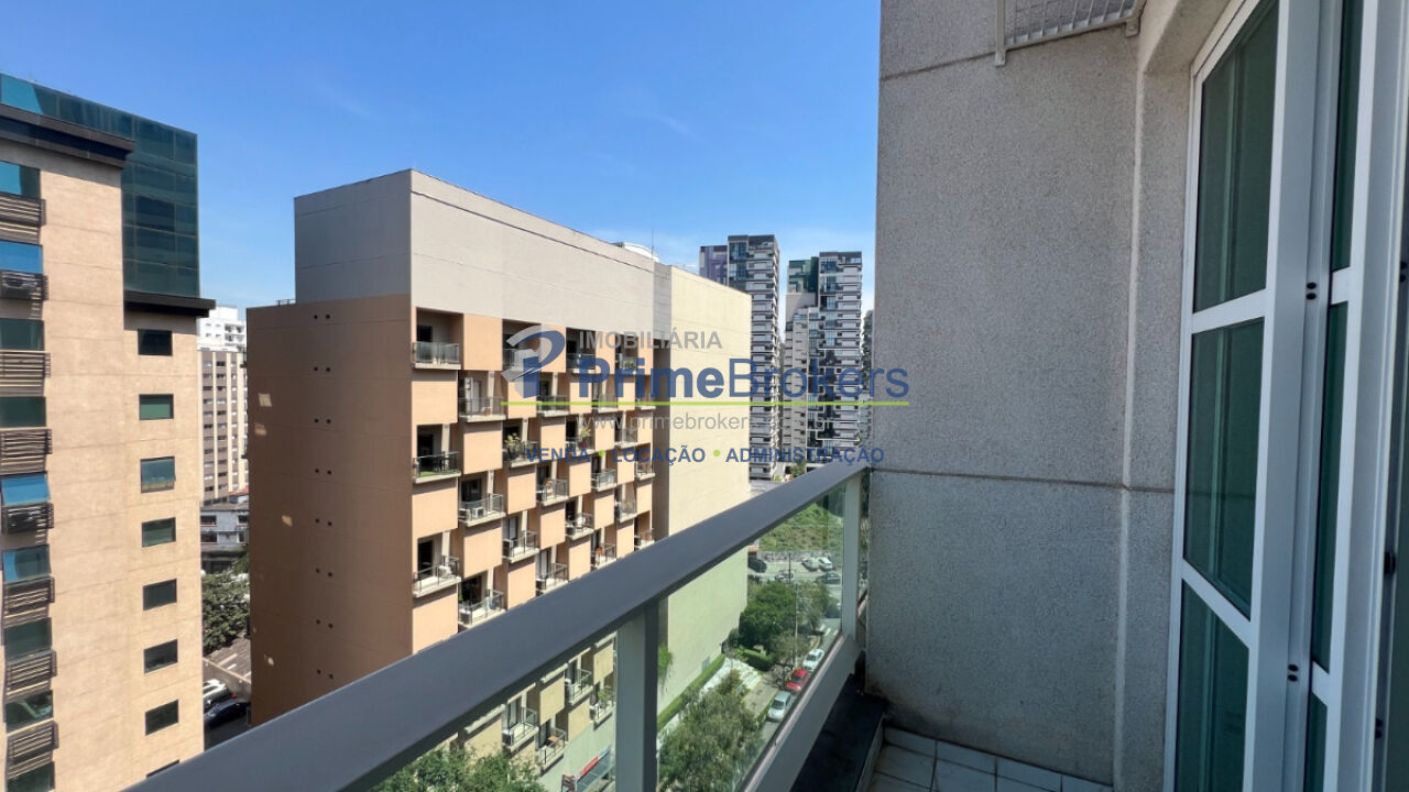 Apartamento em Moema com 45m², 1 suíte e 1 vaga - Duplex, sala com pé-direito duplo e varanda. Ambiente integrado à cozinha.