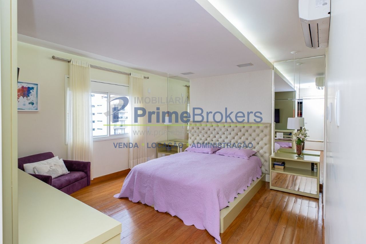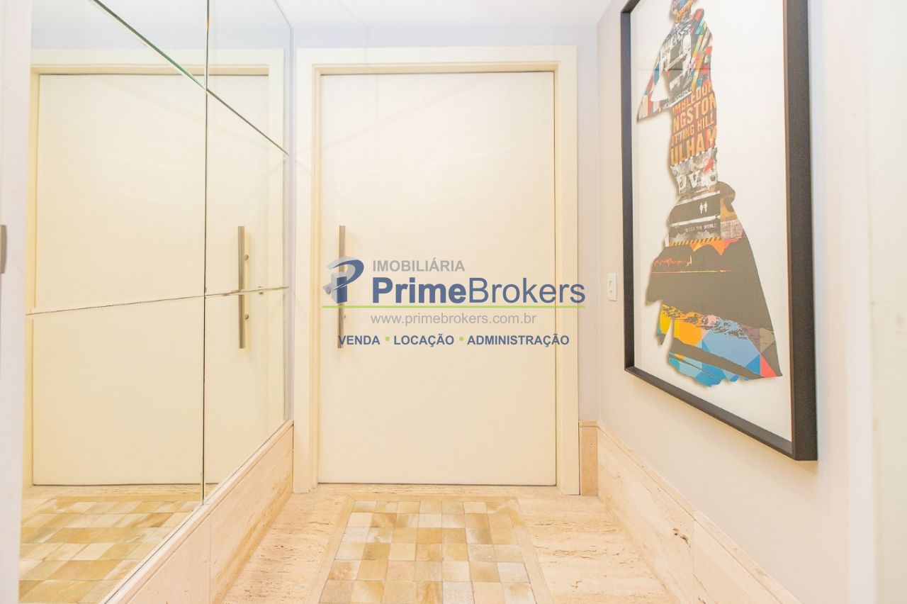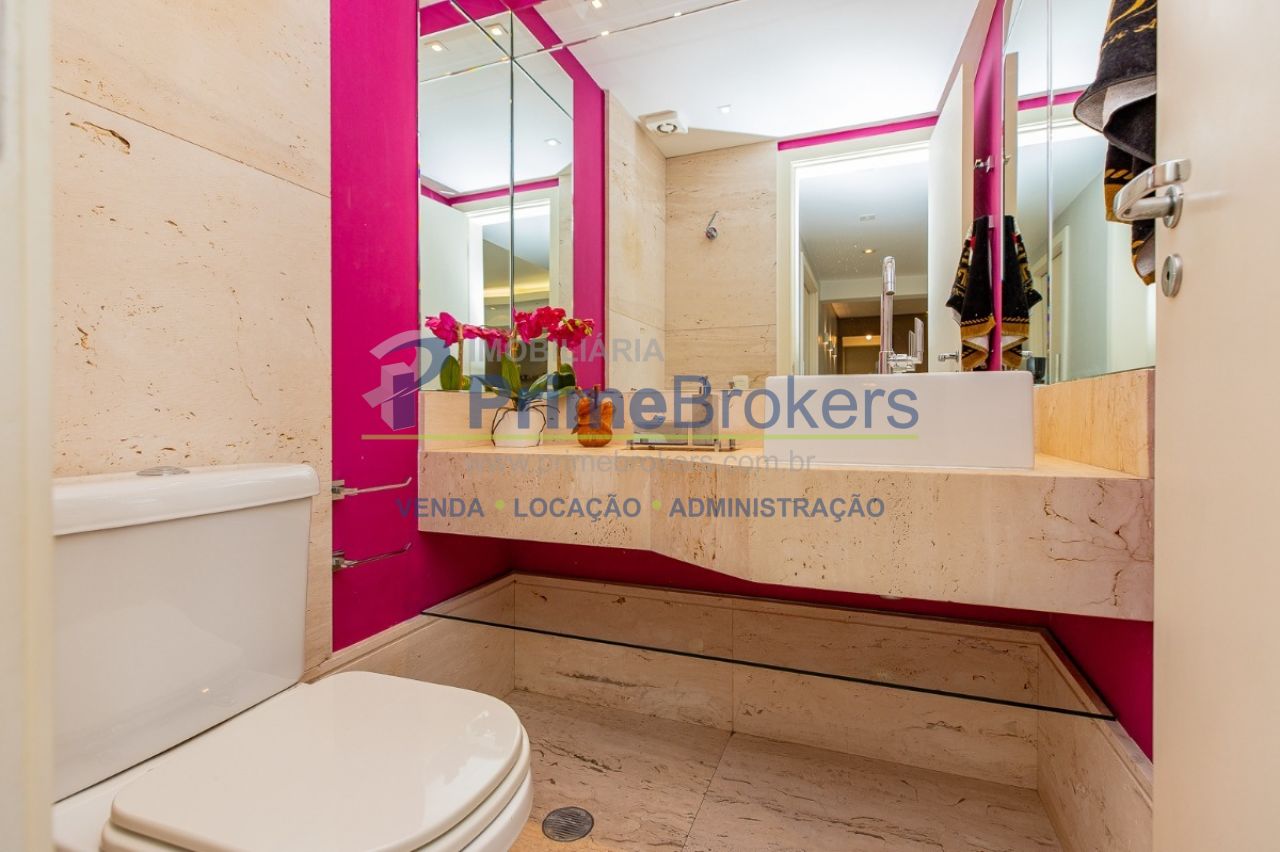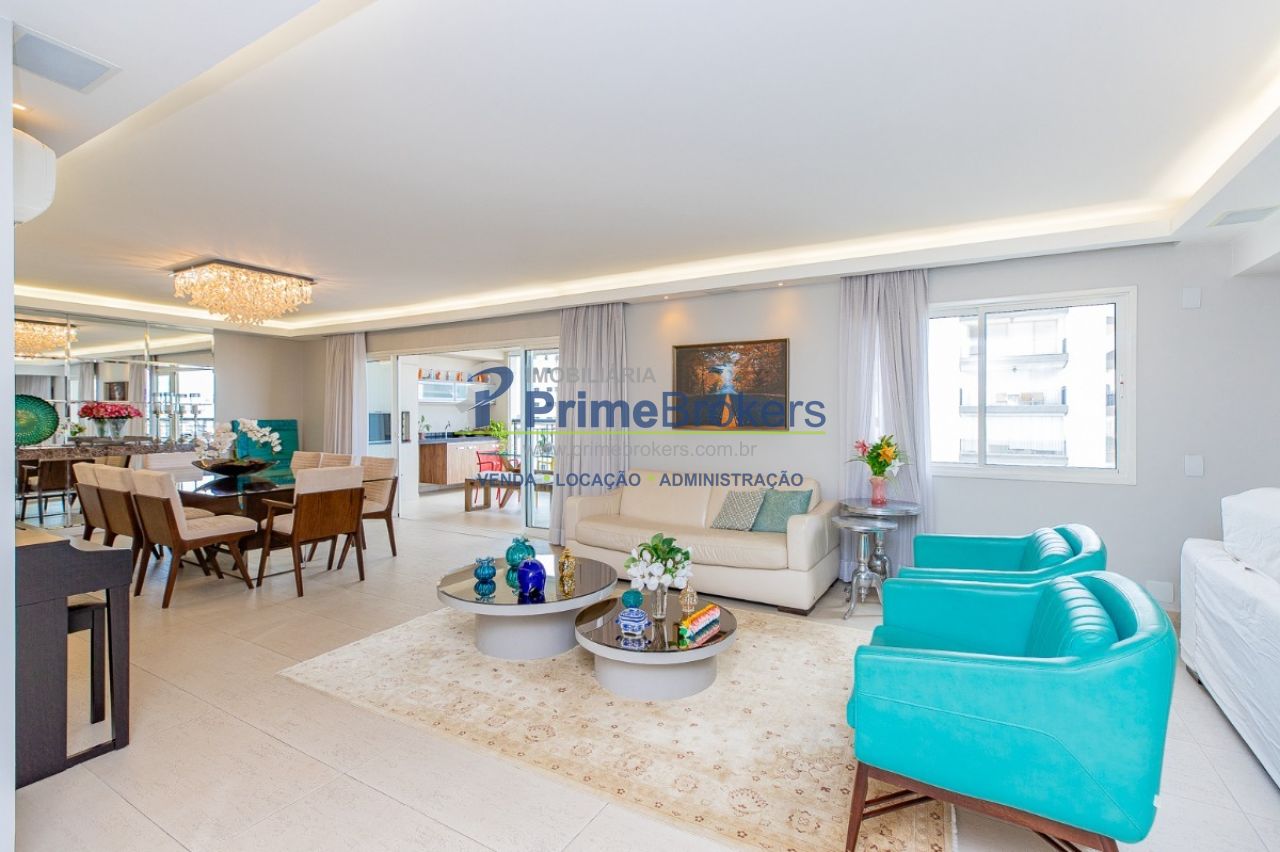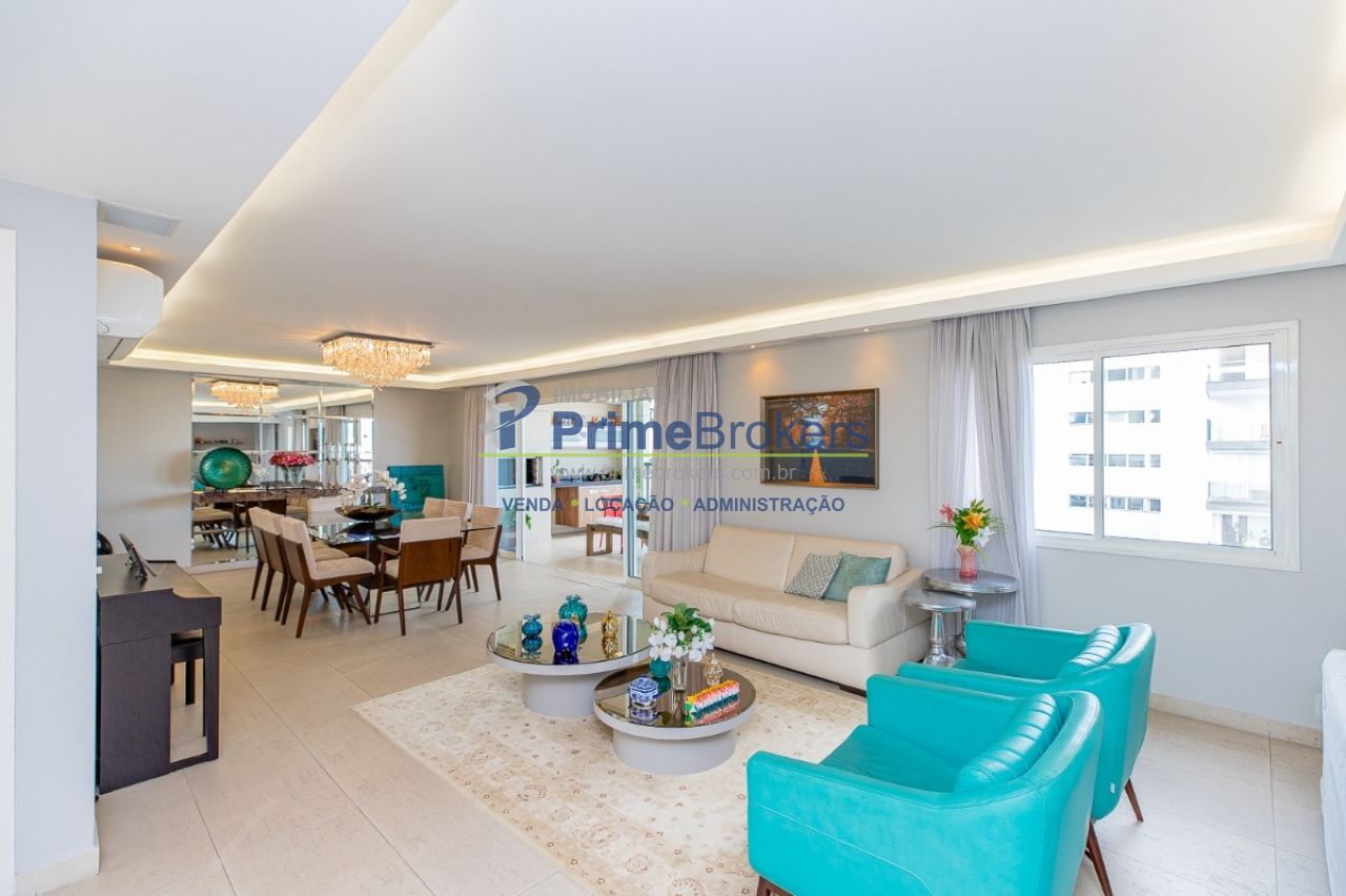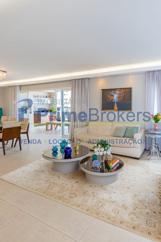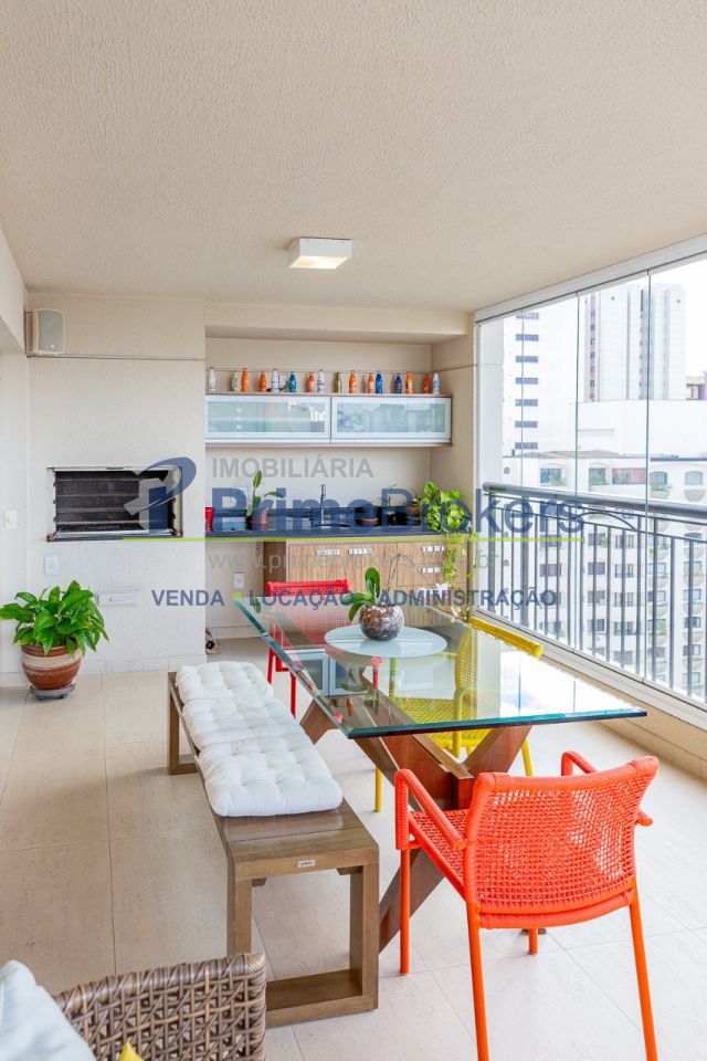 172m² reformado, hall privativo, sala ampla de 3 ambientes com varanda integrada, cozinha com biombo de madeira ripada (integrável), piso de porcelanato, ar-condicionado em todos os ambientes, 3 suítes (principal com closet, banheira e sacada), lavabo, roupeiro/louceiro, área de serviço com quarto e banheiro de funcionários, 3 vagas de garagem