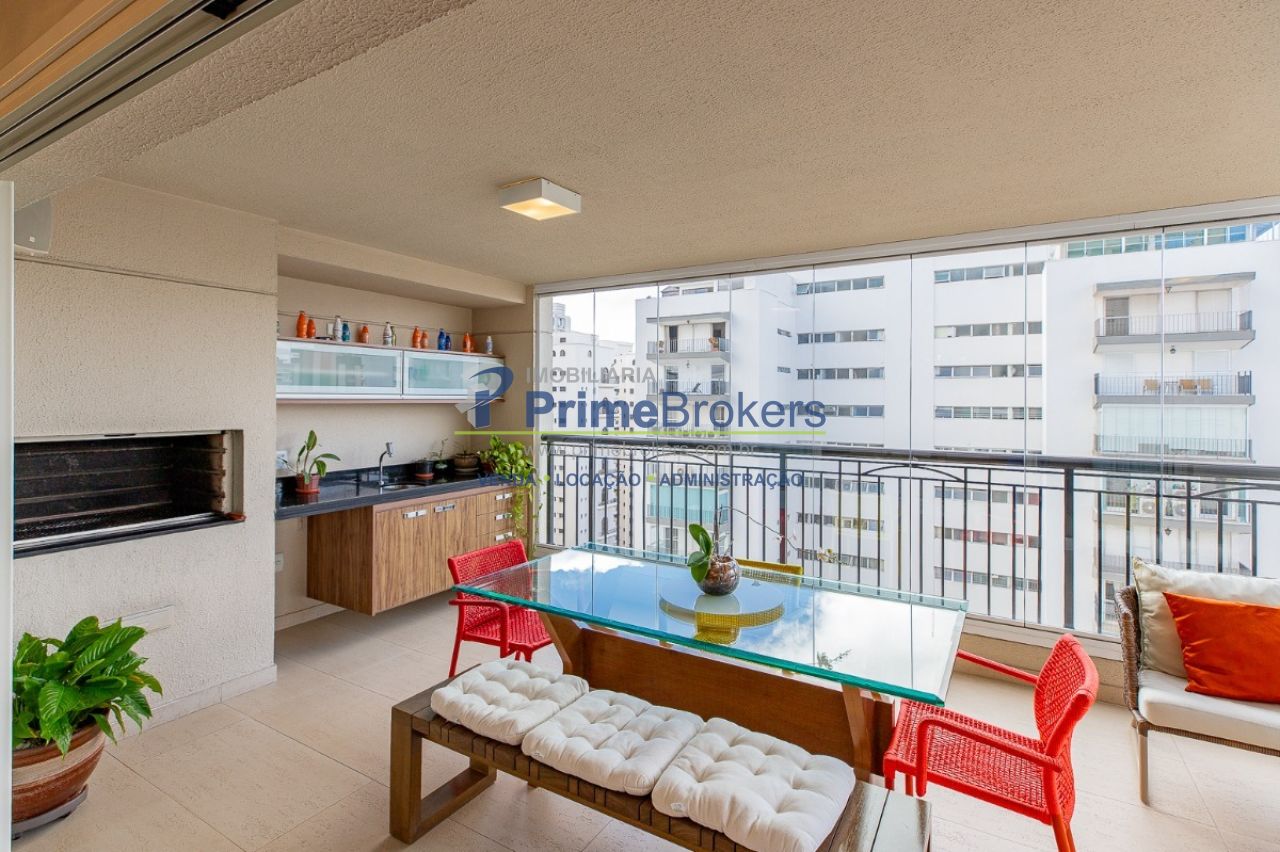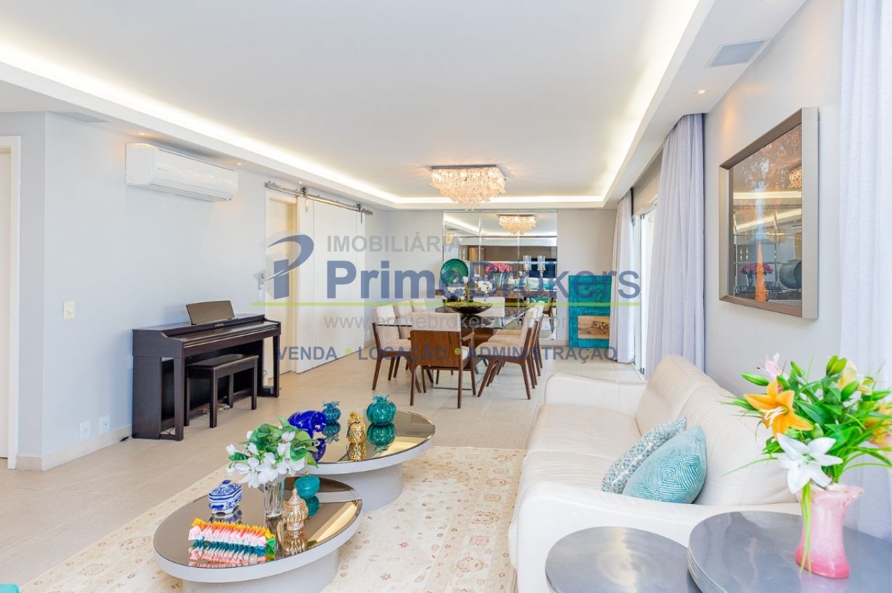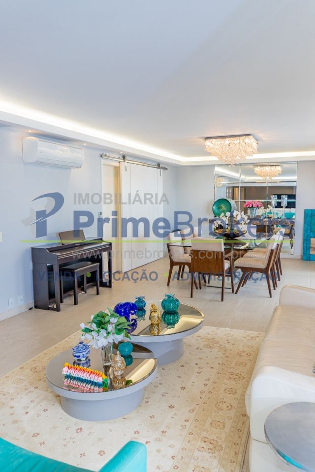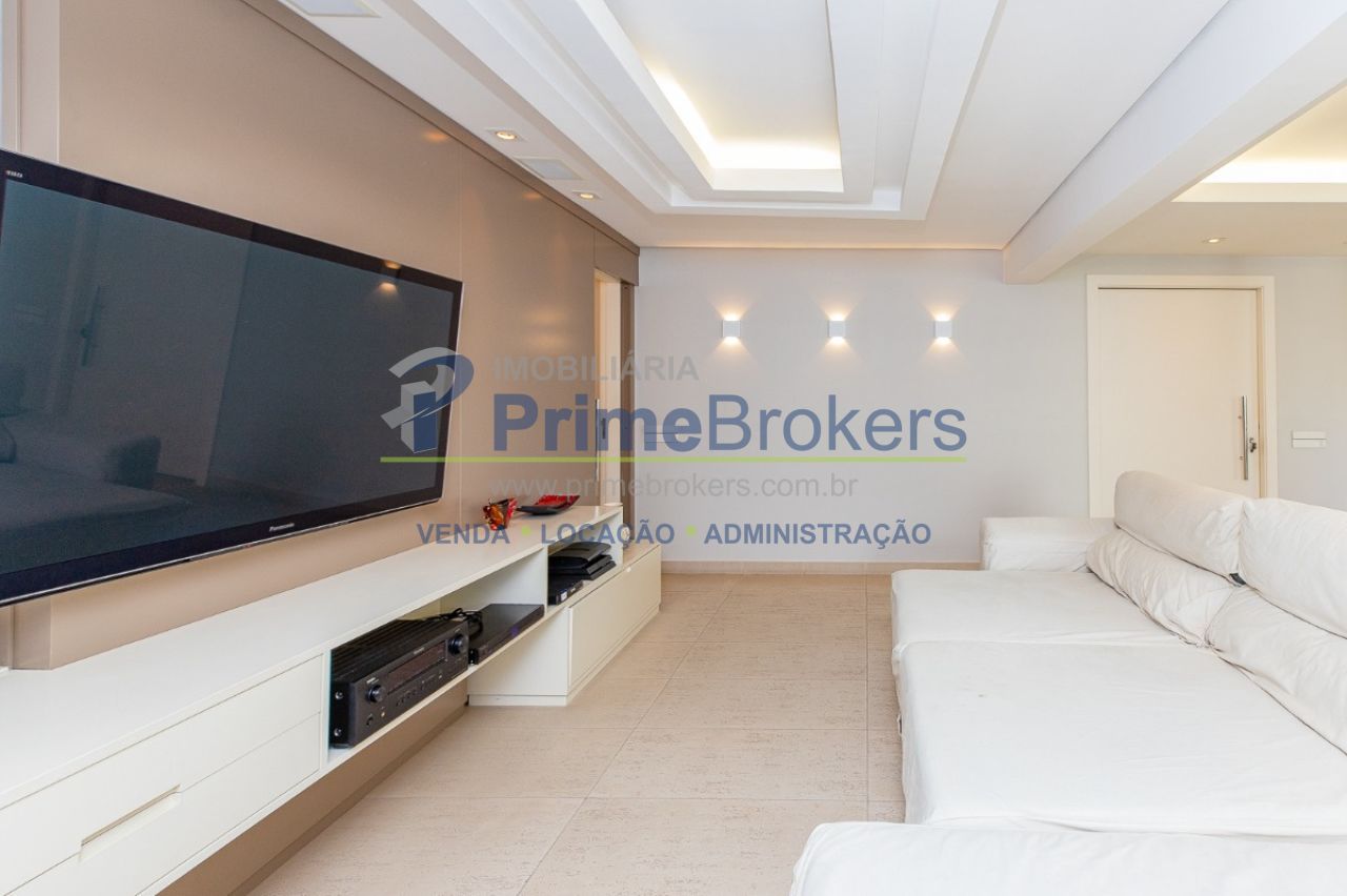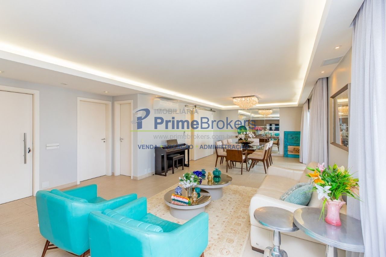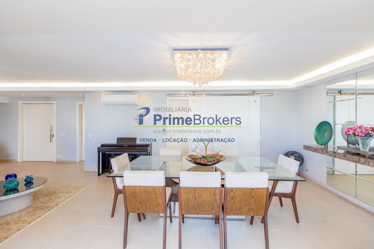172m² reformado, hall privativo, sala ampla de 3 ambientes com varanda integrada, cozinha com biombo de madeira ripada (integrável), piso de porcelanato, ar-condicionado em todos os ambientes, 3 suítes (principal com closet, banheira e sacada), lavabo, roupeiro/louceiro, área de serviço com quarto e banheiro de funcionários, 3 vagas de garagem