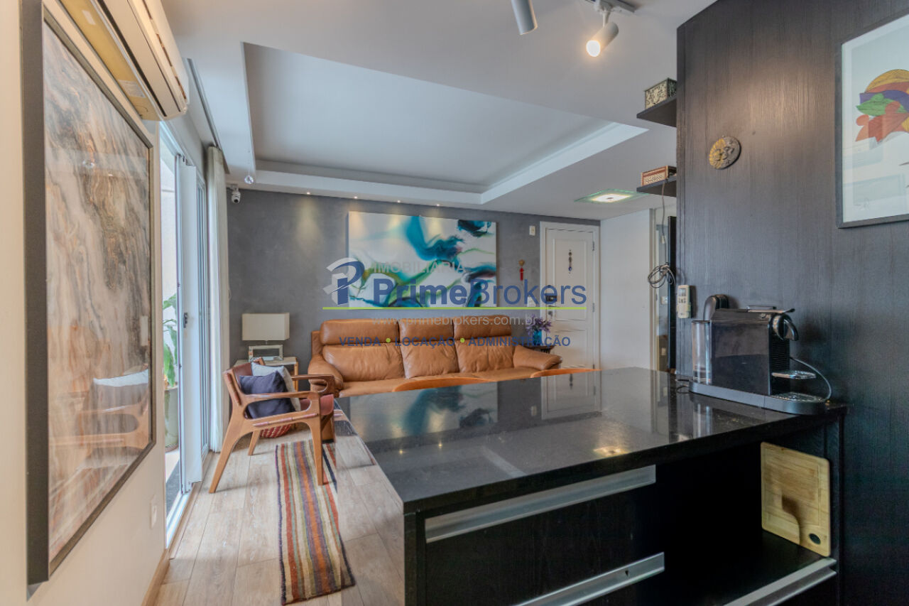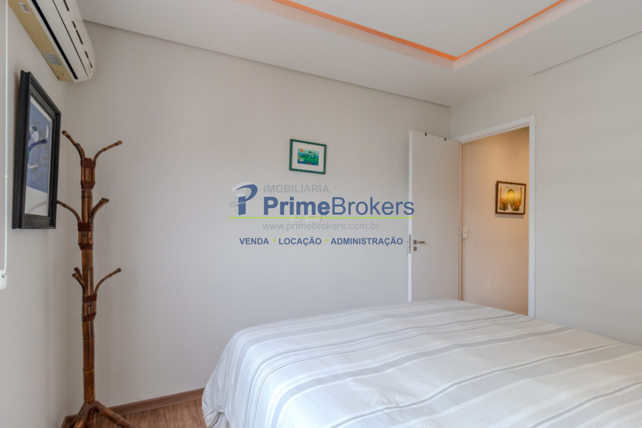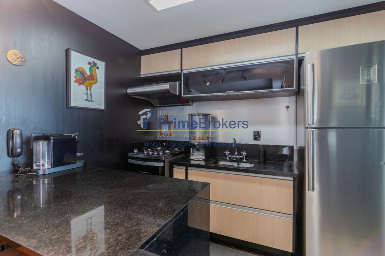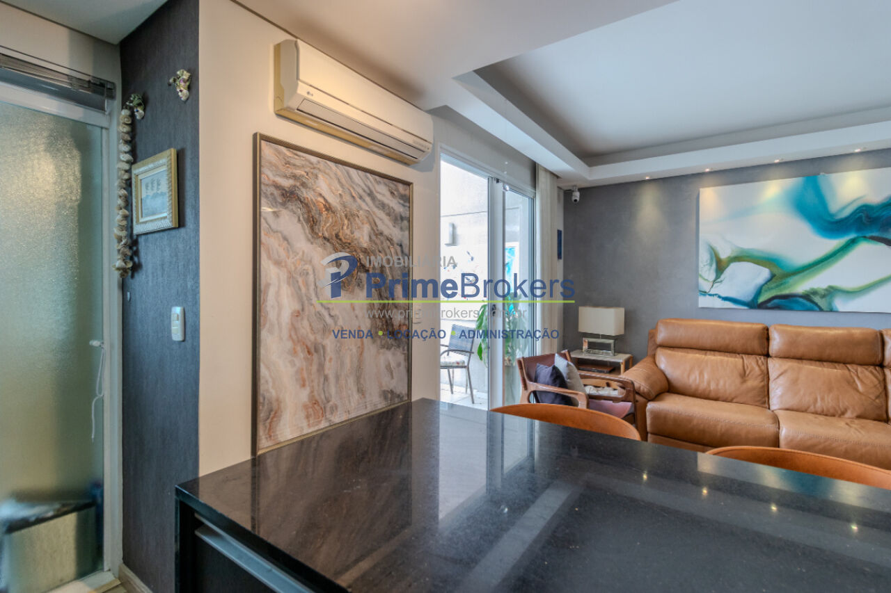 Apartamento com 70m², 2 dormitórios, cozinha integrada, varanda, ar condicionado.