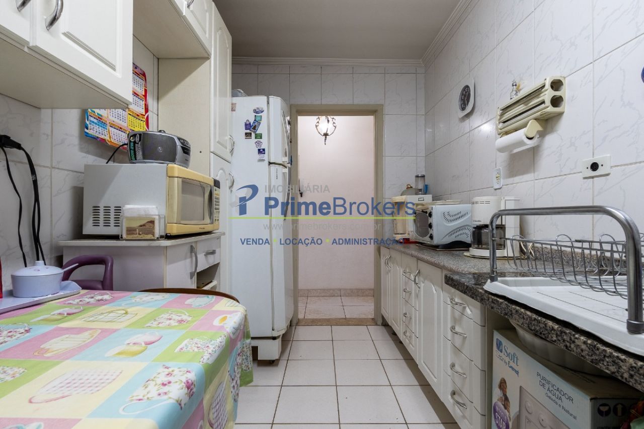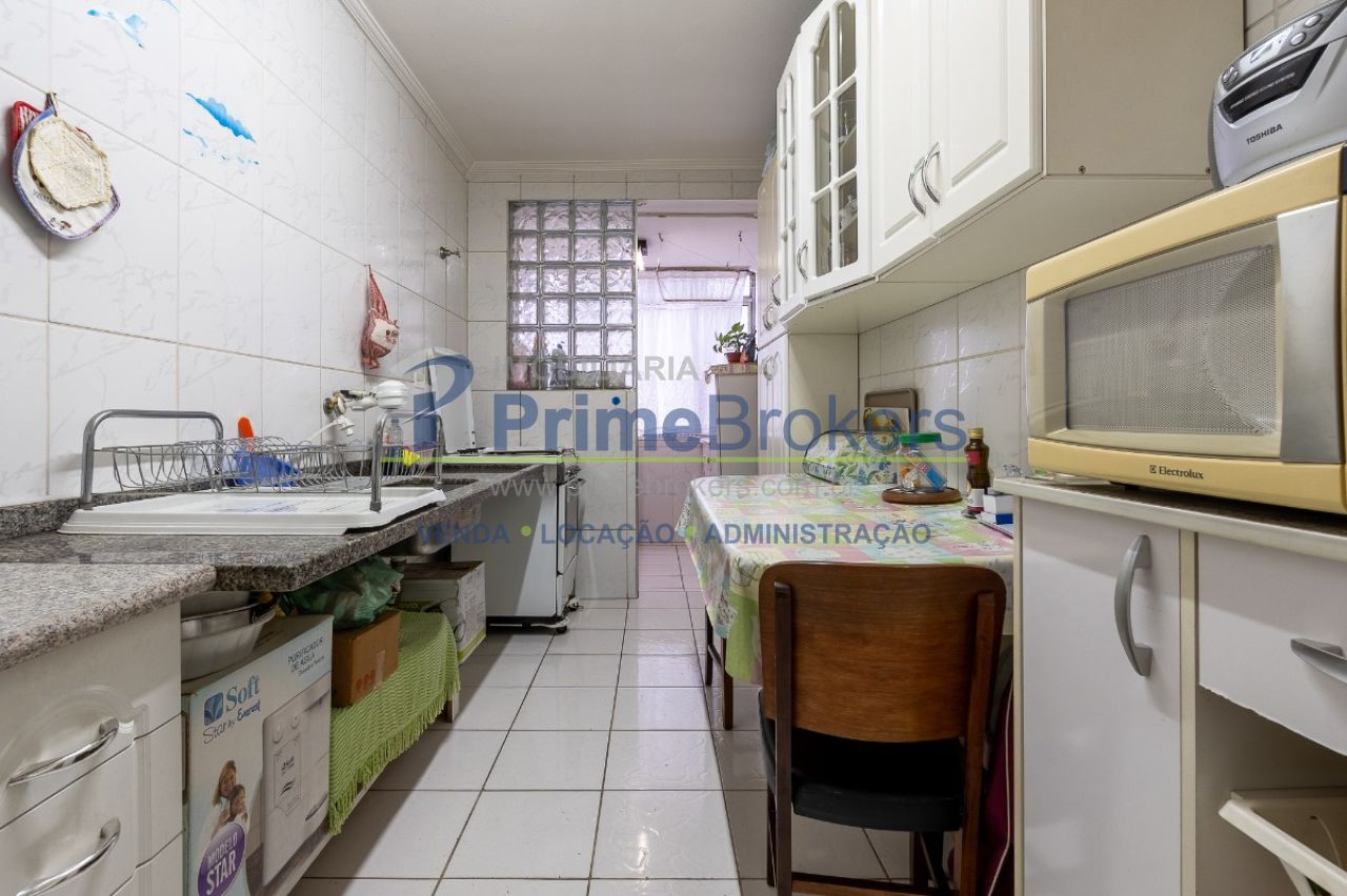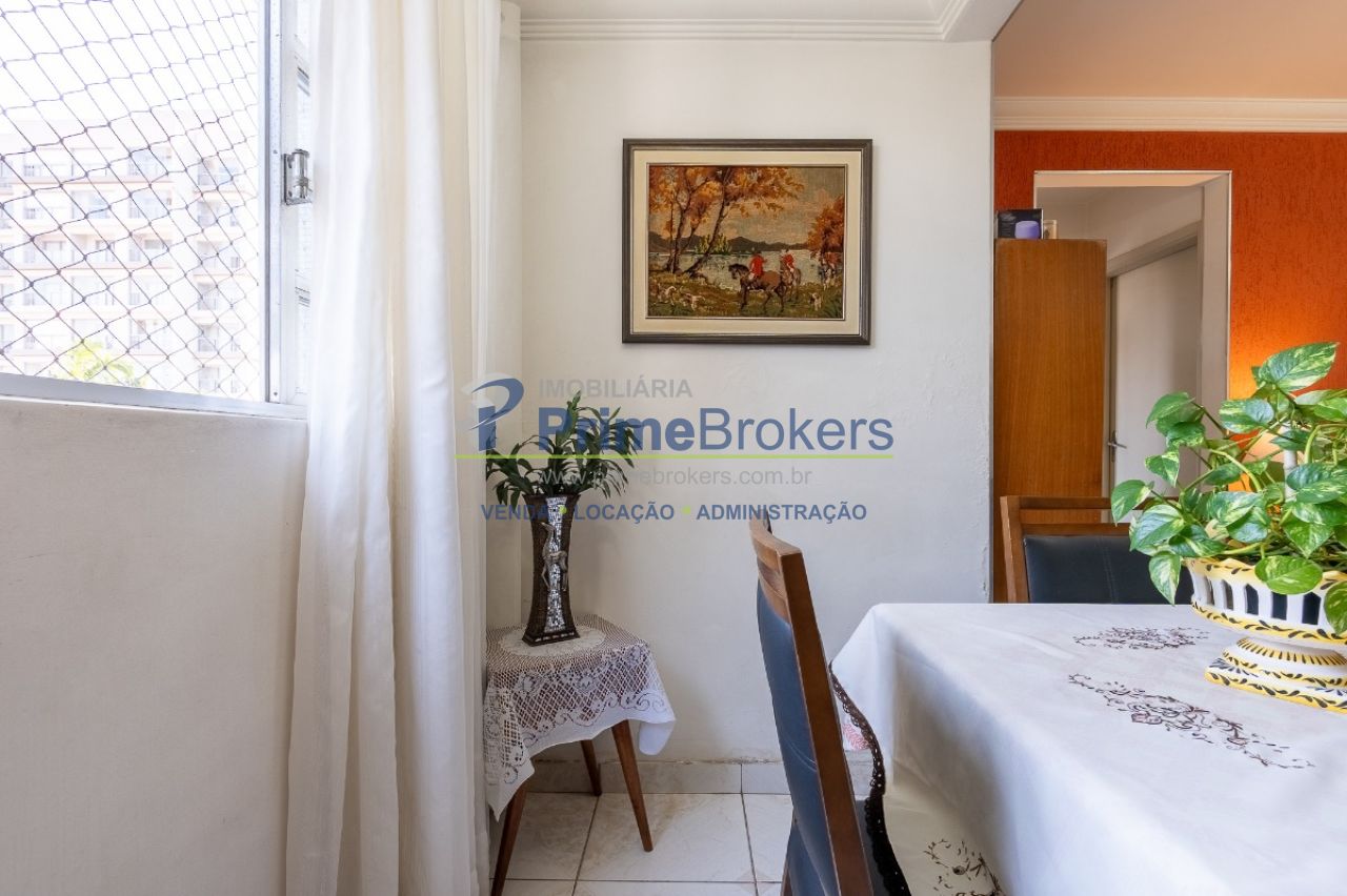 Sala ampla para 2 ambientes, cozinha espaçosa com armários embutidos, 1 dormitório com armários planejados, apartamento de frente com iluminação natural, segundo andar em prédio baixo, 1 vaga de garagem, área de serviço, 1 banheiro social