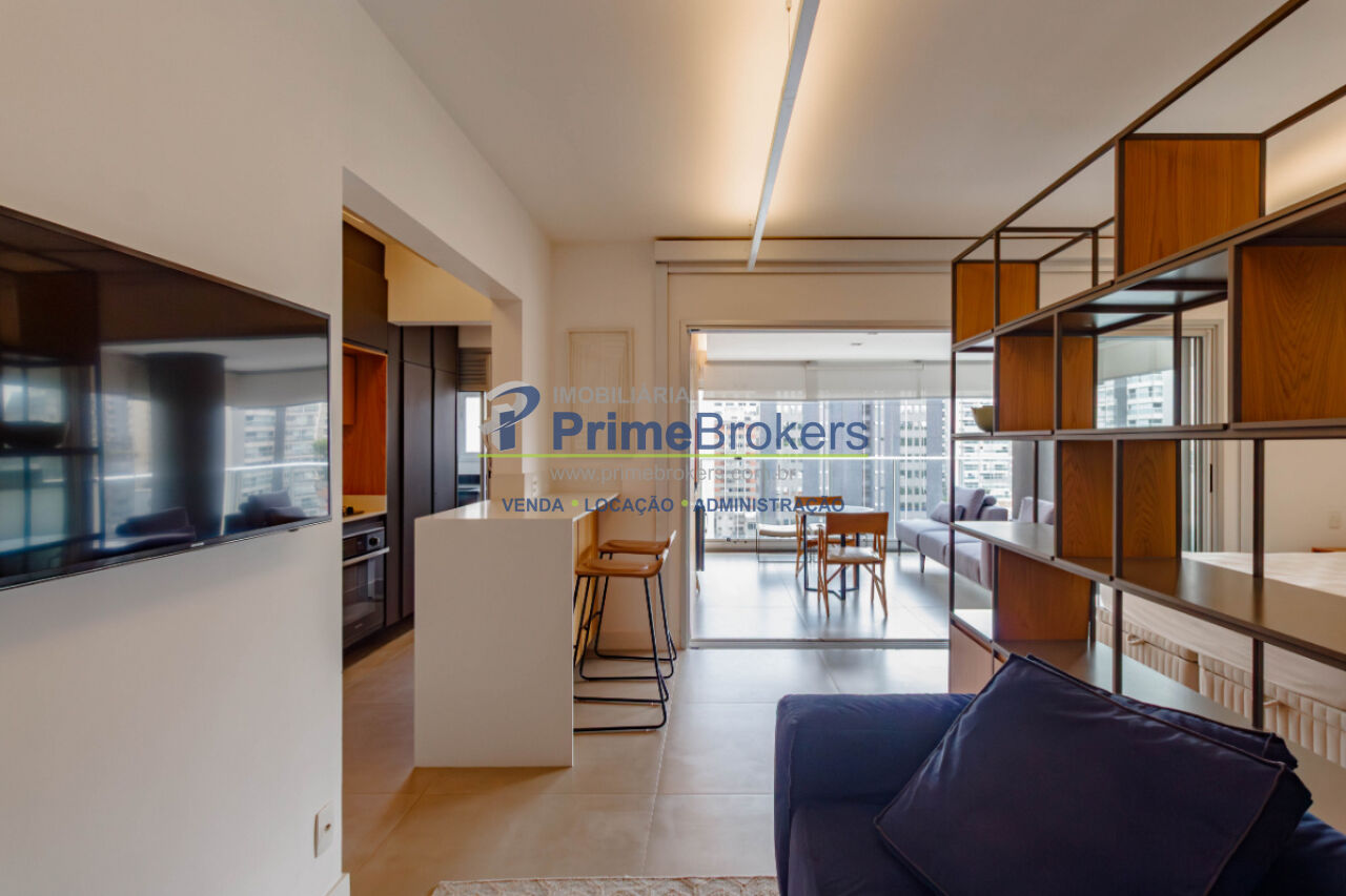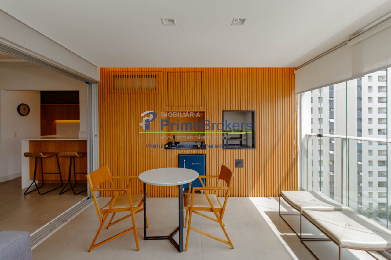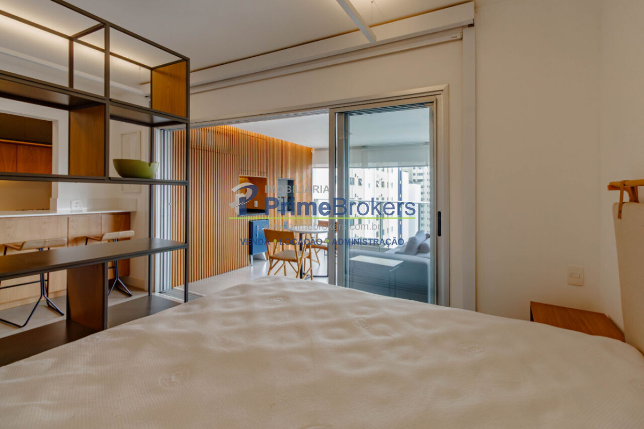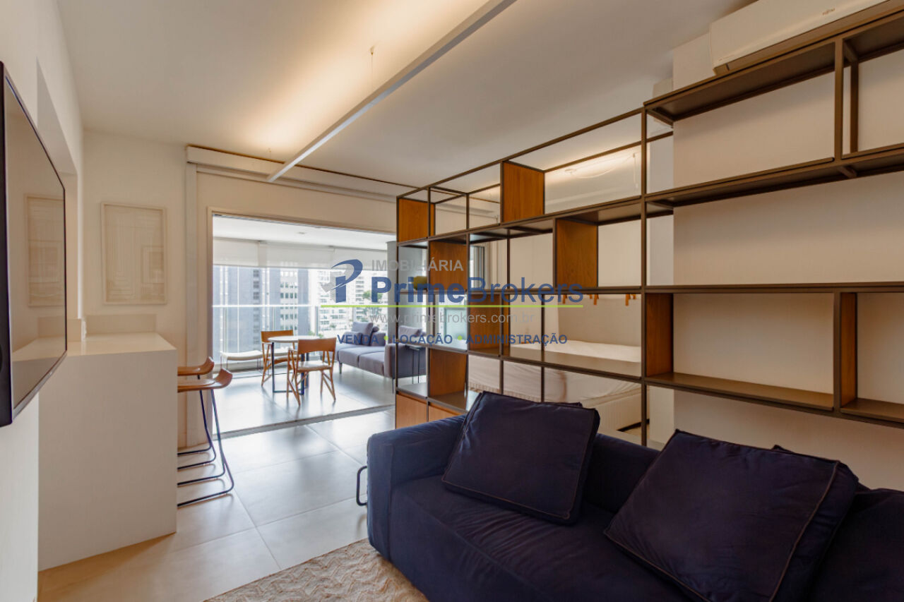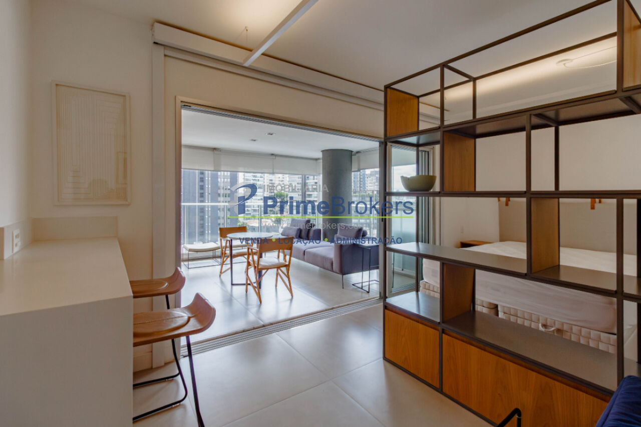 Viva o melhor de São Paulo neste grande estúdio de luxo, mobiliado e decorado, com 62m² privativos. É o cenário ideal para uma vida prática e vibrante. O projeto inteligente integra sala, quarto (com suíte) e cozinha equipada, separados por uma estante vazada, criando ambientes aconchehantes. O grande destaque é a ampla varanda gourmet envidraçada com churrasqueira, frigobar e área de estar, perfeita para entretenimento com entrada de luz e vista livre.