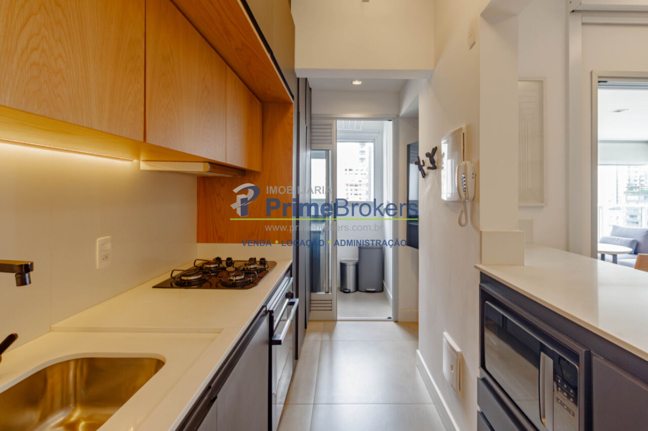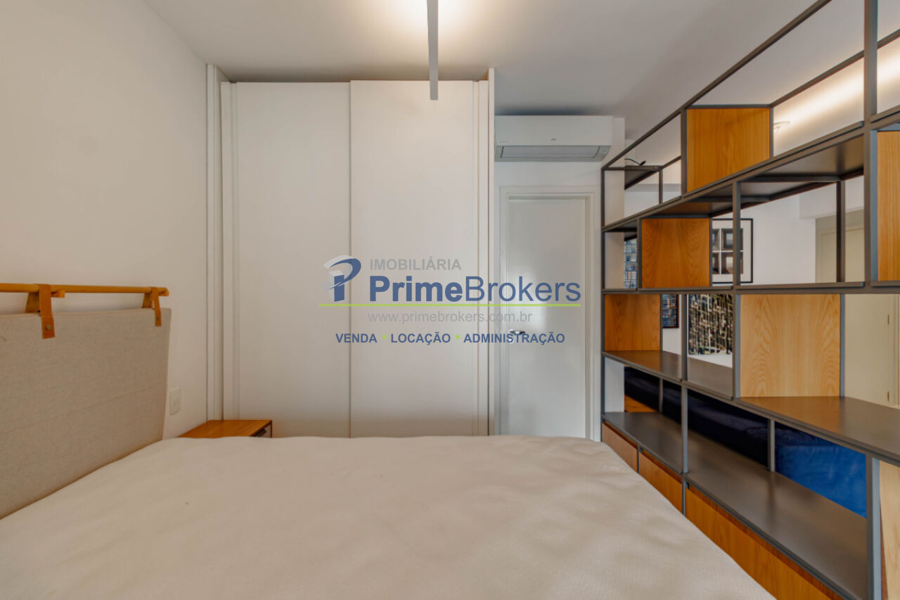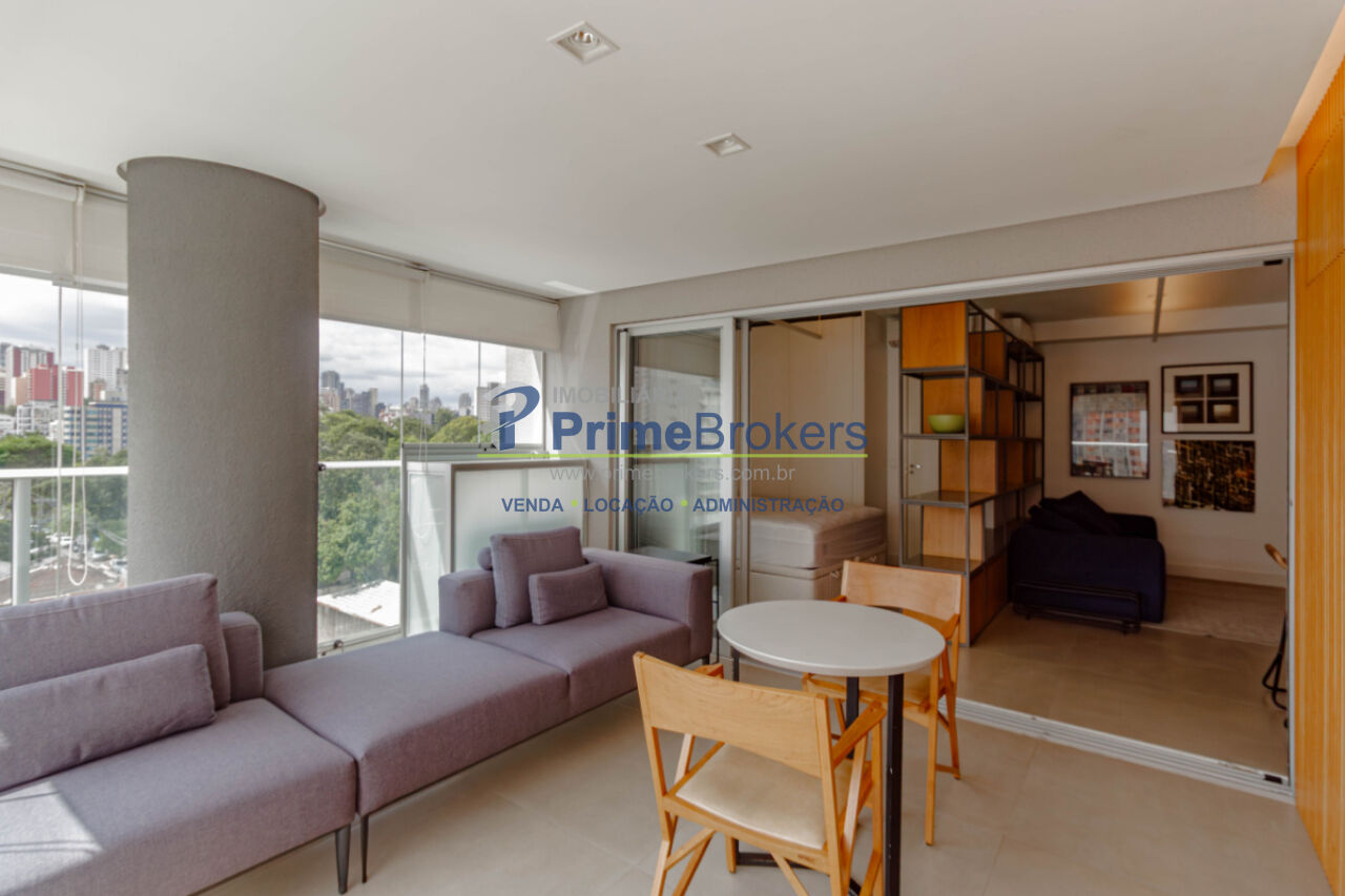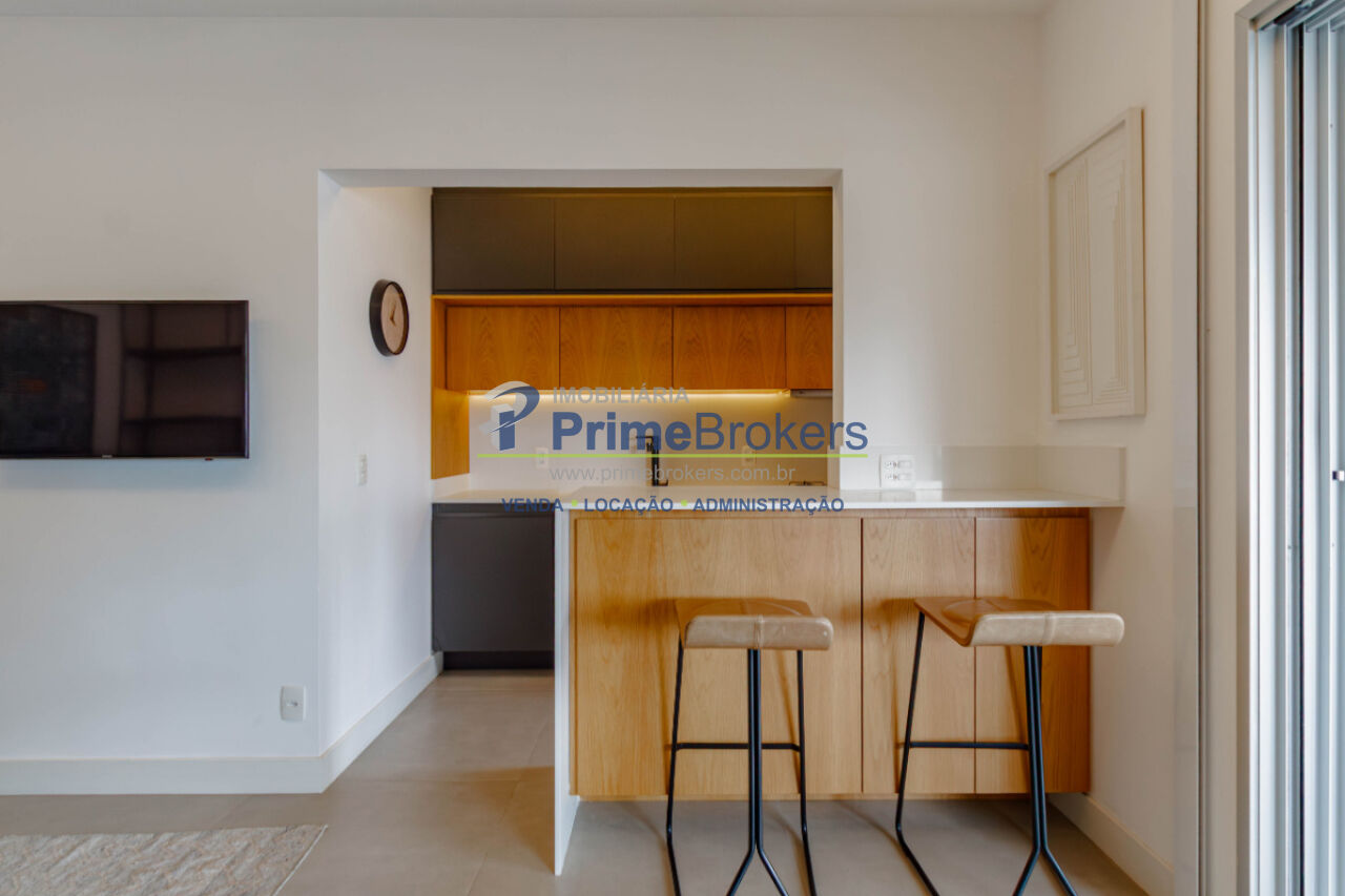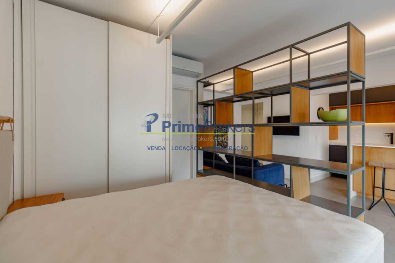 Viva o melhor de São Paulo neste grande estúdio de luxo, mobiliado e decorado, com 62m² privativos. É o cenário ideal para uma vida prática e vibrante. O projeto inteligente integra sala, quarto (com suíte) e cozinha equipada, separados por uma estante vazada, criando ambientes aconchehantes. O grande destaque é a ampla varanda gourmet envidraçada com churrasqueira, frigobar e área de estar, perfeita para entretenimento com entrada de luz e vista livre.