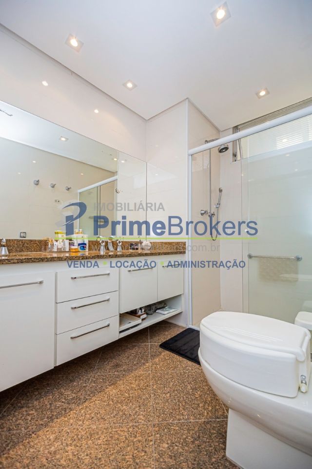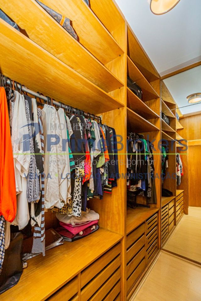 A suíte master é super espaçosa, com walking closet ao centro com o pé direito alto. A esquerda, o dormitório com grandes janelas, mesa de trabalho, bancada de madeira que circunda até a cabeceira, gavetas dão organização e praticidade. Um sofá de apoio com grandes espelhos tornam o ambiente agradável e bastante útil. O banheiro é generoso em espaço e sofisticação, com pias para o Sr. e Sra., aquecimento a gás, ventilação natural, iluminação embutida, armários sob medida e grande espelho.