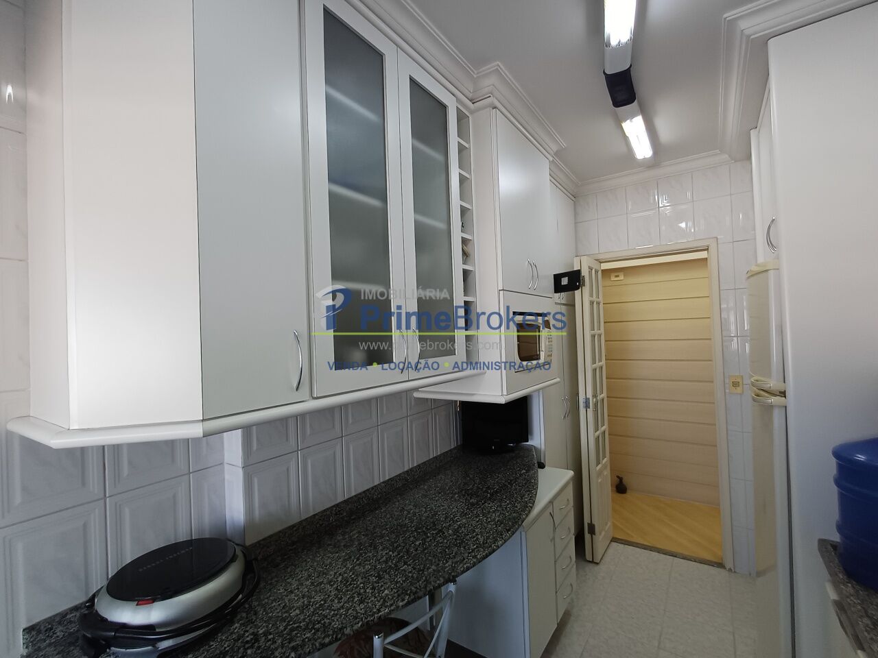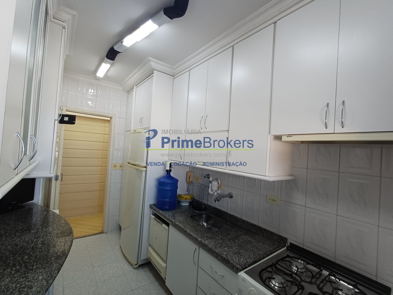A cozinha é completa, com muitos armários e área de serviço independente.