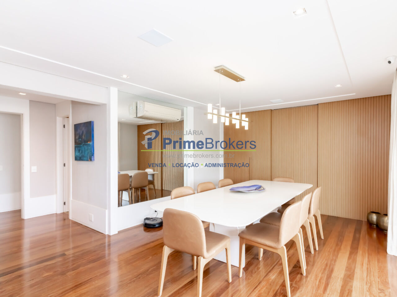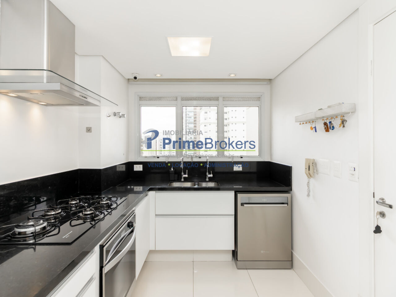 Varanda ampla com vista, 3 suítes (sendo uma máster com closet e banheira), sala em dois ambientes, lavabo, cozinha planejada, móveis planejados, área de serviço, despensa, hall e elevador privativos, 4 vagas de garagem, depósito privativo, ar condicionado central, gás encanado, interfone, home theater