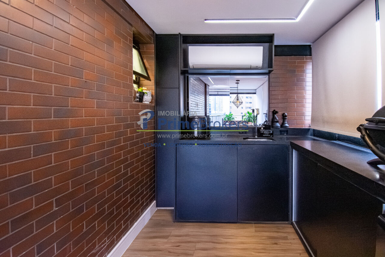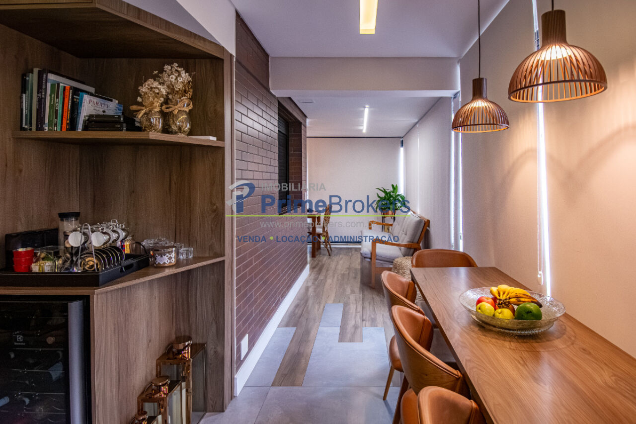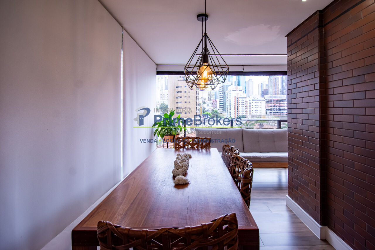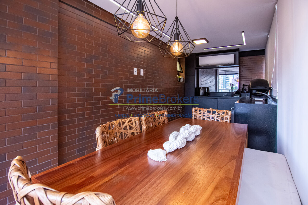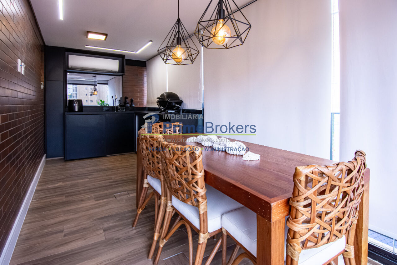 Esse apê tem um terraço gourmet charmoso e bem convidativo para reunir amigos para um bom churrasco e curtir uma partida de tênis, já que o condomínio tem uma bela quadra, além de piscina aquecida, academia de ginástica super equipada e piscina externa com borda infinita.