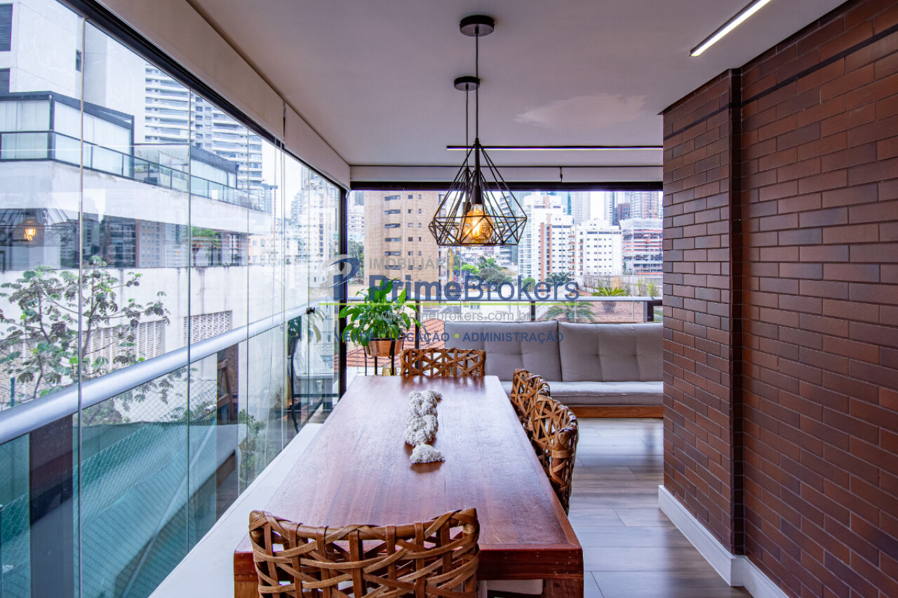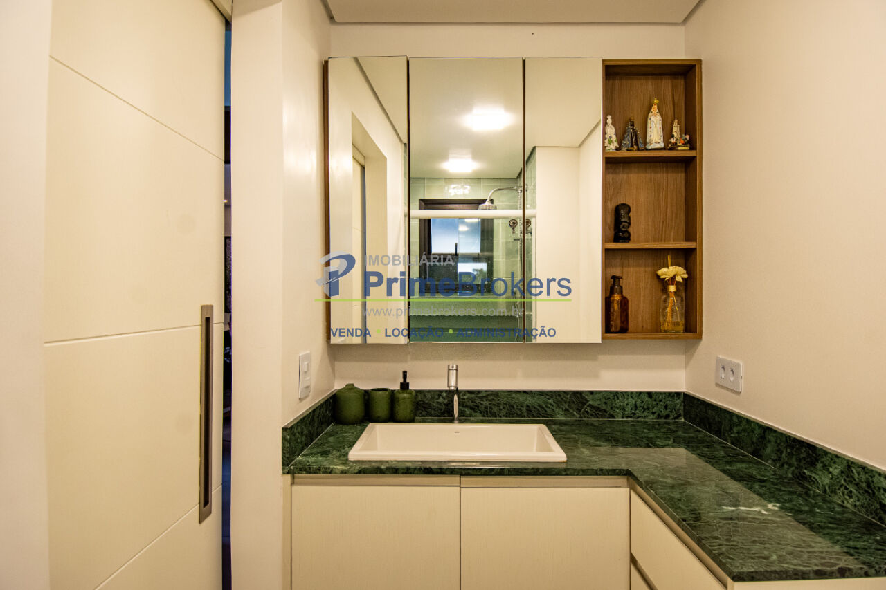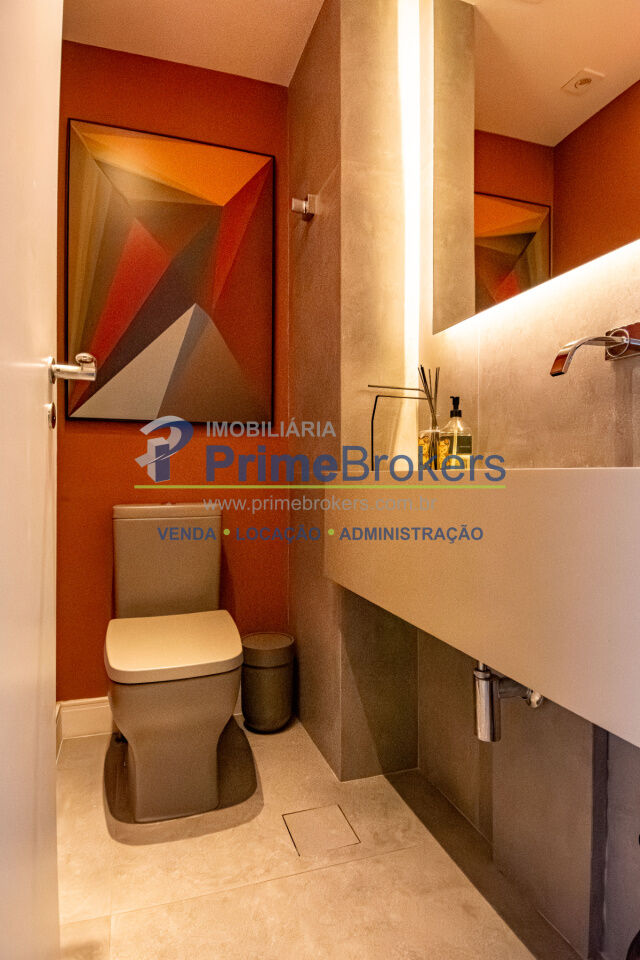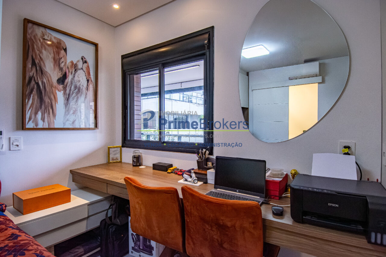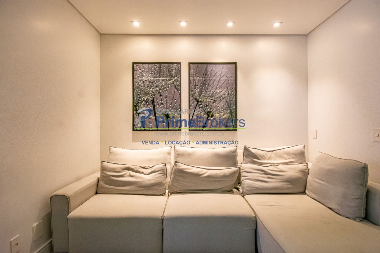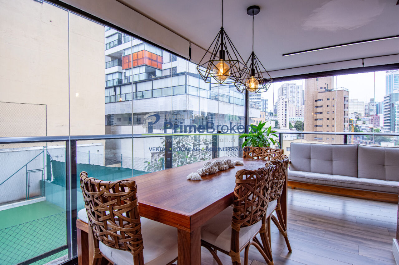 Esse apê tem um terraço gourmet charmoso e bem convidativo para reunir amigos para um bom churrasco e curtir uma partida de tênis, já que o condomínio tem uma bela quadra, além de piscina aquecida, academia de ginástica super equipada e piscina externa com borda infinita.