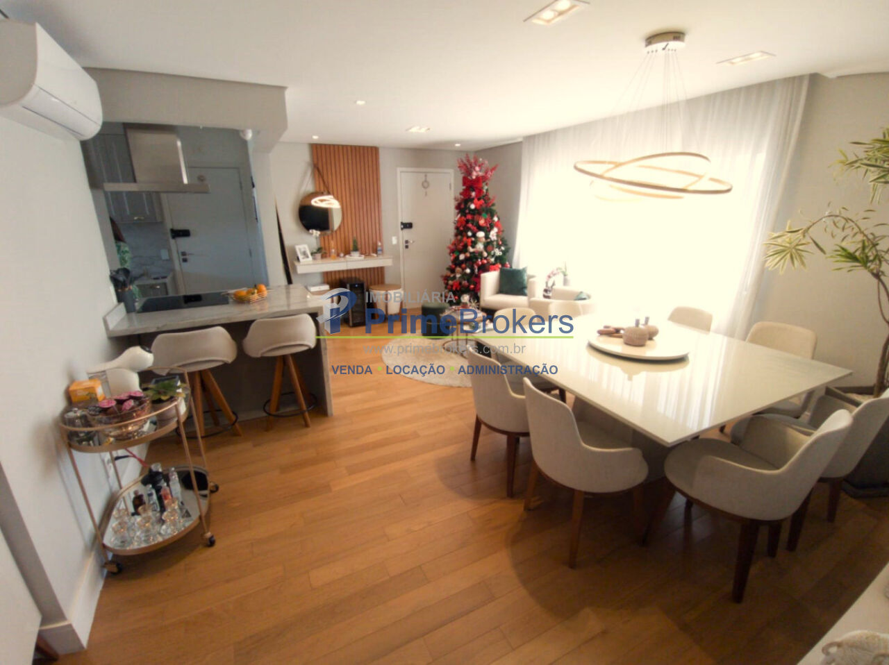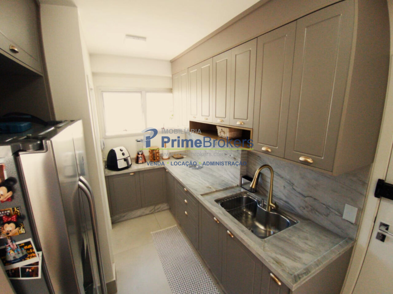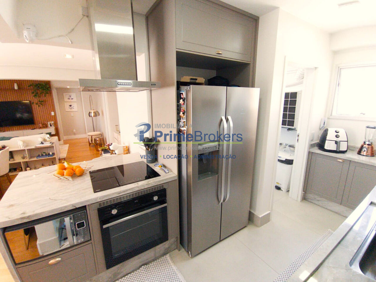 a funcionalidade. Com piso em porcelanato, a cozinha é planejada para integrar-se perfeitamente à ampla sala de