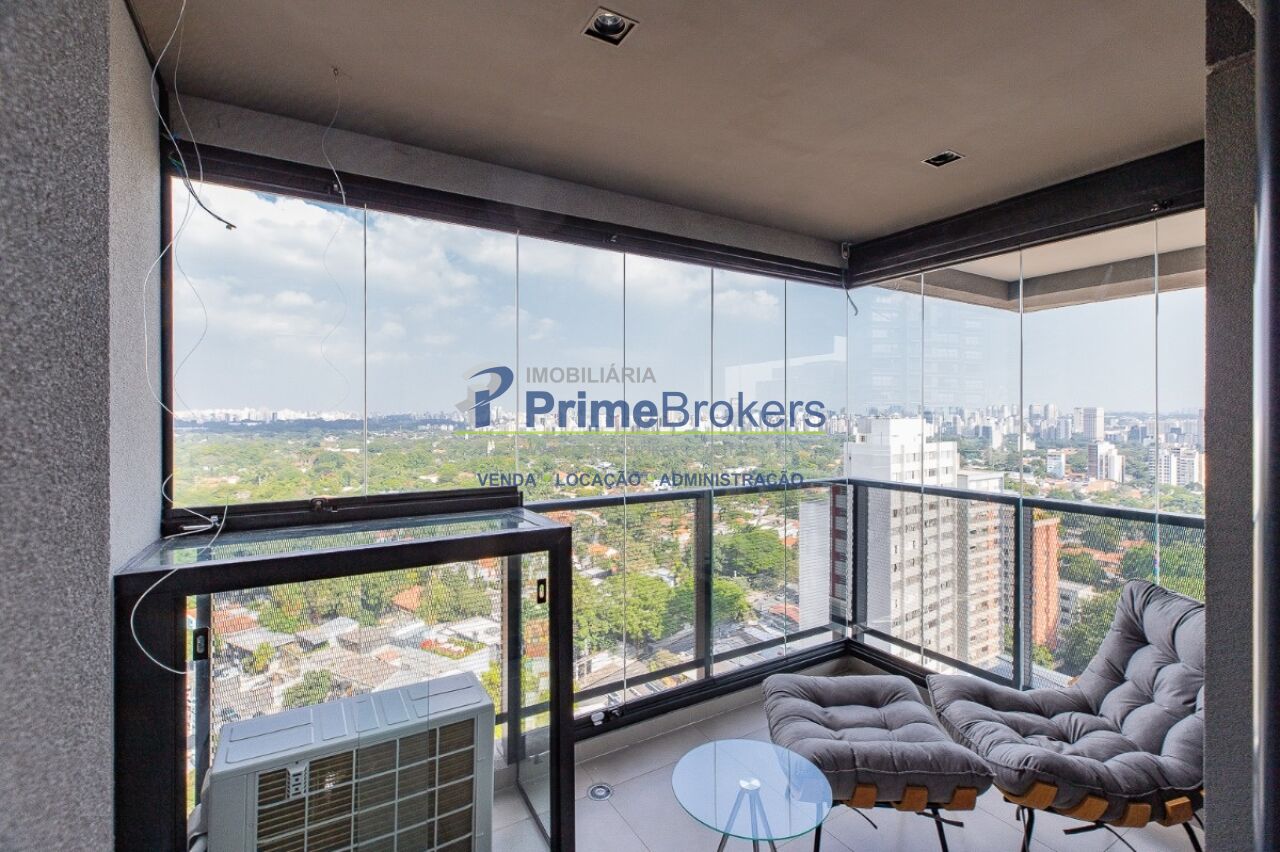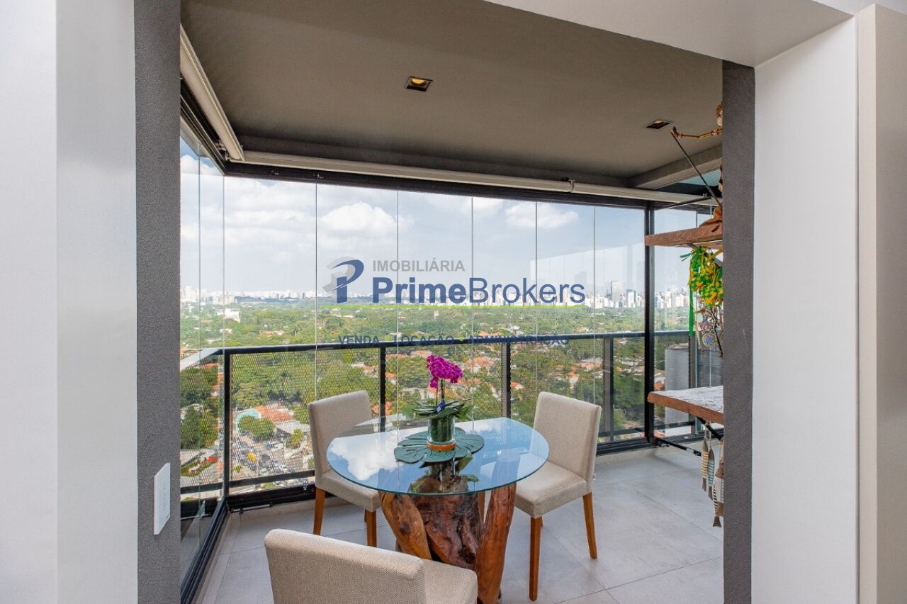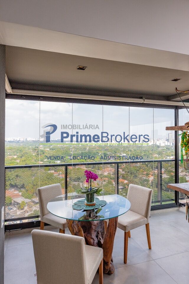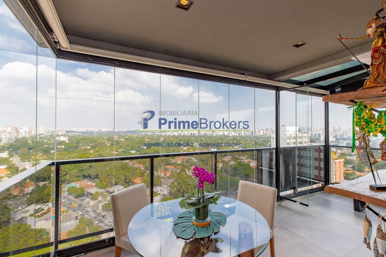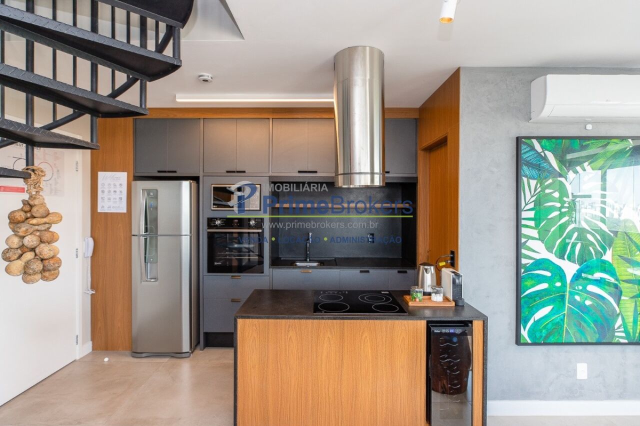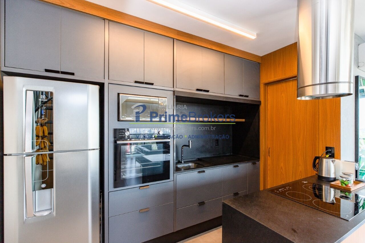 1 suíte com varanda envidraçada e TV retrátil, automação e controle por voz, mobiliado de requinte, cozinha americana completa com ilha e eletrodomésticos, lavabo, armários planejados, ar-condicionado em todos os ambientes, janelas teto-chão com vista para cidade, aquecimento de toalhas, piso de tacos restaurados, fechadura eletrônica, 1 vaga de garagem