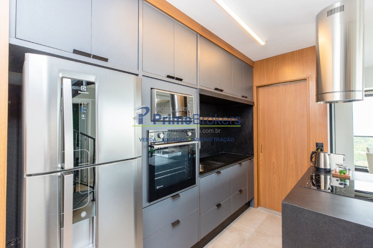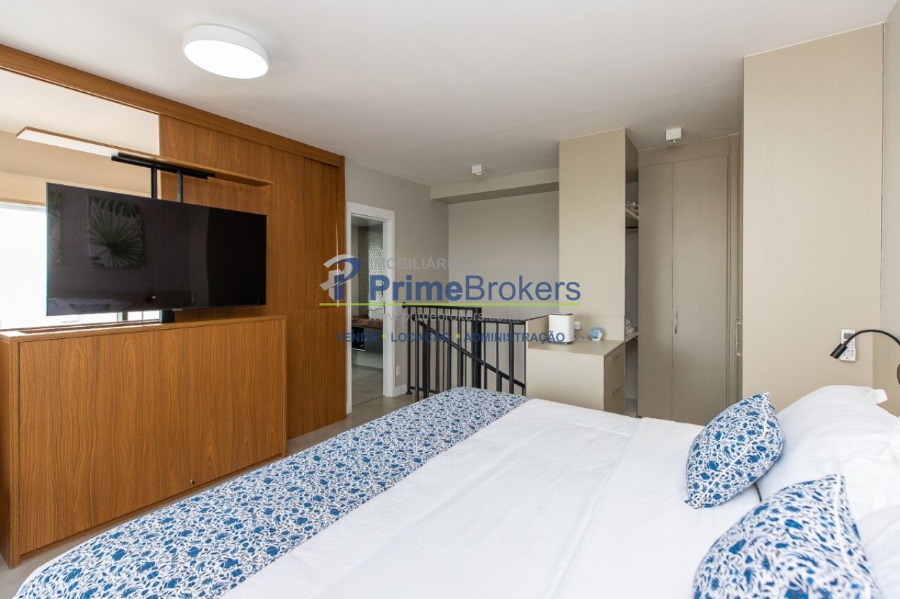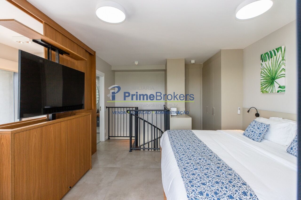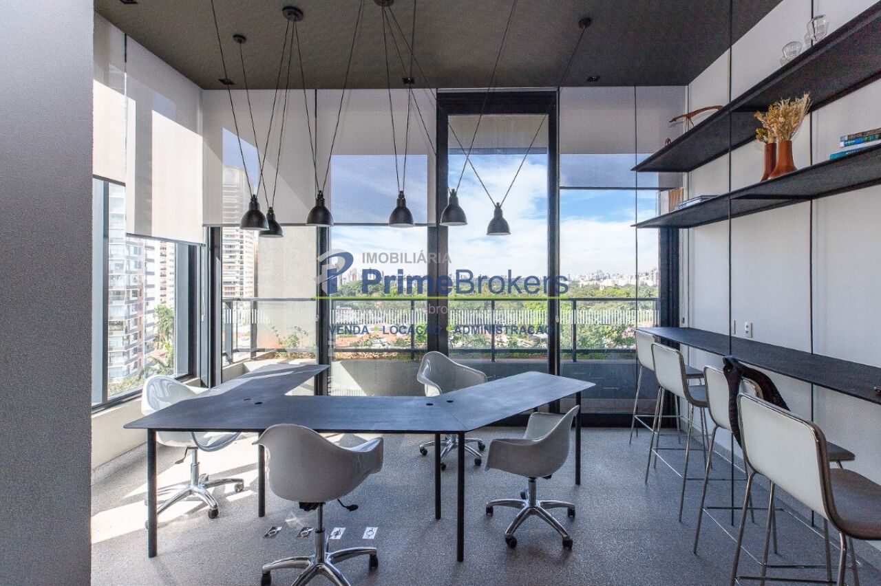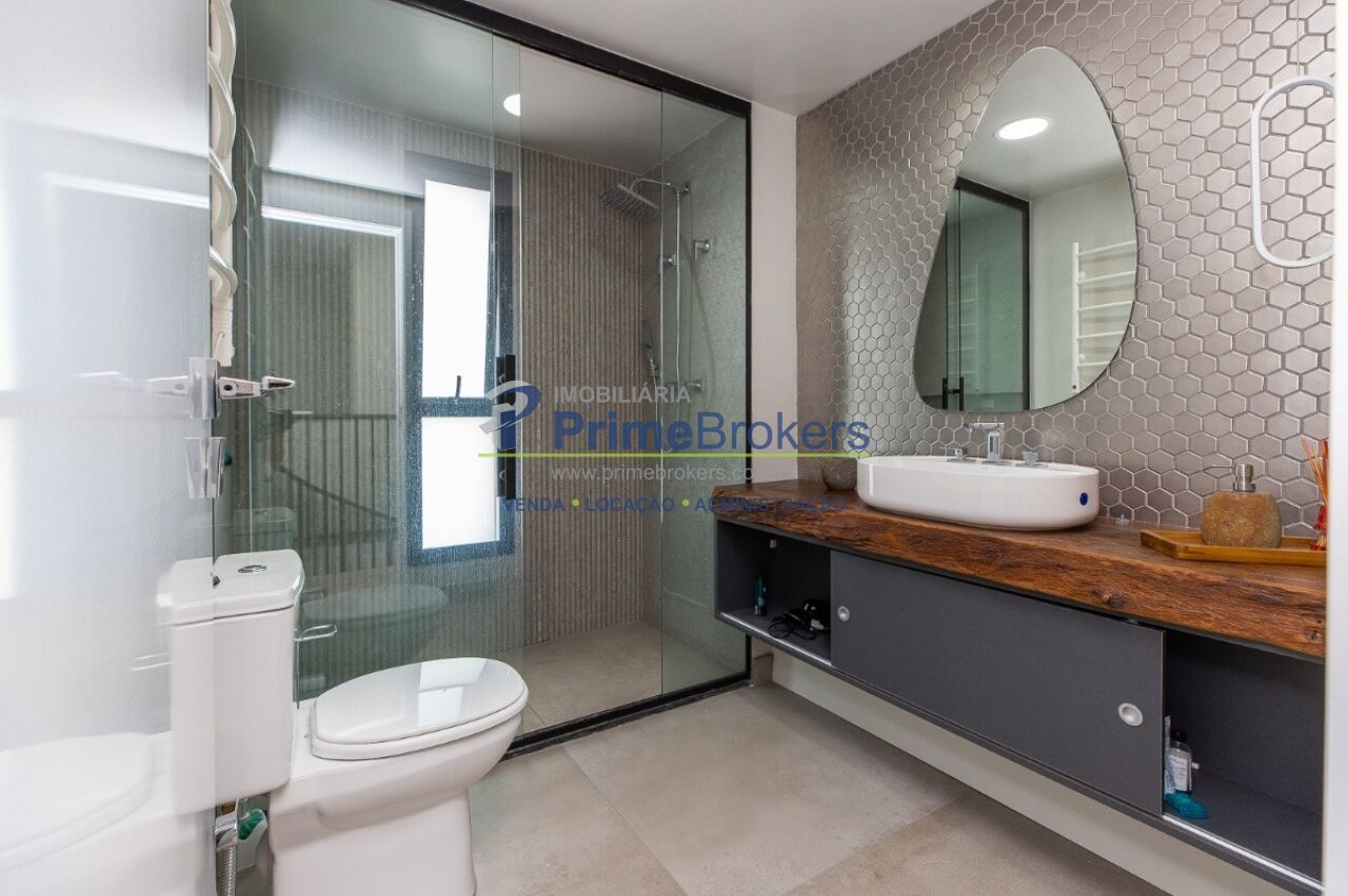 1 suíte com varanda envidraçada e TV retrátil, automação e controle por voz, mobiliado de requinte, cozinha americana completa com ilha e eletrodomésticos, lavabo, armários planejados, ar-condicionado em todos os ambientes, janelas teto-chão com vista para cidade, aquecimento de toalhas, piso de tacos restaurados, fechadura eletrônica, 1 vaga de garagem