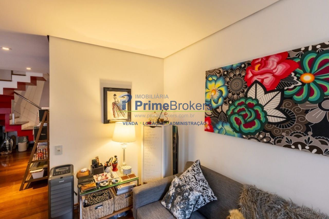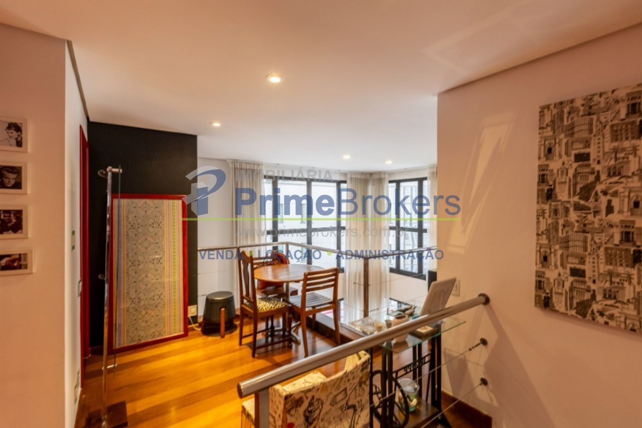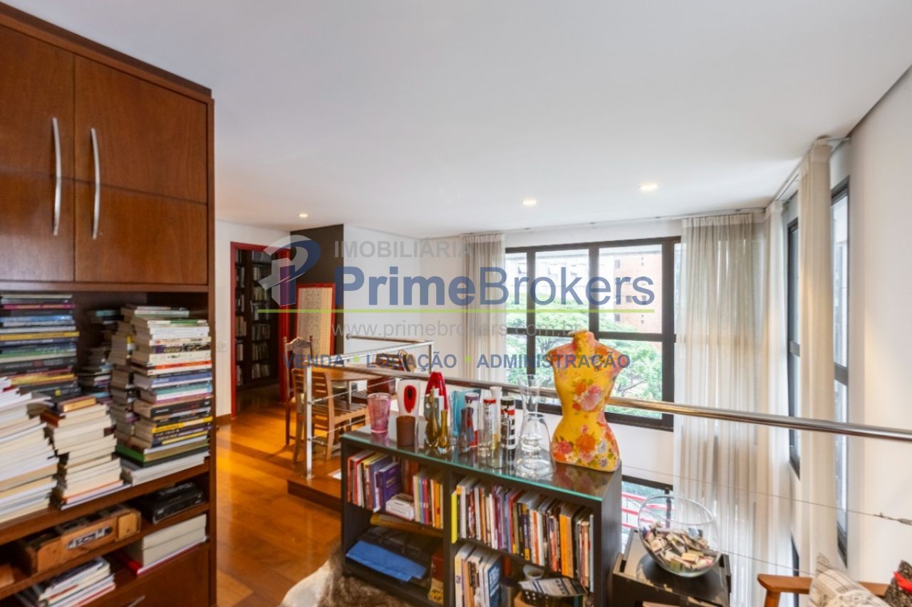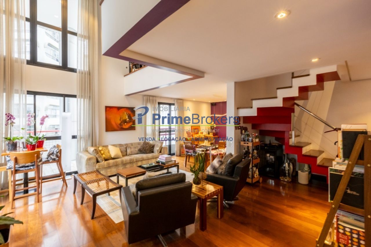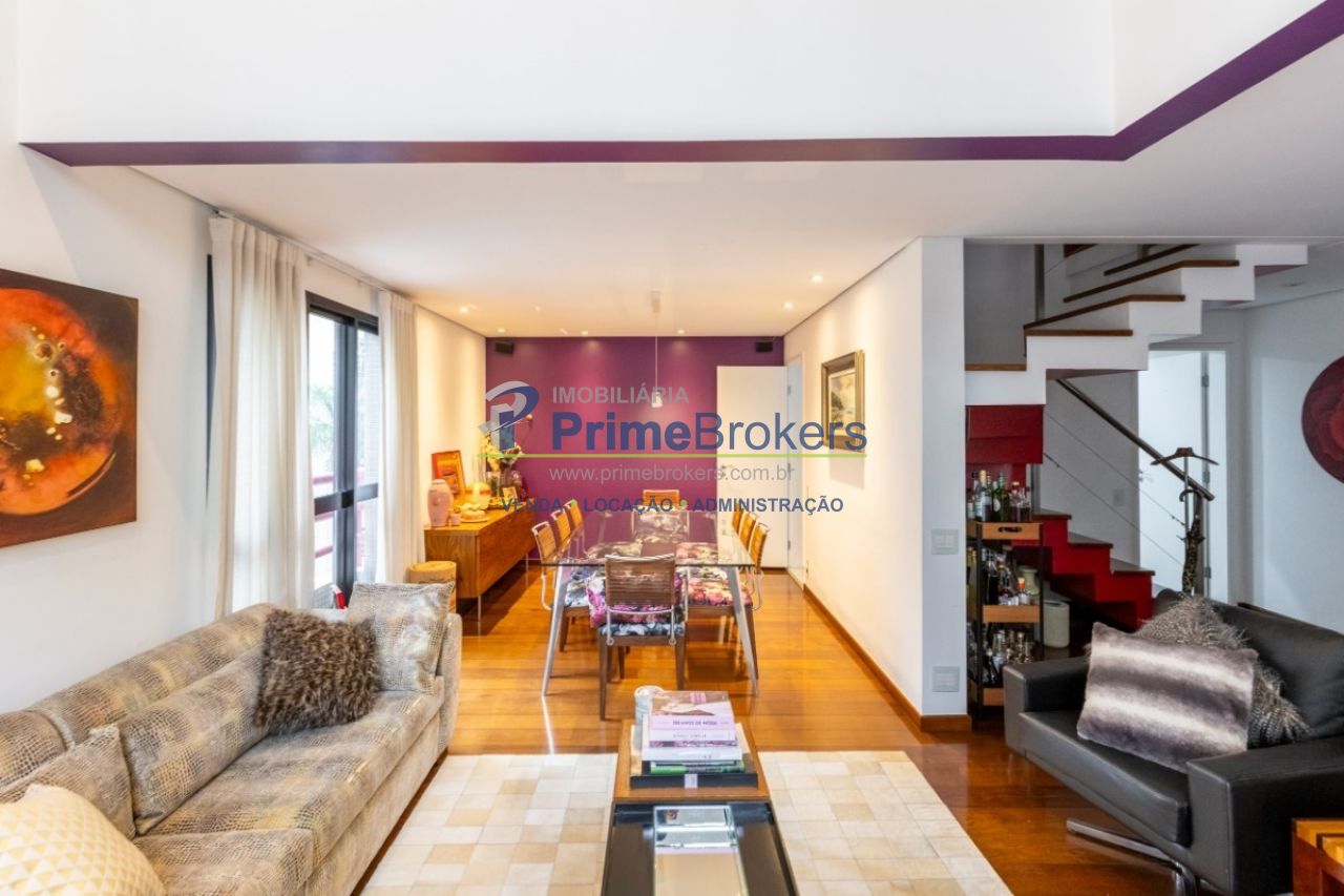 Duplex, living com pé-direito duplo e varanda, sala de TV, sala de jantar, suíte master com sacada, atelier com banheiro privativo, escritório, 2 vagas, depósito