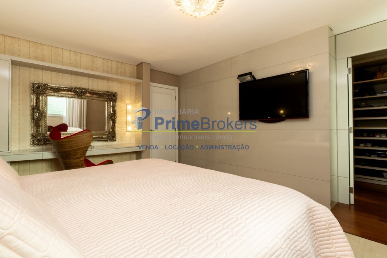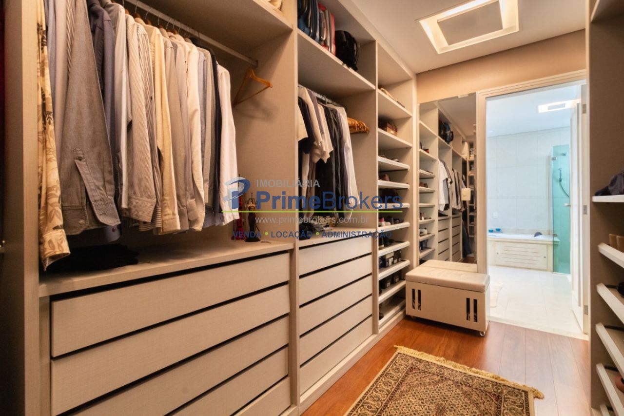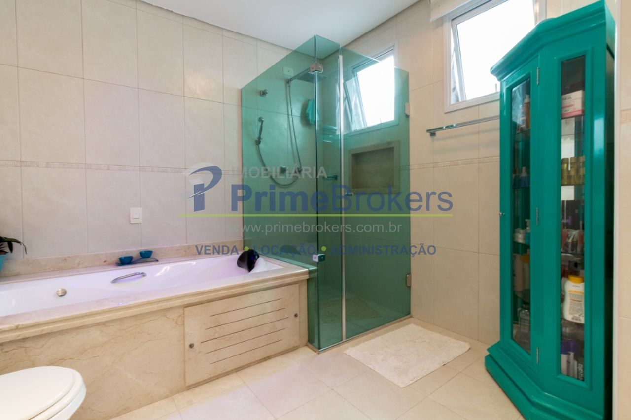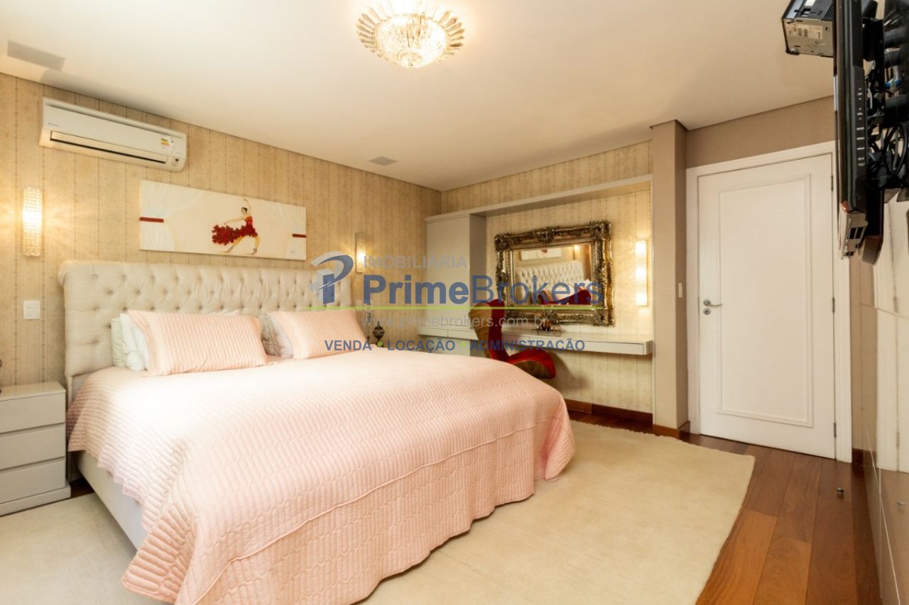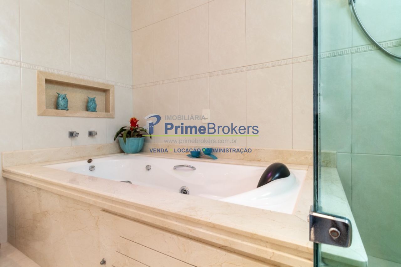 2 suítes master com hidromassagem, espaço gourmet com jacuzzi e churrasqueira, sala cinema, sala de TV com varanda, ofurô, 4 vagas de garagem, 5 banheiros, ar-condicionado, móveis planejados, mobiliado, alarme, água quente, piso de madeira, sacada, copa, depósito, infraestrutura para ar-condicionado, interfone, banheiro de serviço