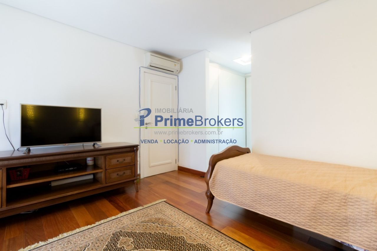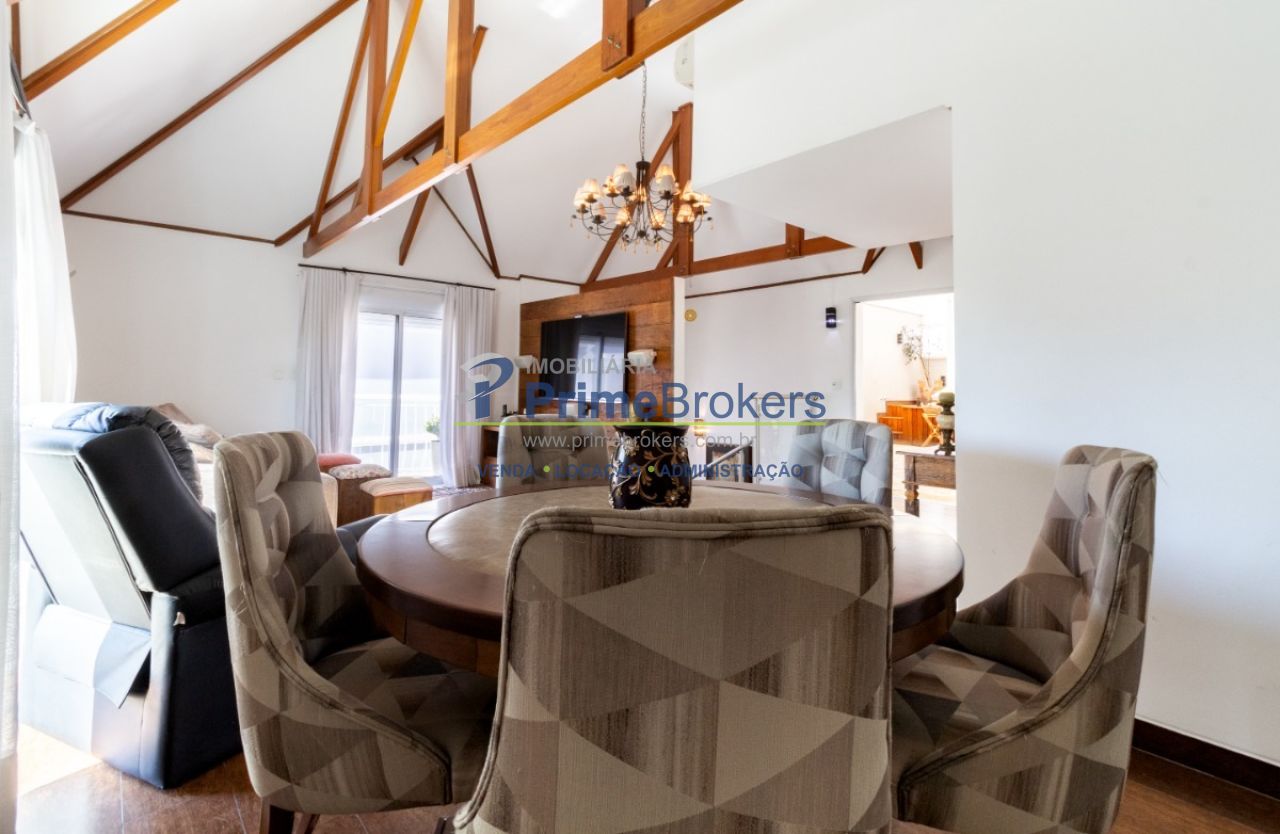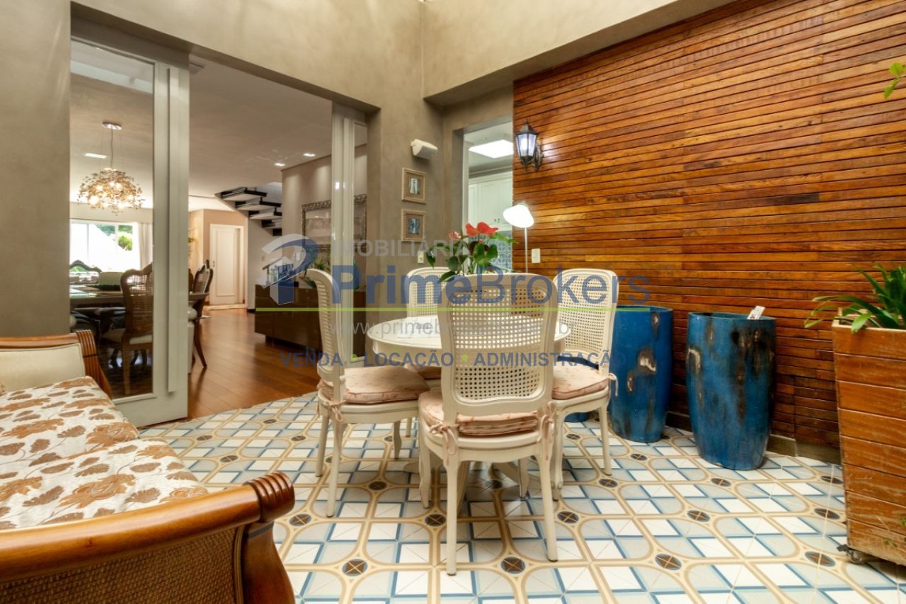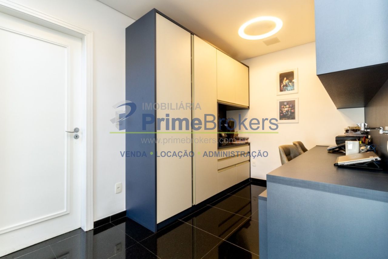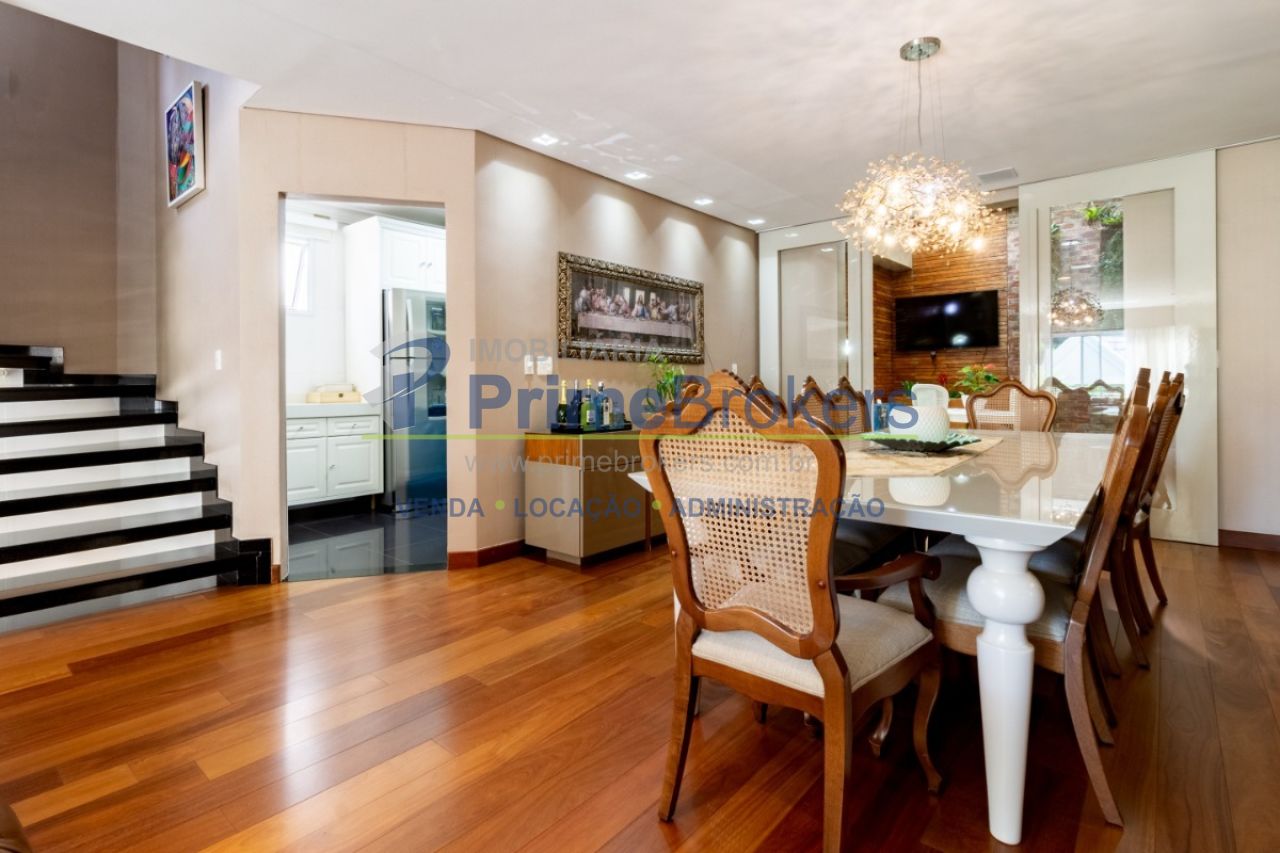 2 suítes master com hidromassagem, espaço gourmet com jacuzzi e churrasqueira, sala cinema, sala de TV com varanda, ofurô, 4 vagas de garagem, 5 banheiros, ar-condicionado, móveis planejados, mobiliado, alarme, água quente, piso de madeira, sacada, copa, depósito, infraestrutura para ar-condicionado, interfone, banheiro de serviço