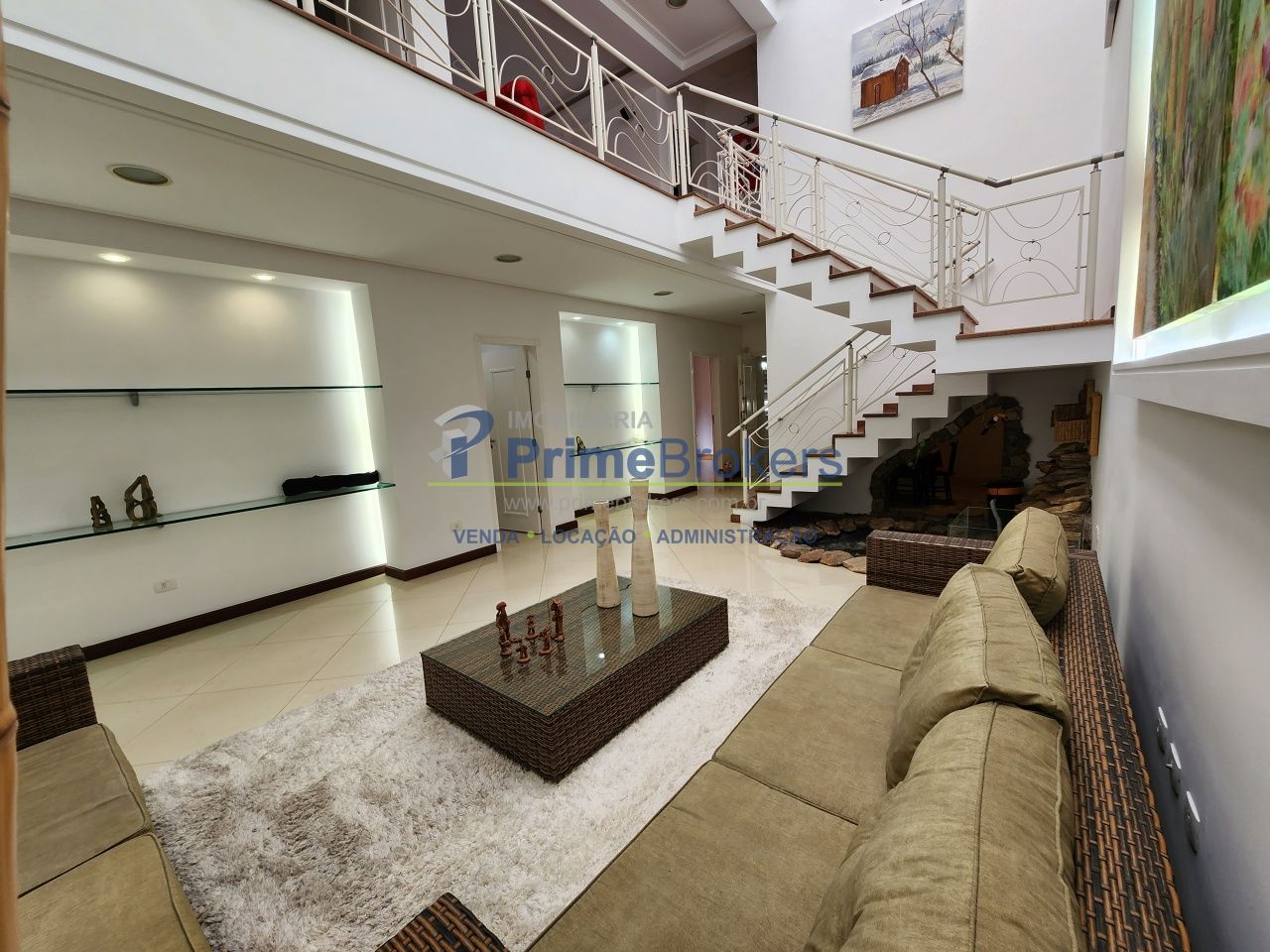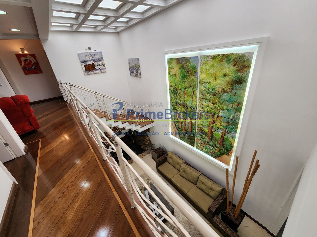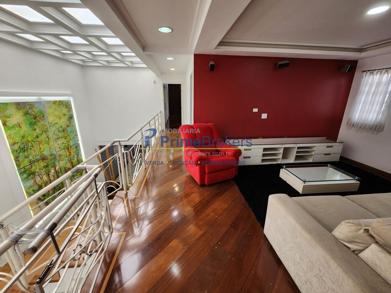 O acesso ao andar superior, abastecida pela iluminação da claraboia, encontra-se um Home Theater com som integrado.