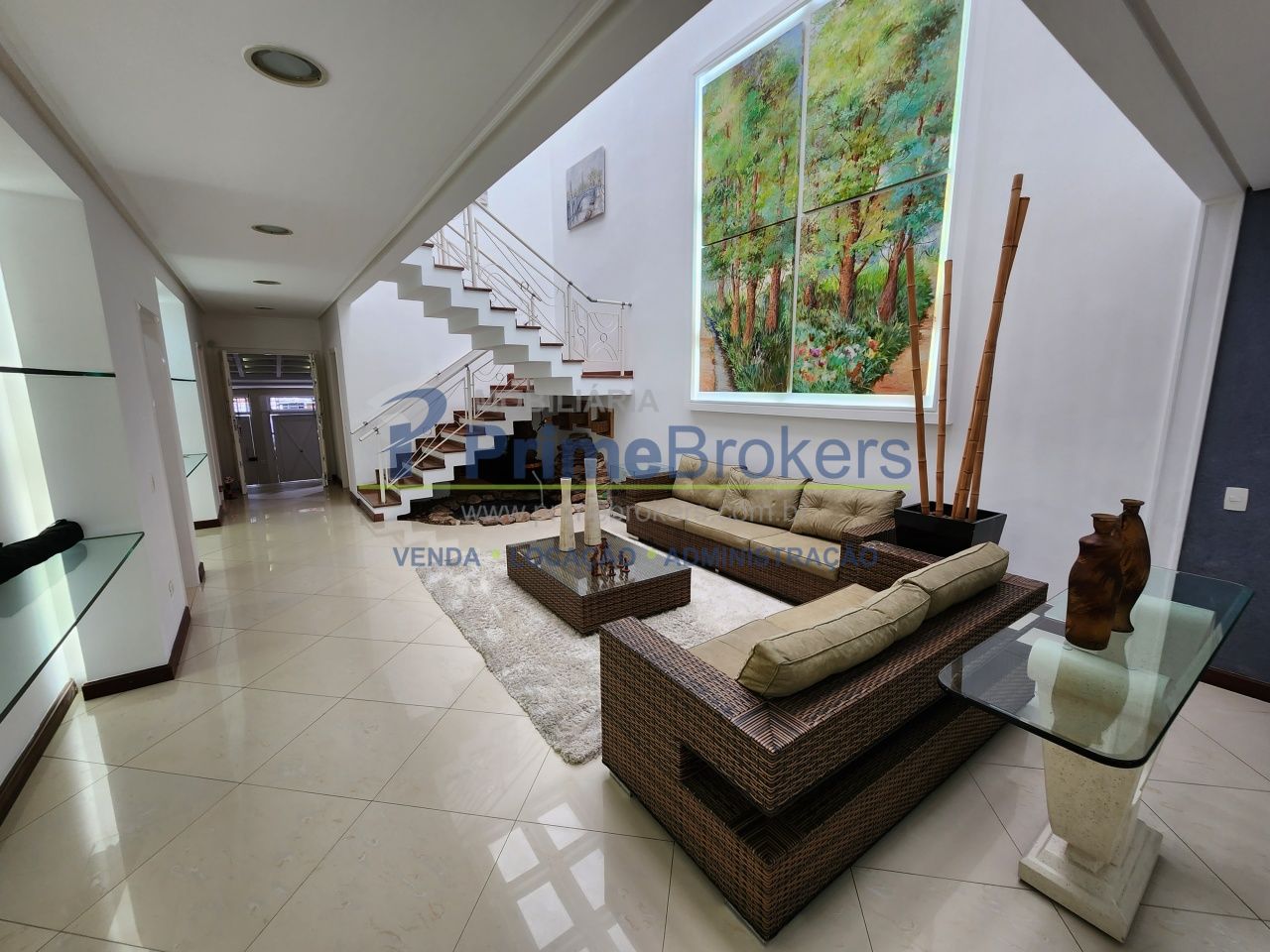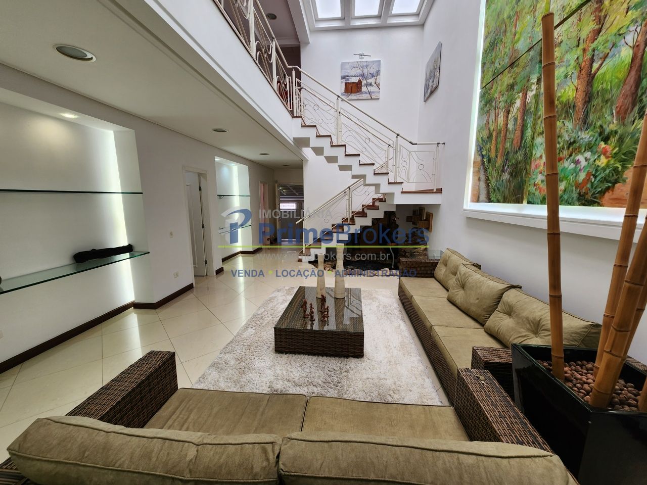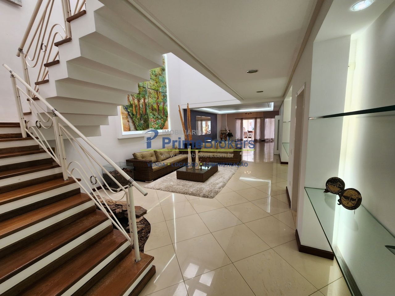 O acesso ao andar superior, abastecida pela iluminação da claraboia, encontra-se um Home Theater com som integrado.