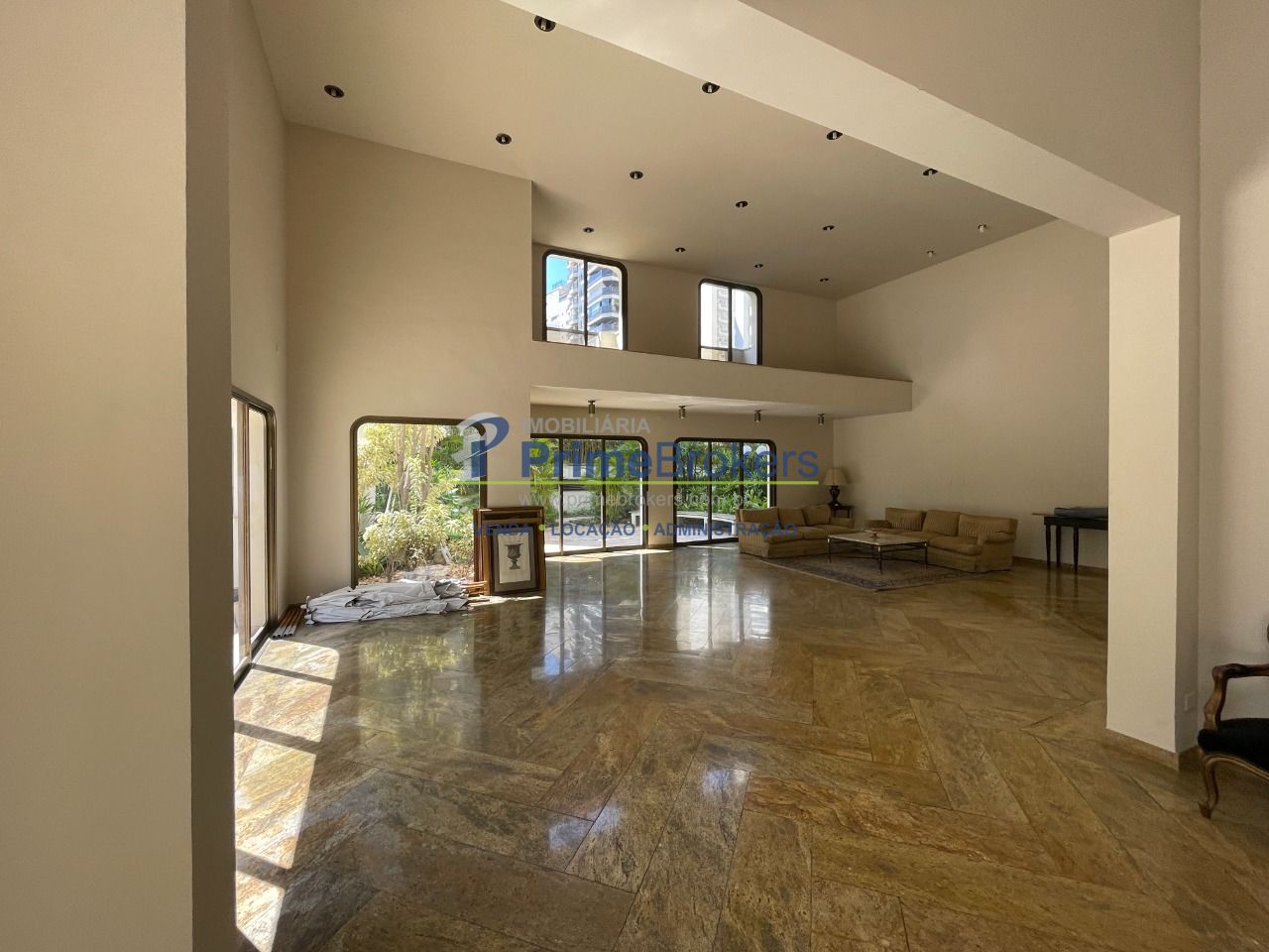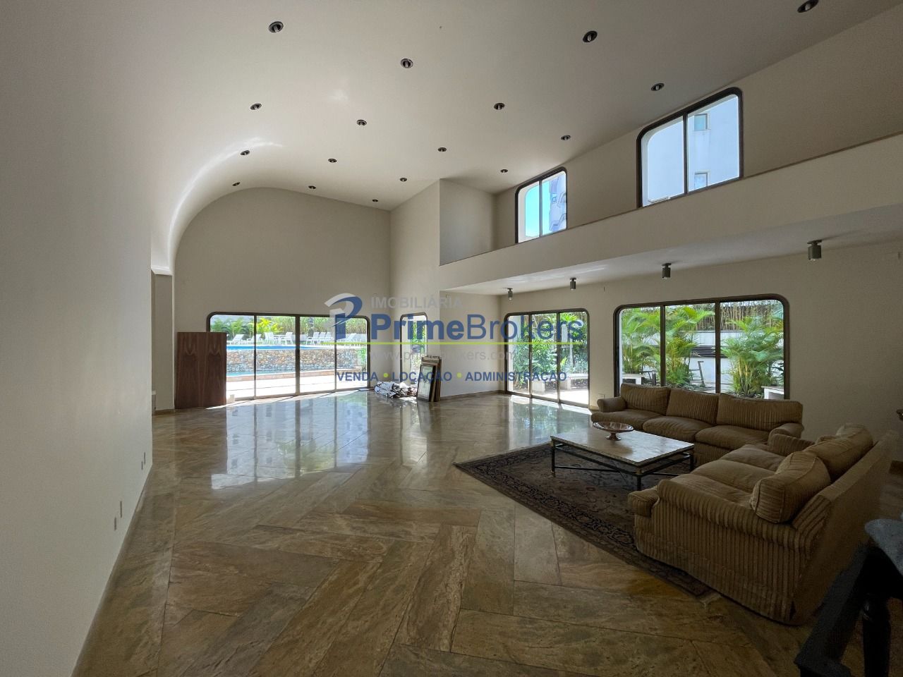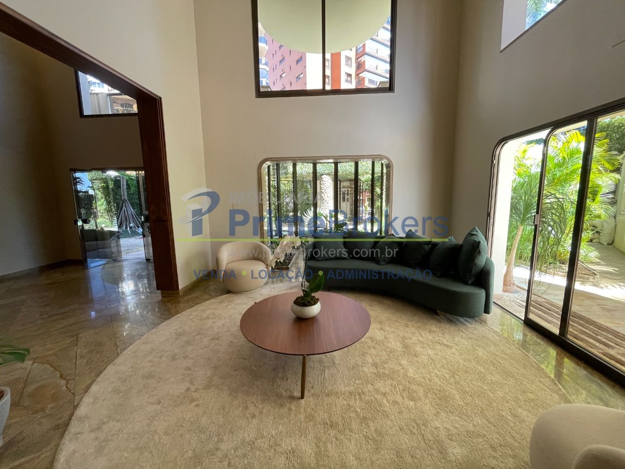 O coração da cobertura é essa sala imponente, com pé-direito alto, ar-