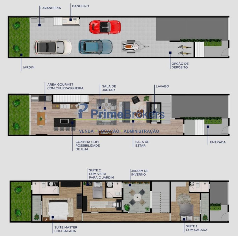 Conta com ambientes integrados (salas e cozinha) em 70m² somente no térreo, incluindo área gourmet com churrasqueira.