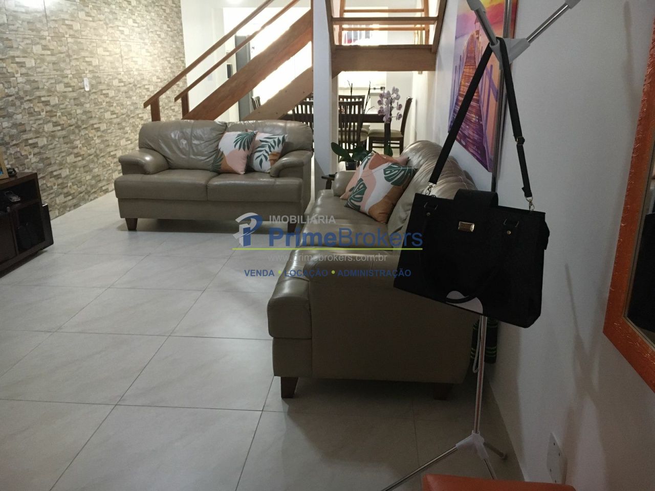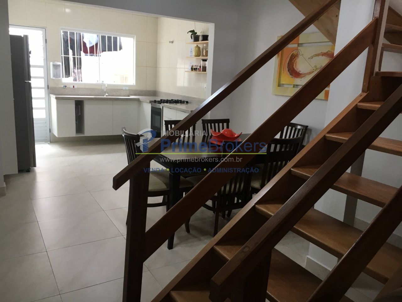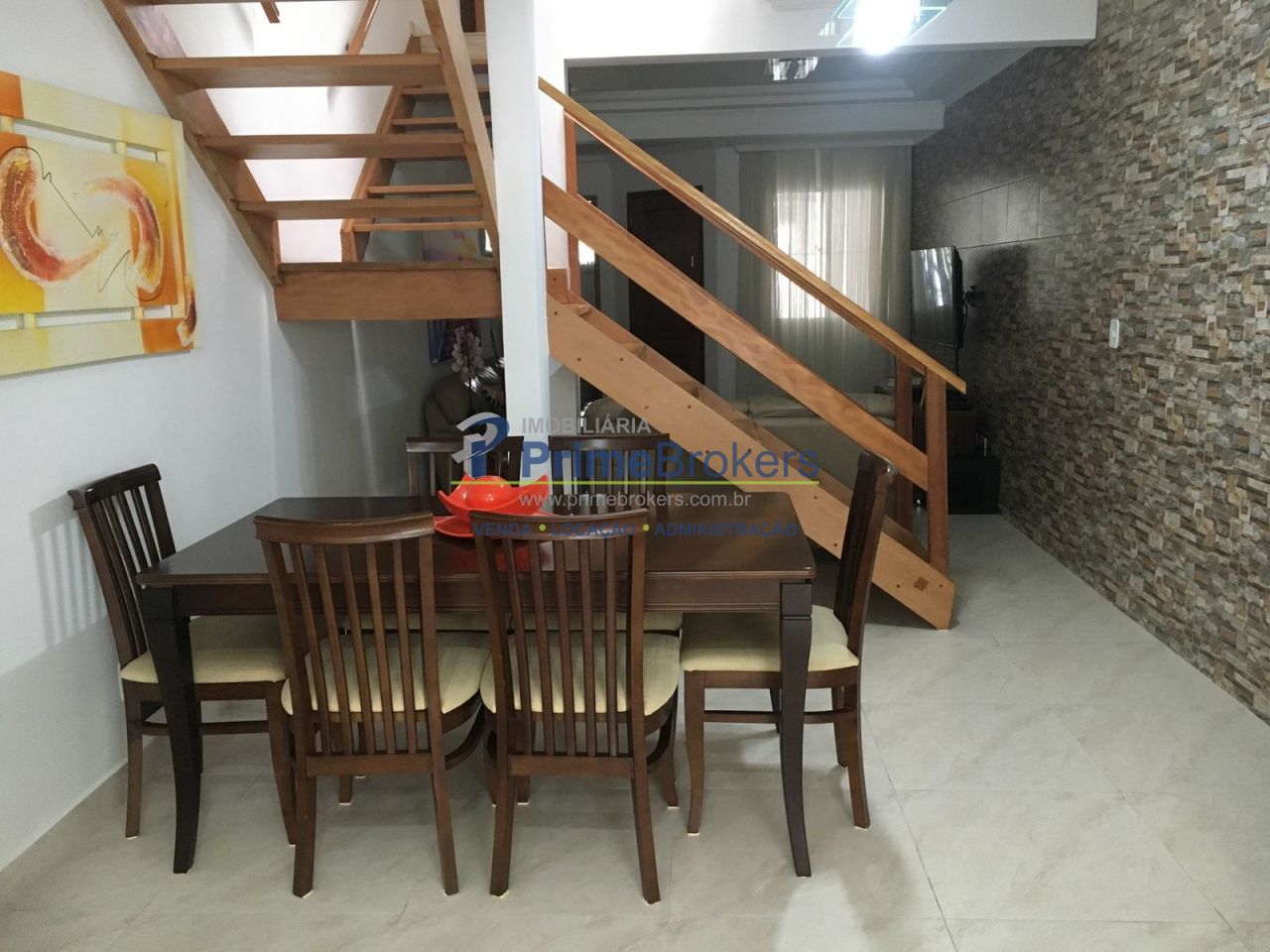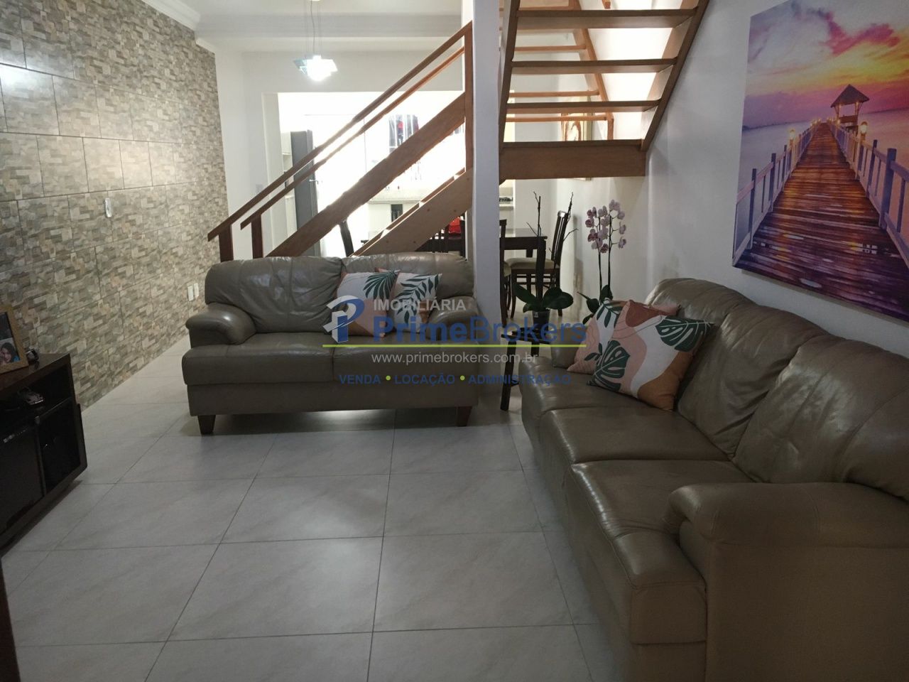 Sobrado à venda com 93 m², 3 dormitórios sendo 2 suítes, sala 2 ambientes integrada com a cozinha, lavabo, área de serviço e duas vagas cobertas de garagem.