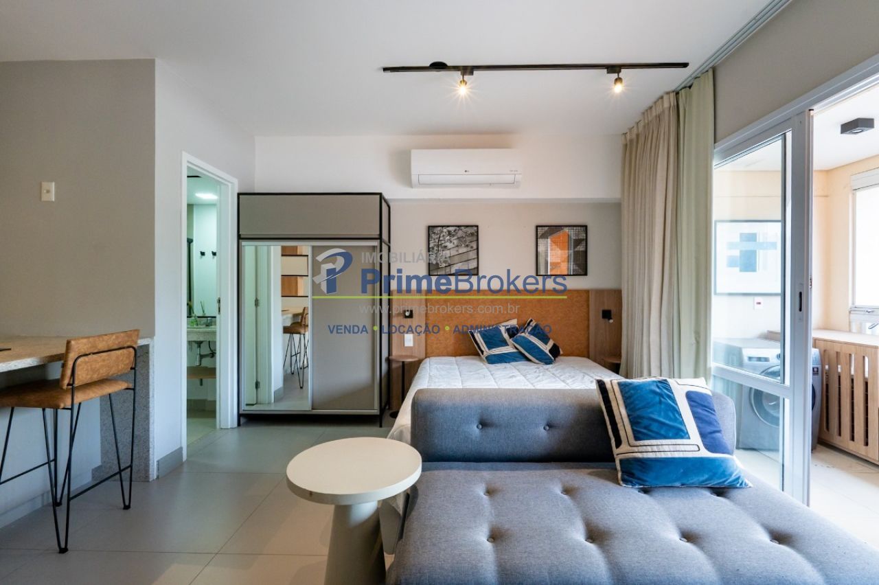 Studio Mobiliado (Cama, Sofá, Armários), Cozinha Equipada (Micro-ondas, Cooktop, Geladeira), Máquina de Lavar e Secar, Ar-Condicionado, TV Smart, Fechadura Eletrônica, 1 Vaga de Garagem