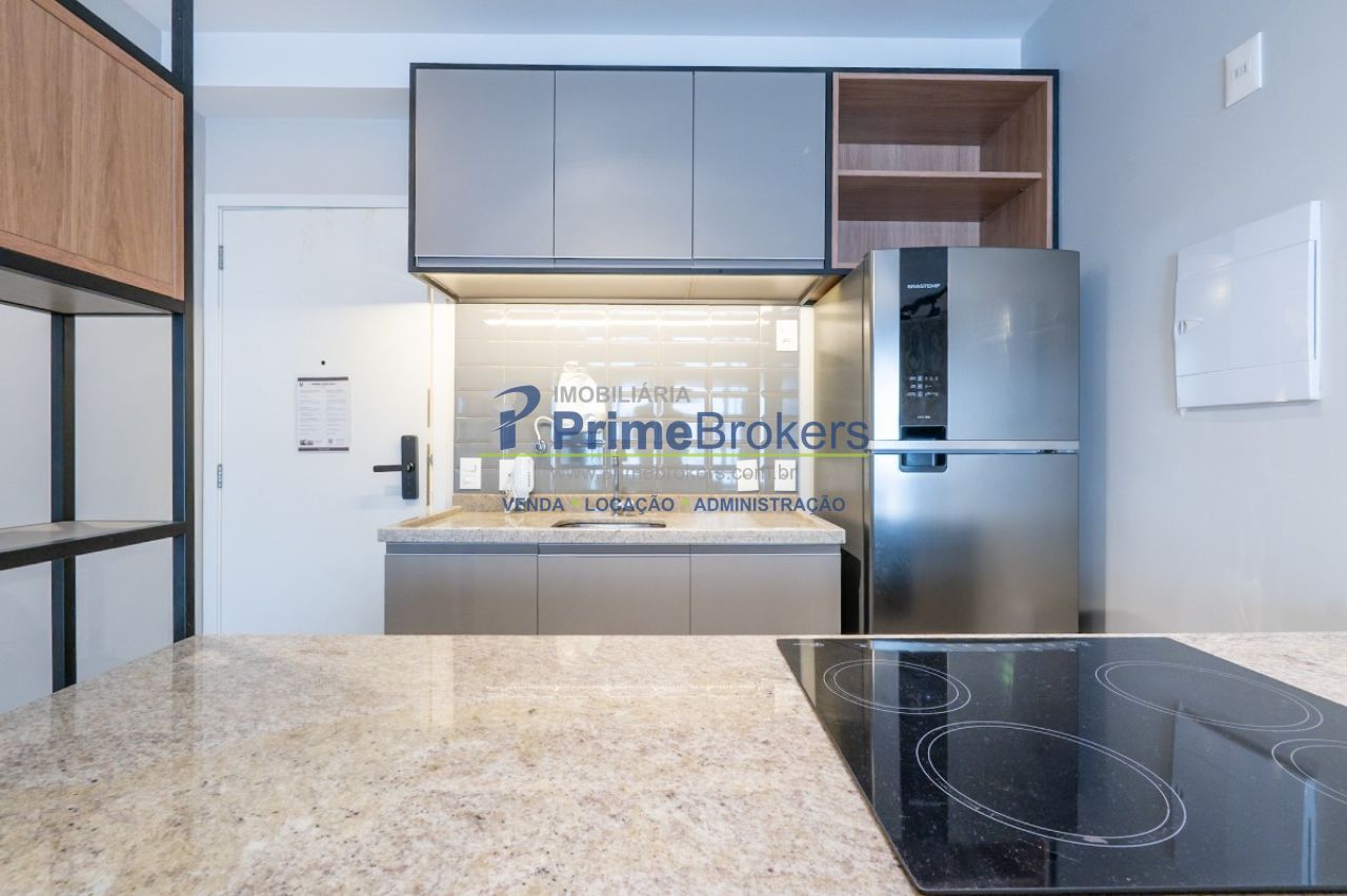 Studio Mobiliado (Cama, Sofá, Armários), Cozinha Equipada (Micro-ondas, Cooktop, Geladeira), Máquina de Lavar e Secar, Ar-Condicionado, TV Smart, Fechadura Eletrônica, 1 Vaga de Garagem