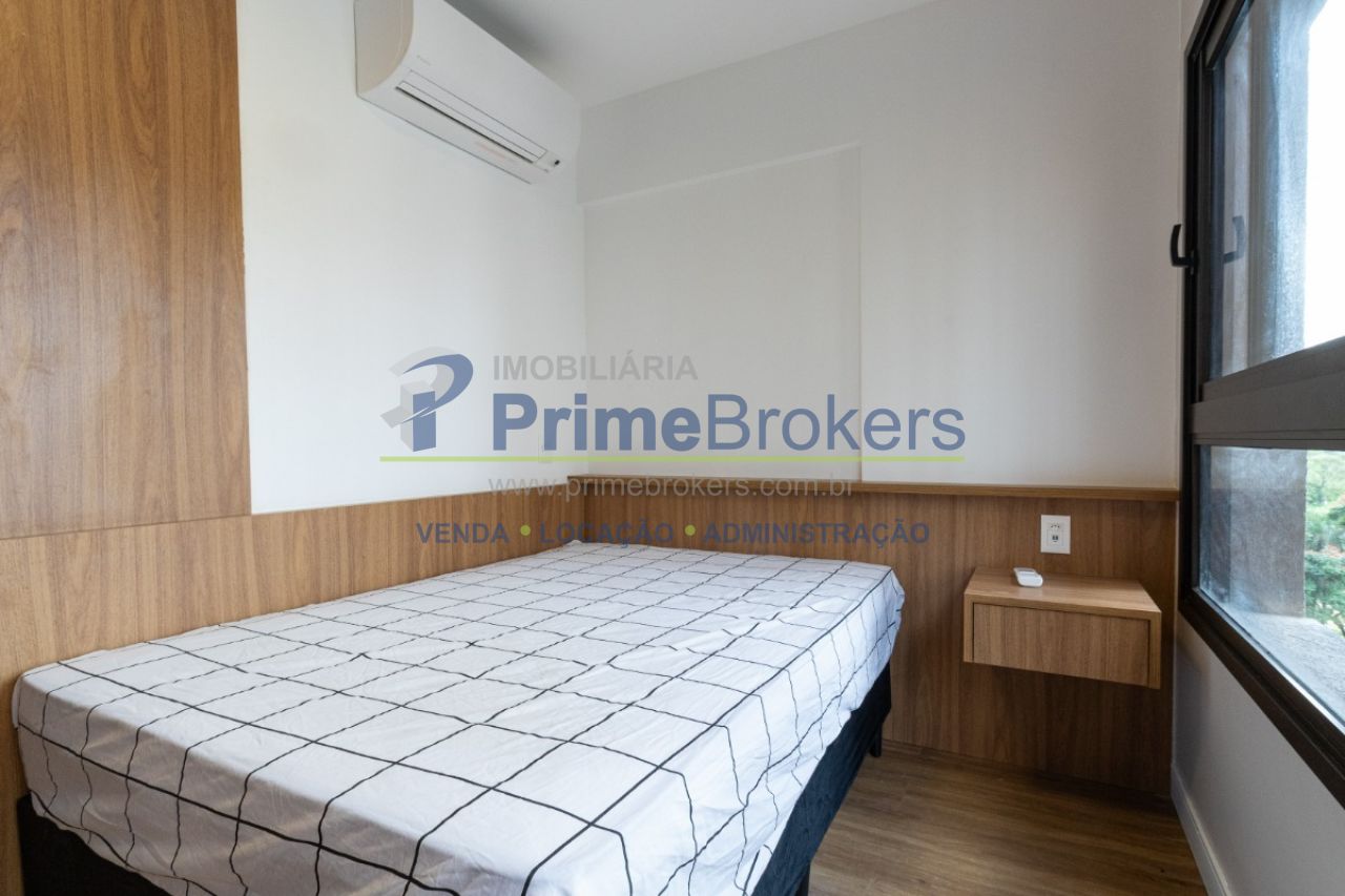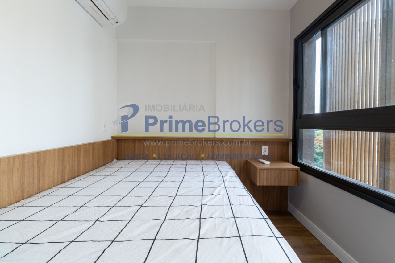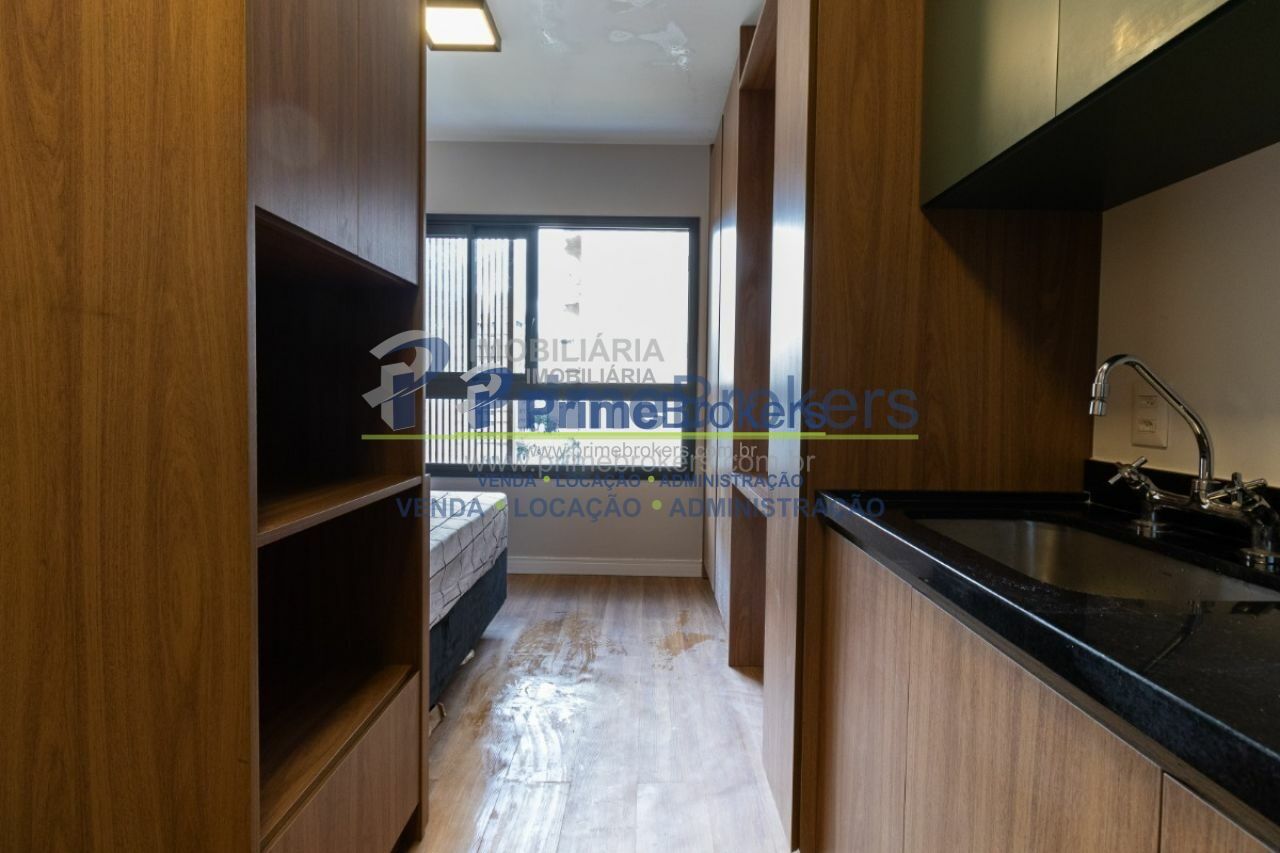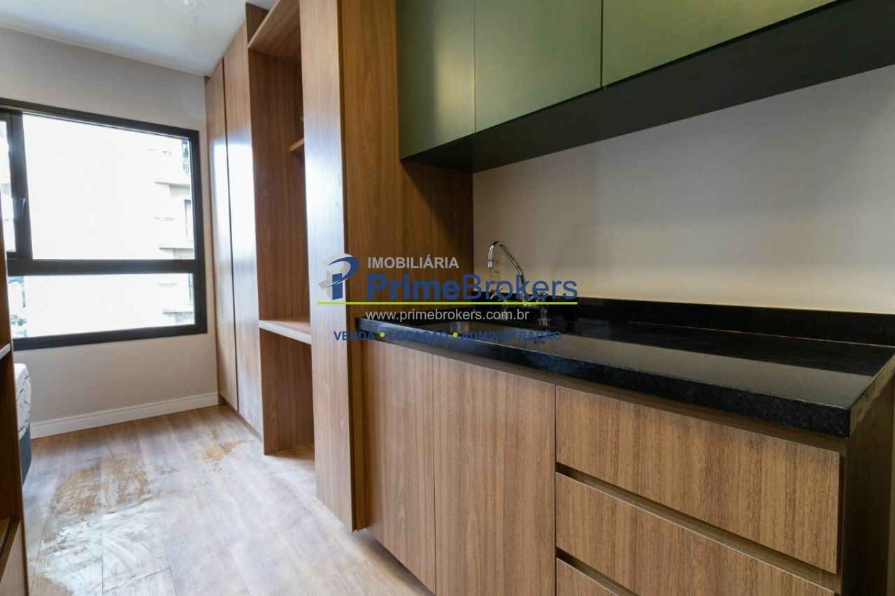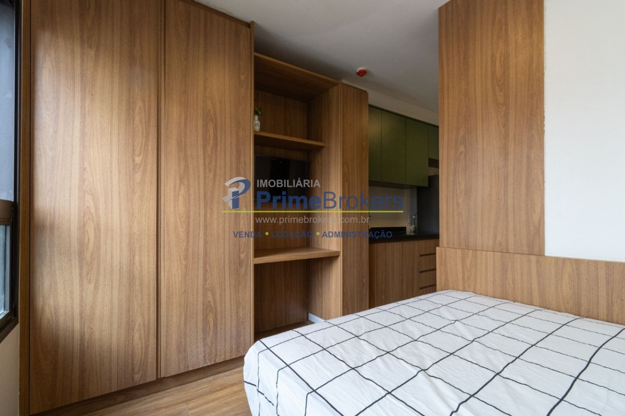 Studio de 20m² é totalmente mobiliado, repleto de armários e conta com ar-condicionado, além de fechadura eletrônica para maior segurança e praticidade.