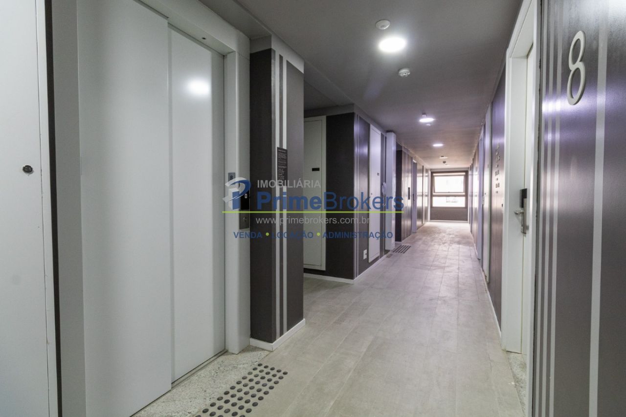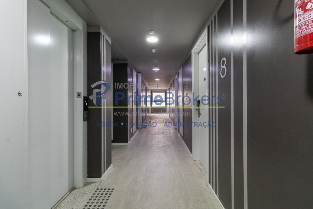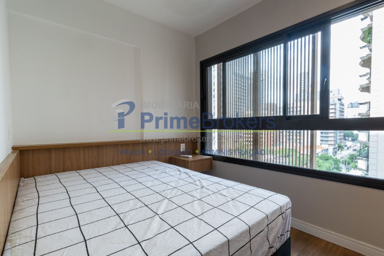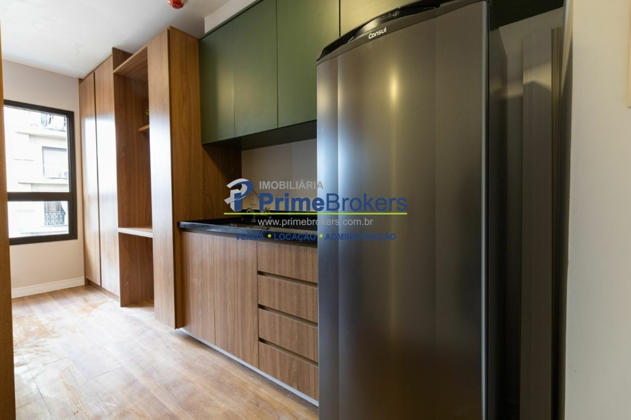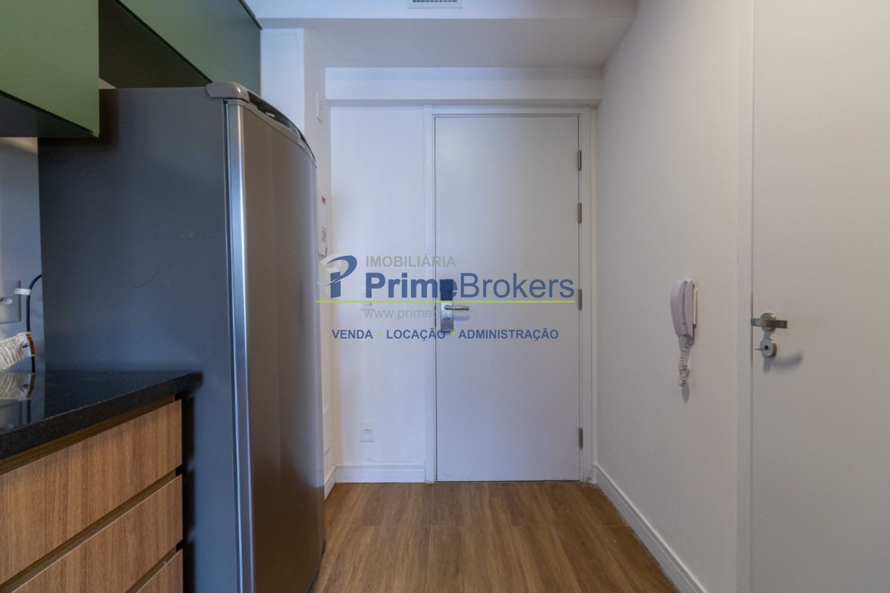Studio de 20m² é totalmente mobiliado, repleto de armários e conta com ar-condicionado, além de fechadura eletrônica para maior segurança e praticidade.
