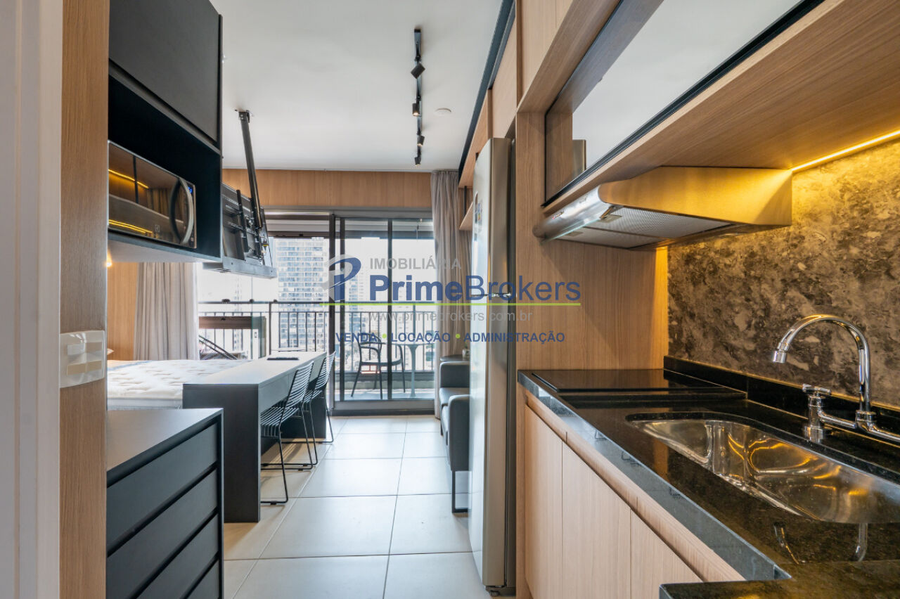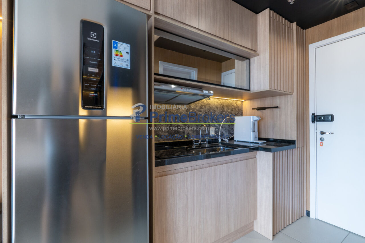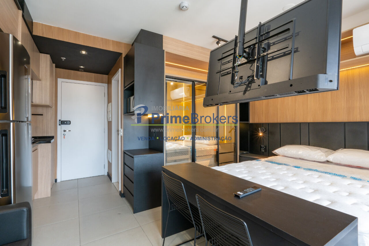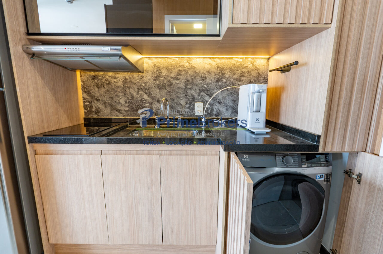 Studio totalmente mobiliado, varanda envidraçada, ar-condicionado instalado, armários embutidos, eletrodomésticos inclusos (geladeira, cooktop, micro-ondas, máquina lava e seca), acabamentos de alto padrão