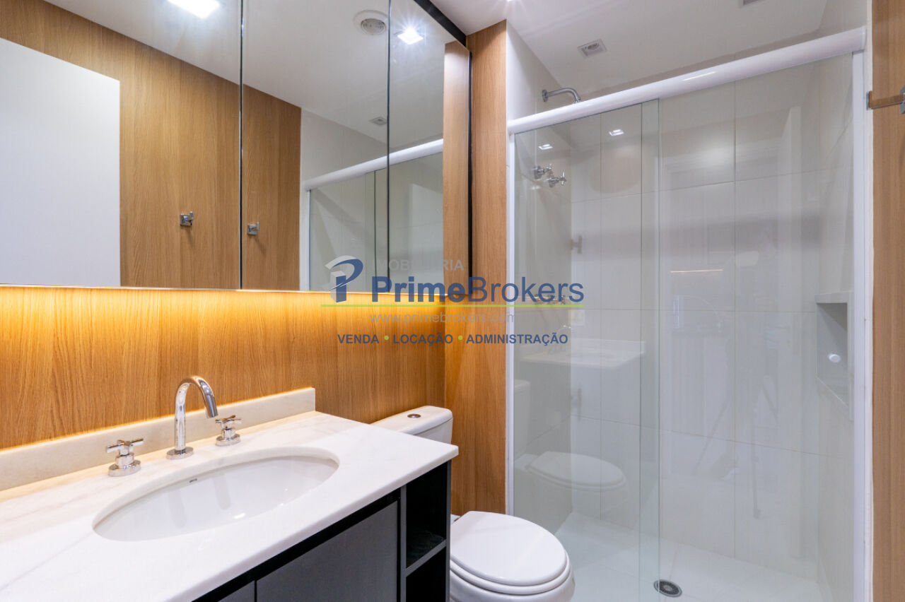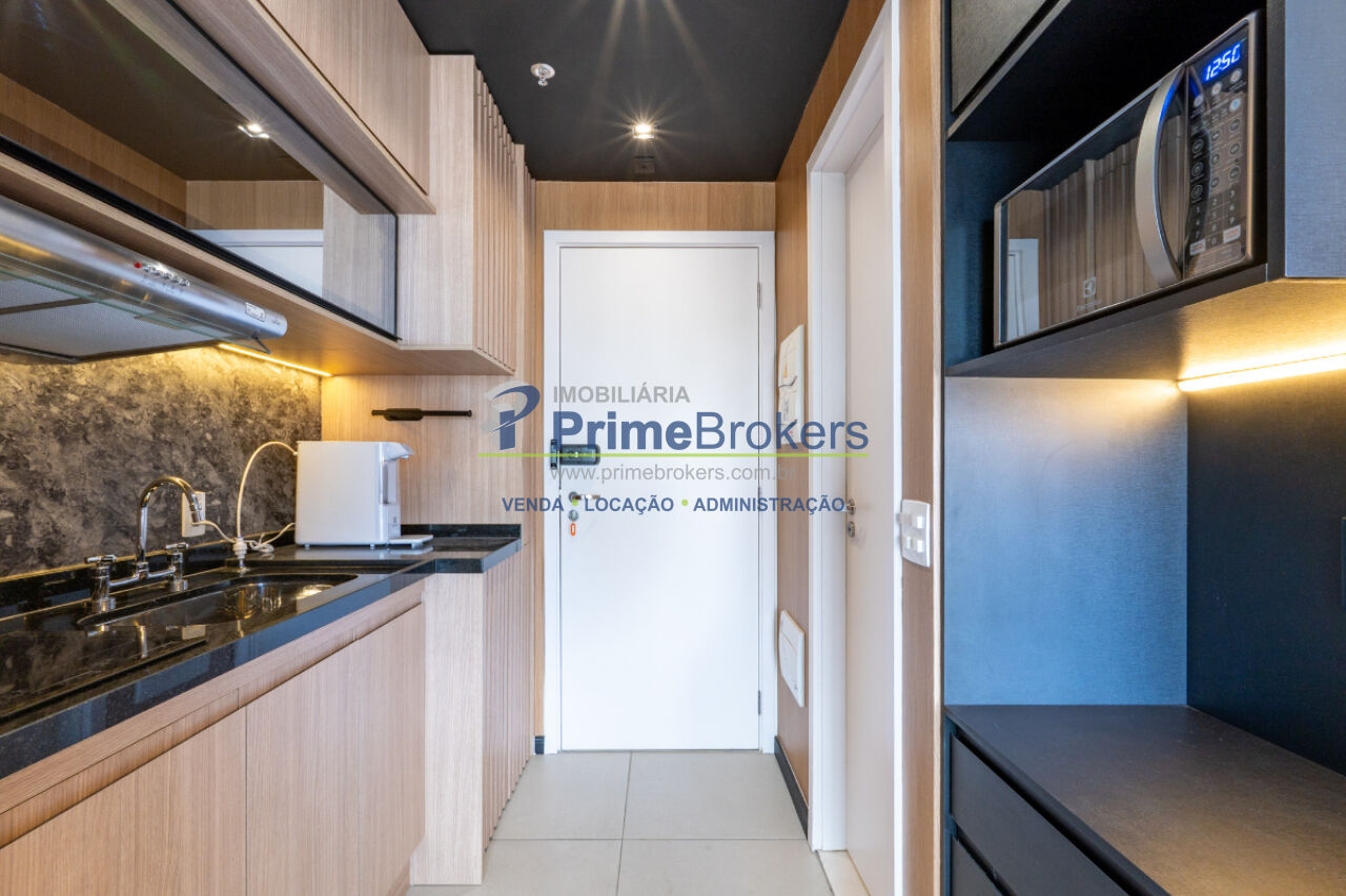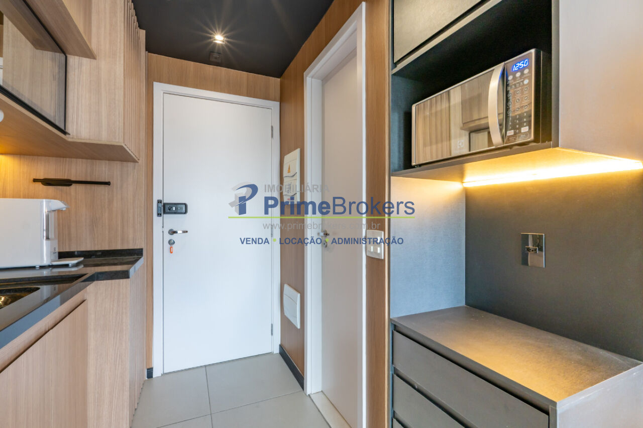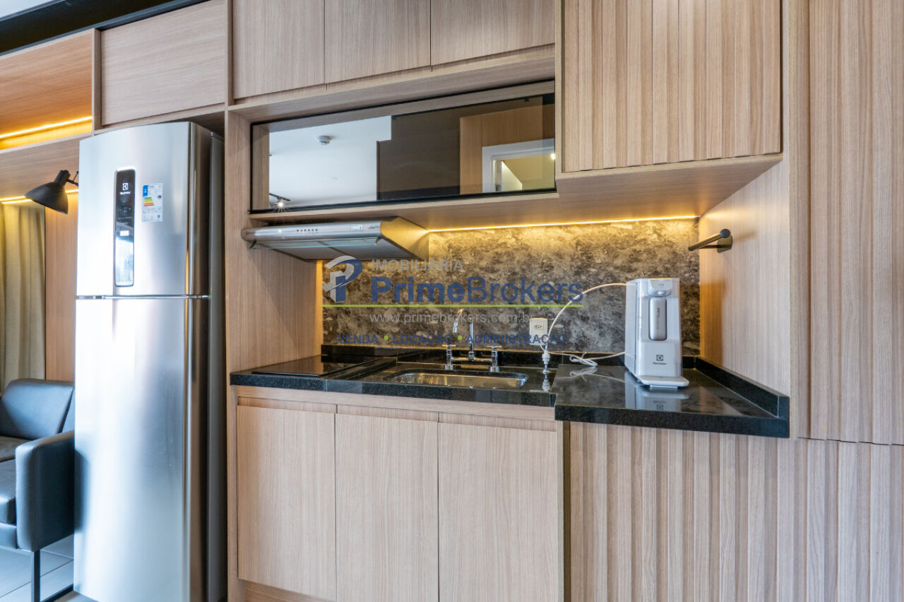 Studio totalmente mobiliado, varanda envidraçada, ar-condicionado instalado, armários embutidos, eletrodomésticos inclusos (geladeira, cooktop, micro-ondas, máquina lava e seca), acabamentos de alto padrão