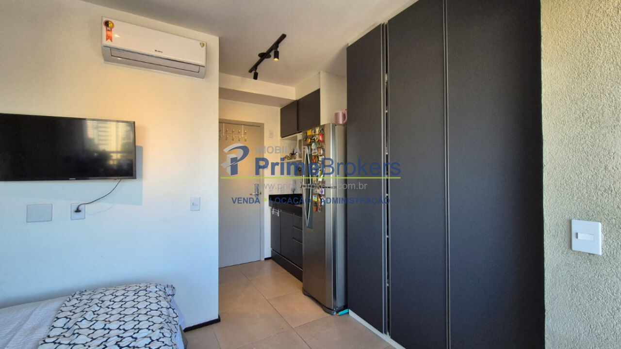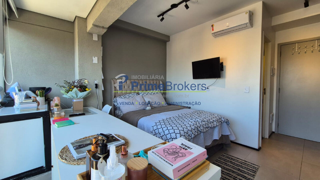 Studio, varanda integrada, armários embutidos, ar condicionado, piso porcelanato, banheiro com ventilação natural, aquecimento central, andar alto com sol da manhã