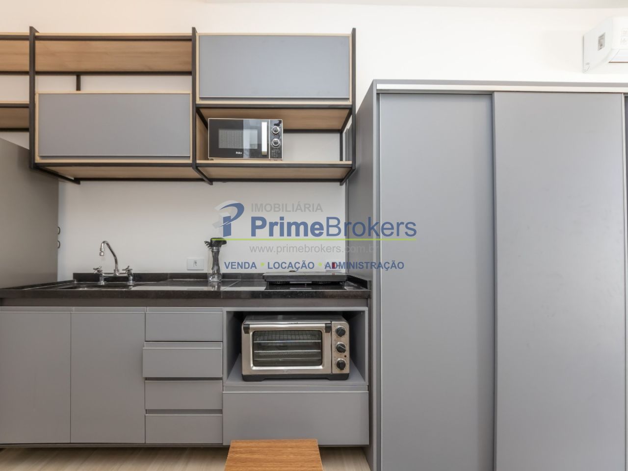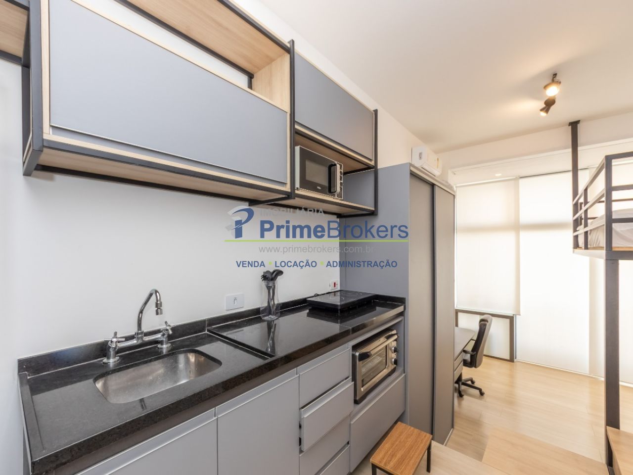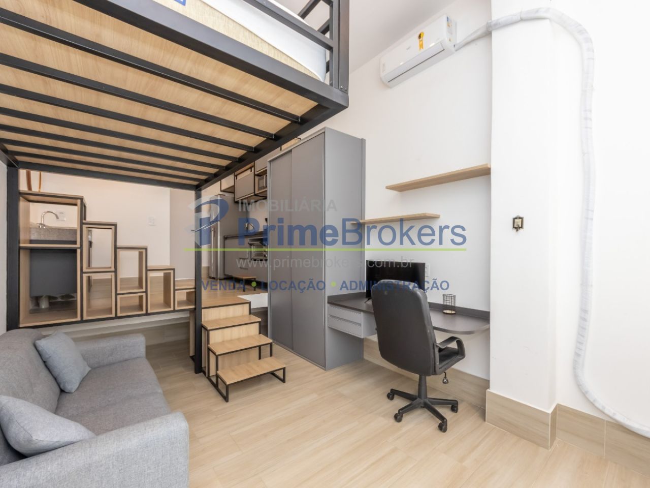 Studio 100% mobiliado, pé direito alto (+4m) com possibilidade de mezanino/cama suspensa, ar condicionado, armários planejados, cozinha, interfone